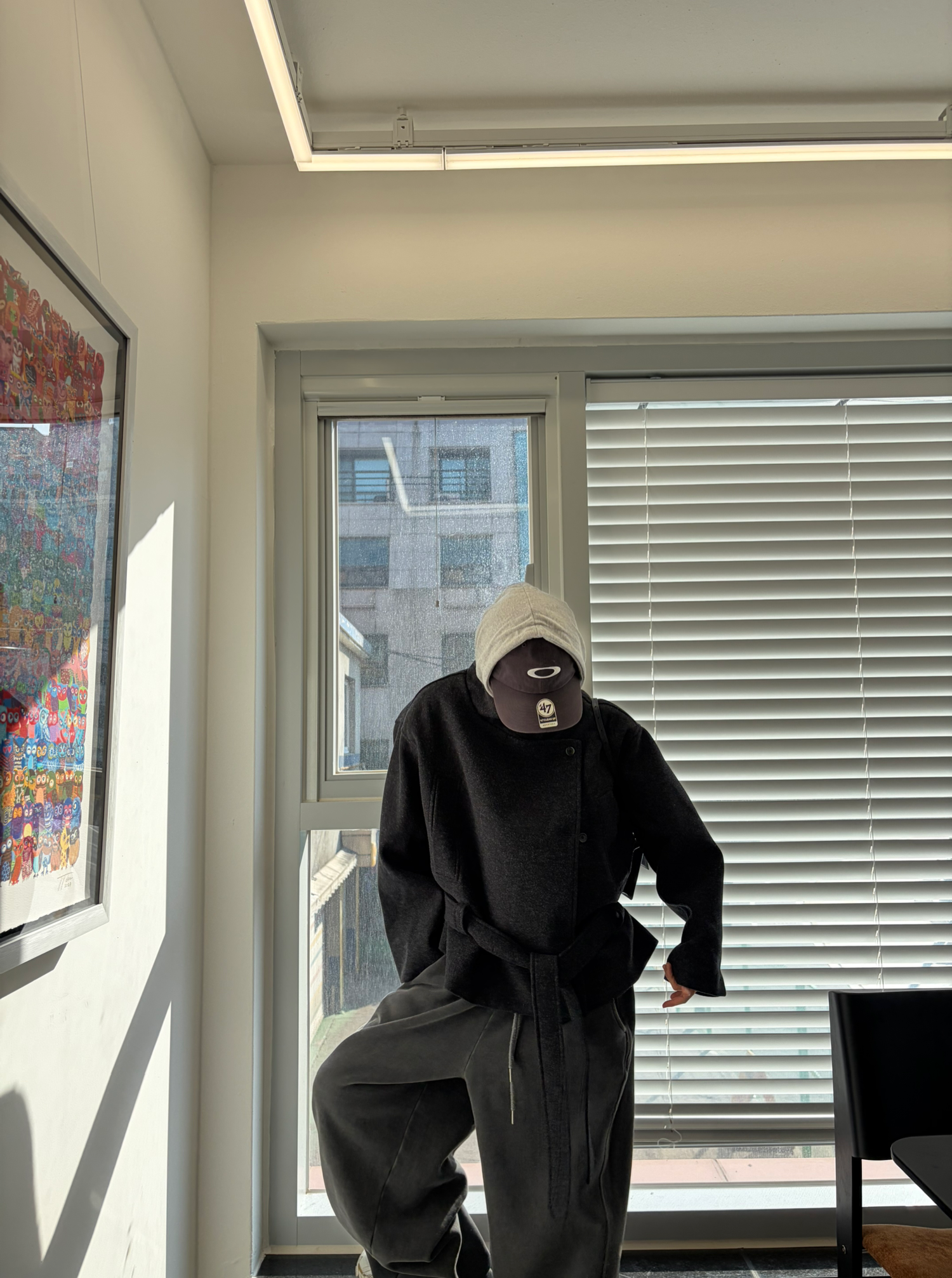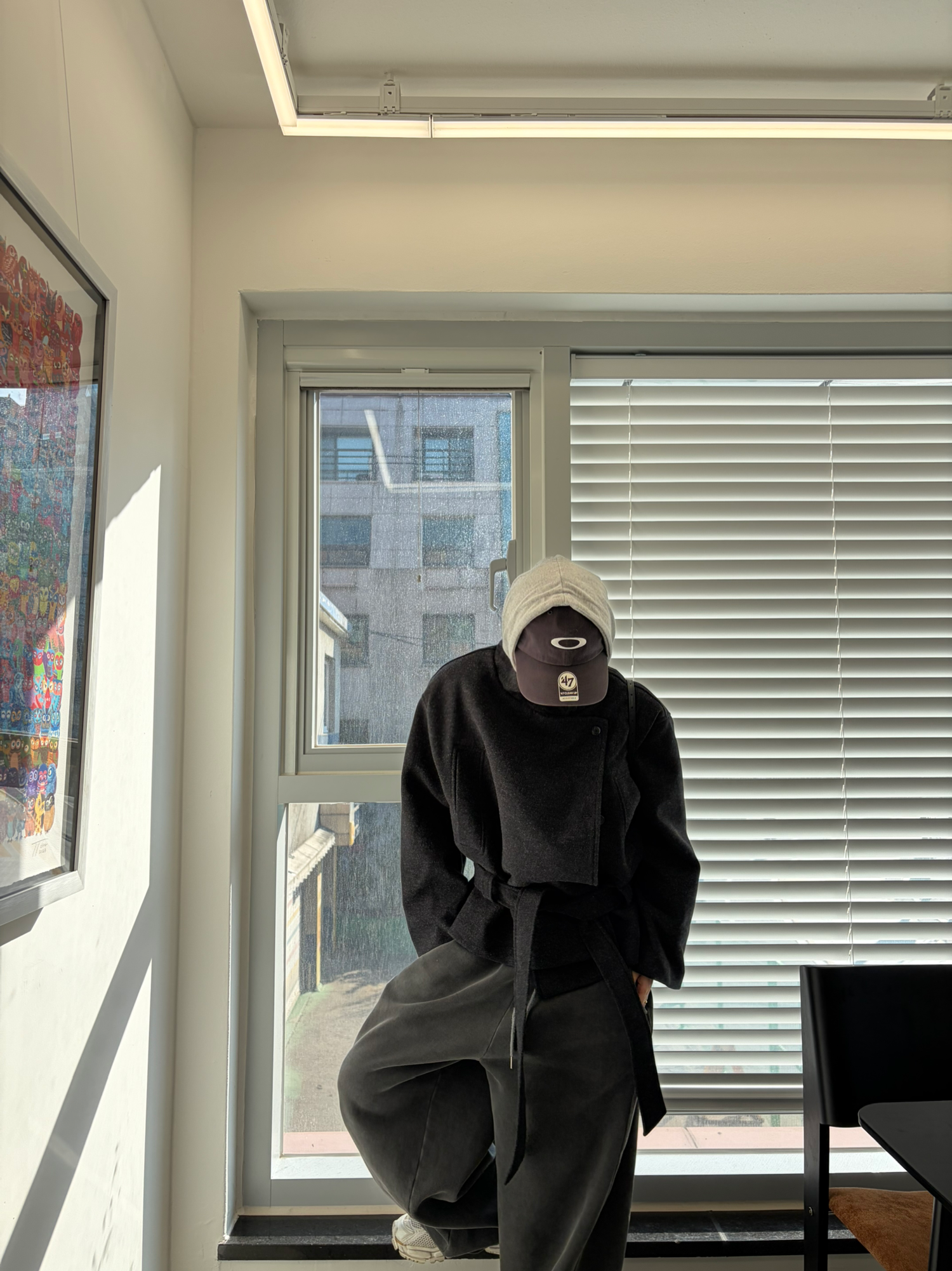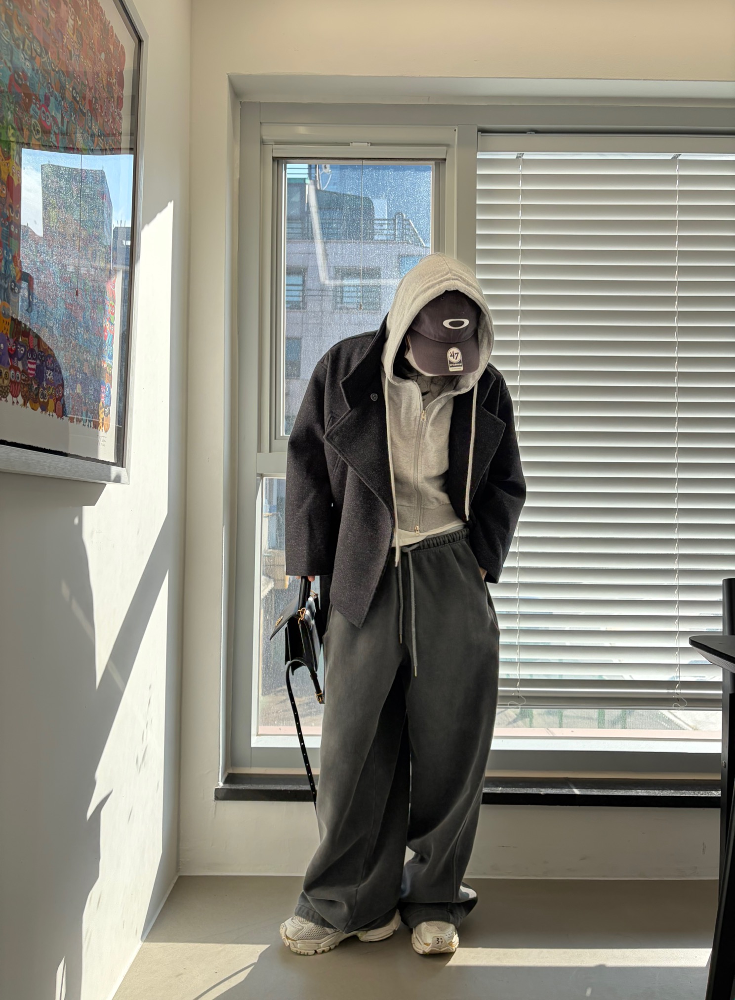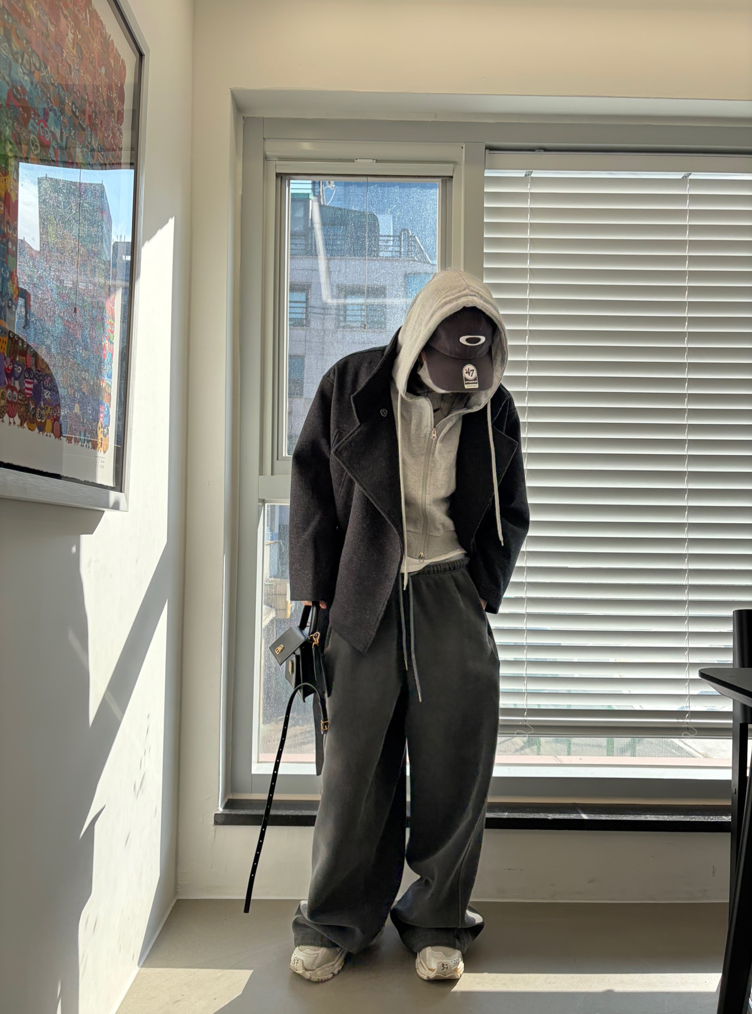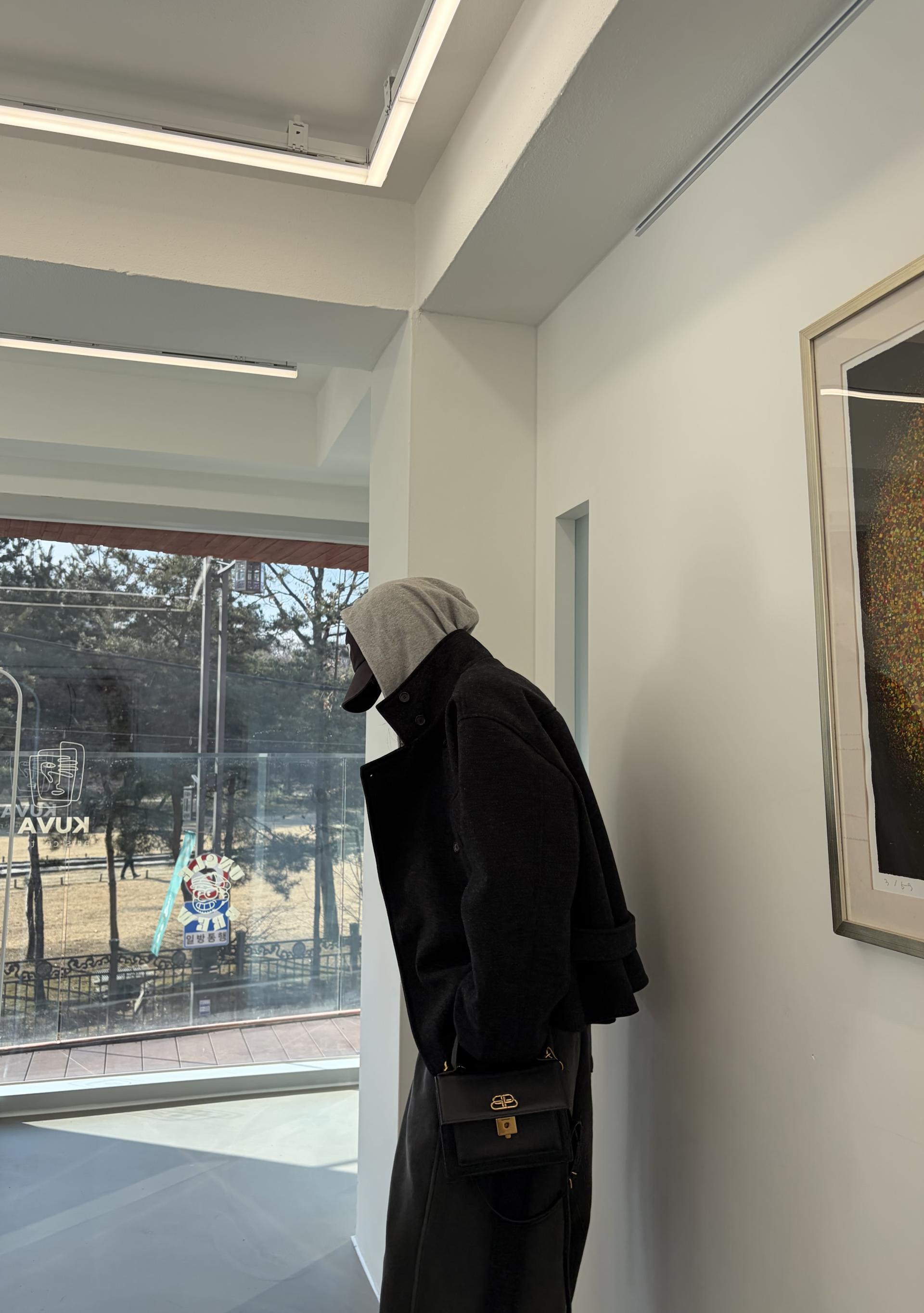 차분하게 떨어지는 하프 기장감과 힘있게 떨어지는 실루엣으로,