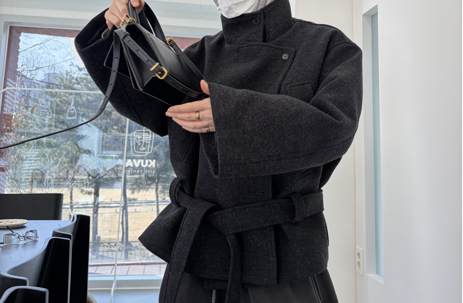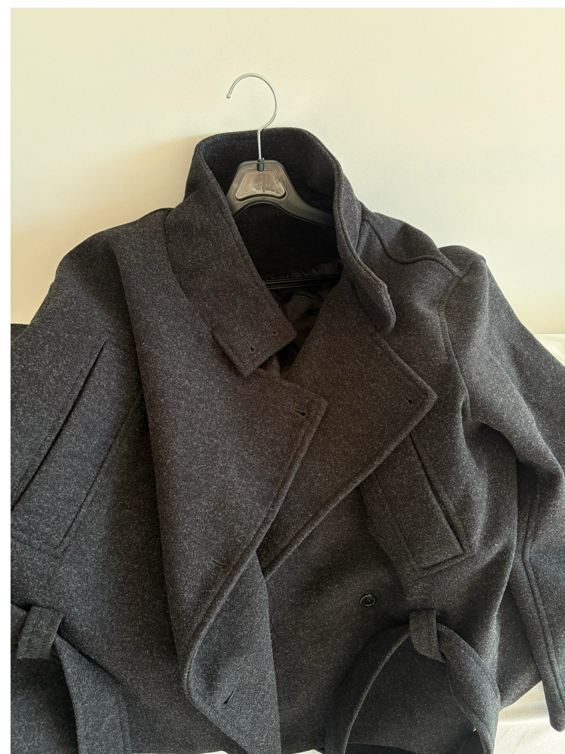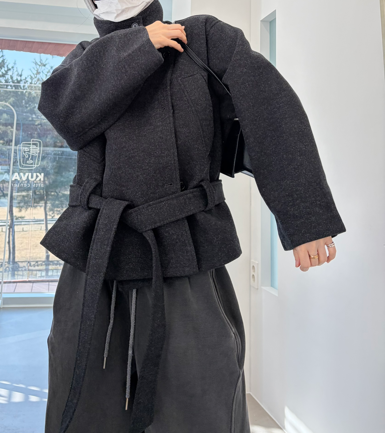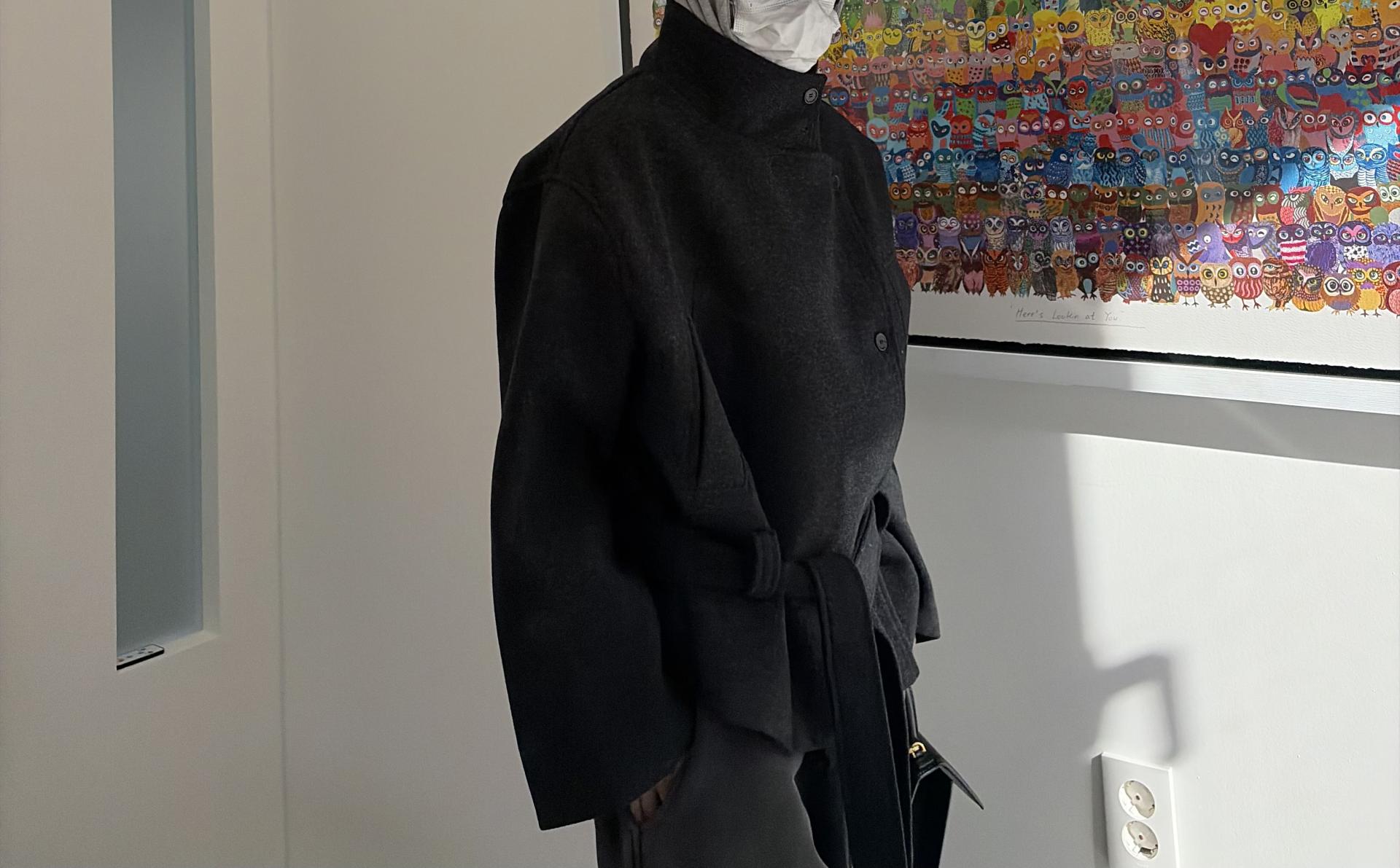 클래식한 무드에 감각적인 버튼 디테일이 더해진 울 혼방 벨트 하프 코트입니다.