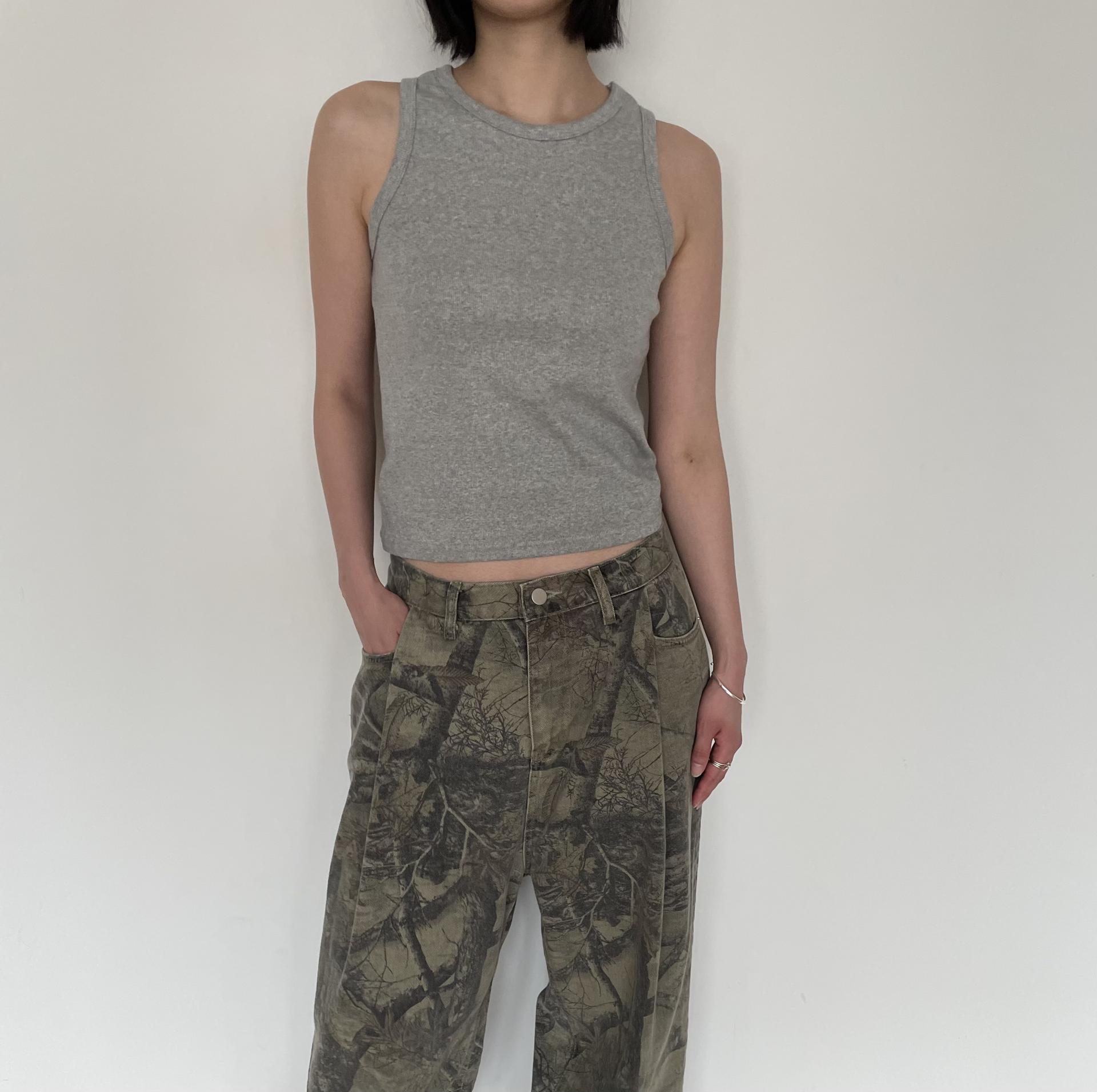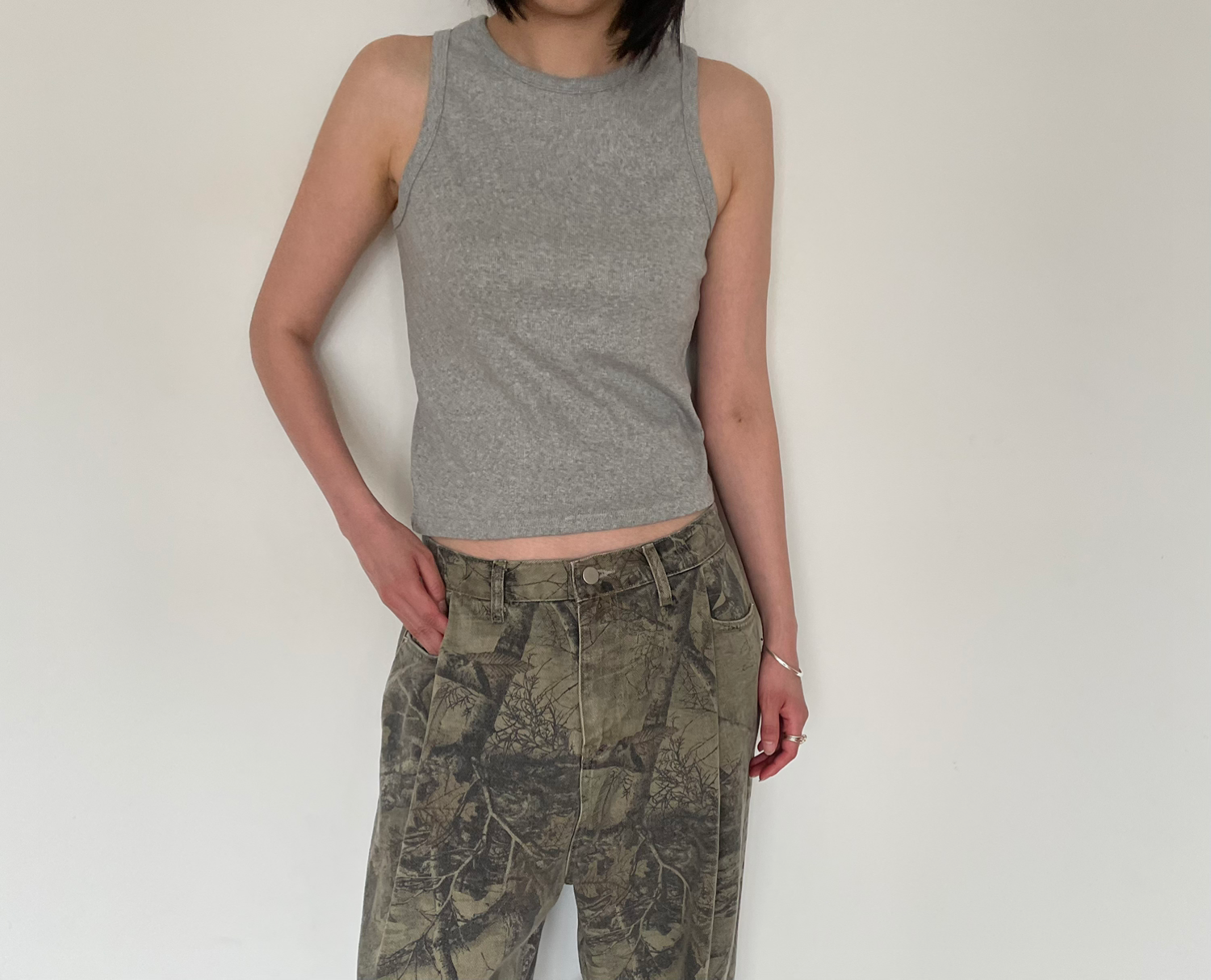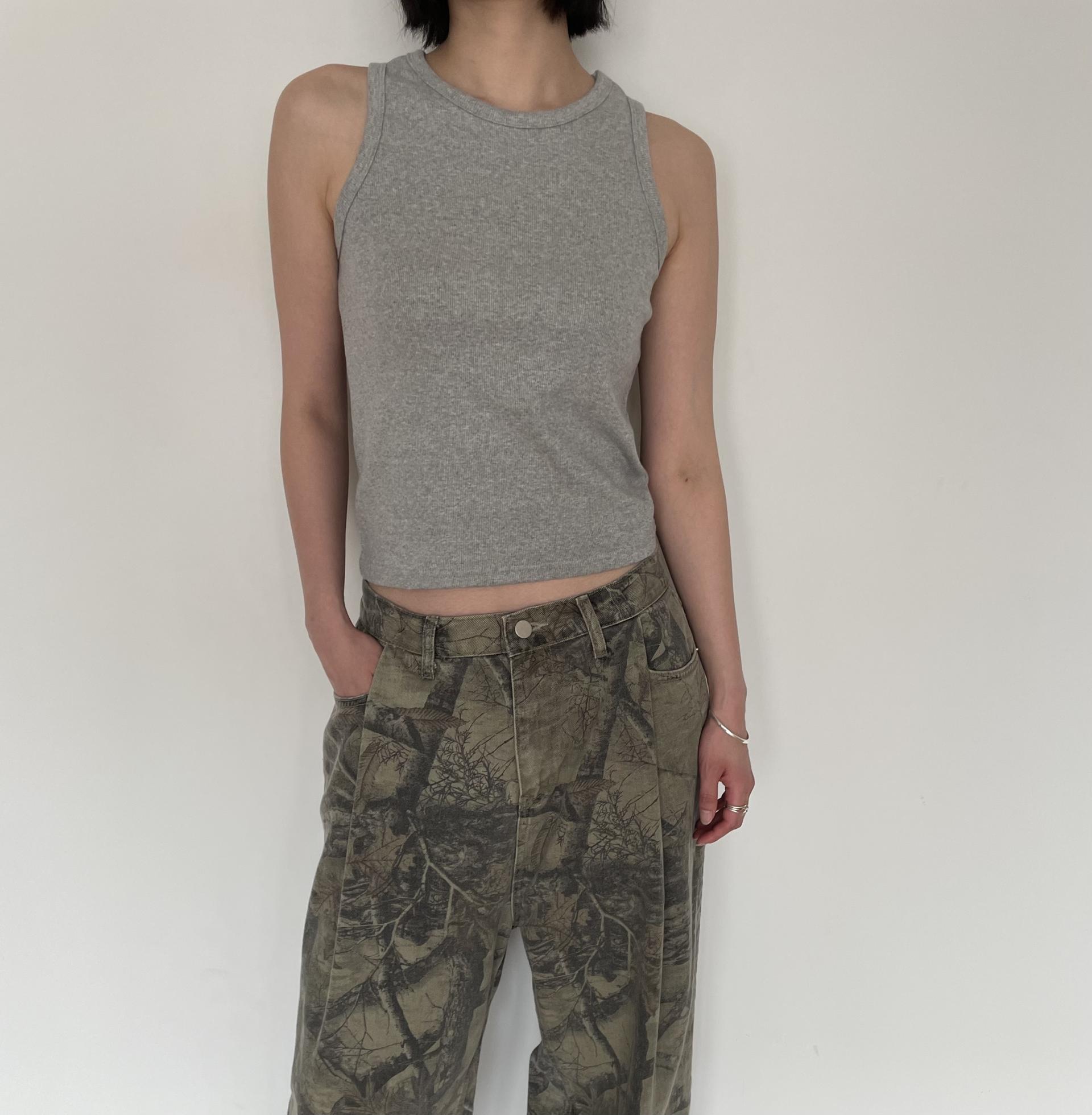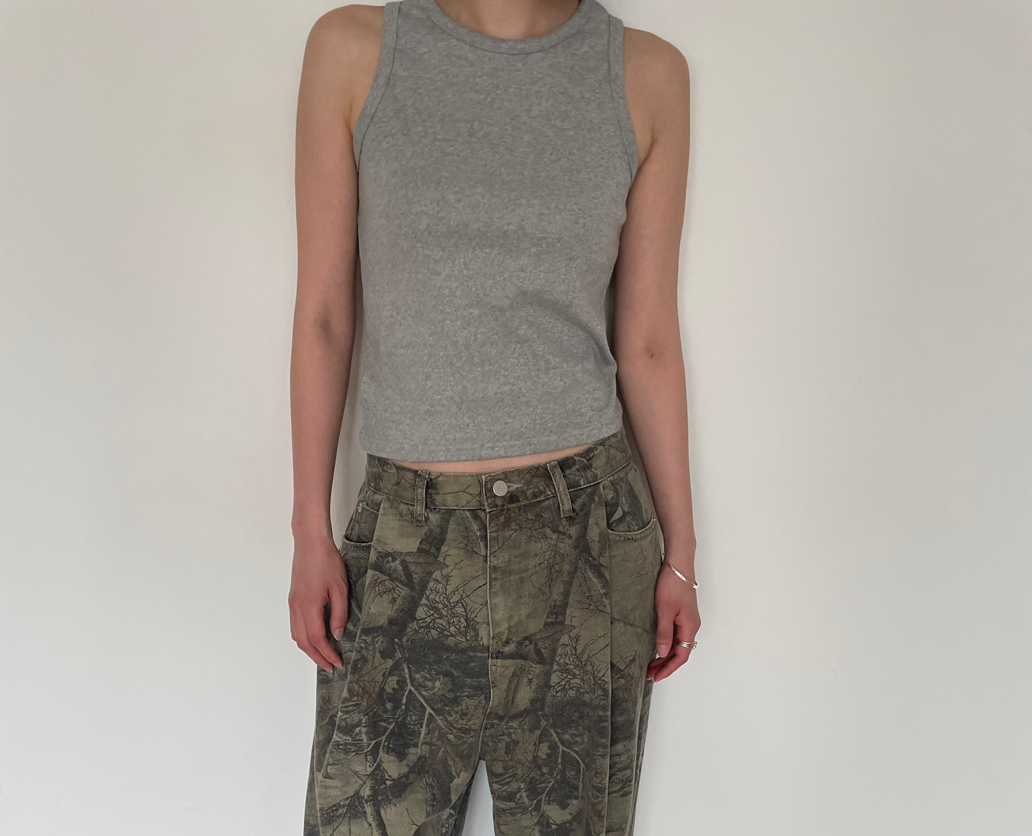 골지 특유의 세로결 짜임이 몸을 더 슬림하게 보이도록 연출해 주고, 밑단도 너무 길지 않아 하이웨이스트 팬츠나 스커트와 매치하기 좋습니다.