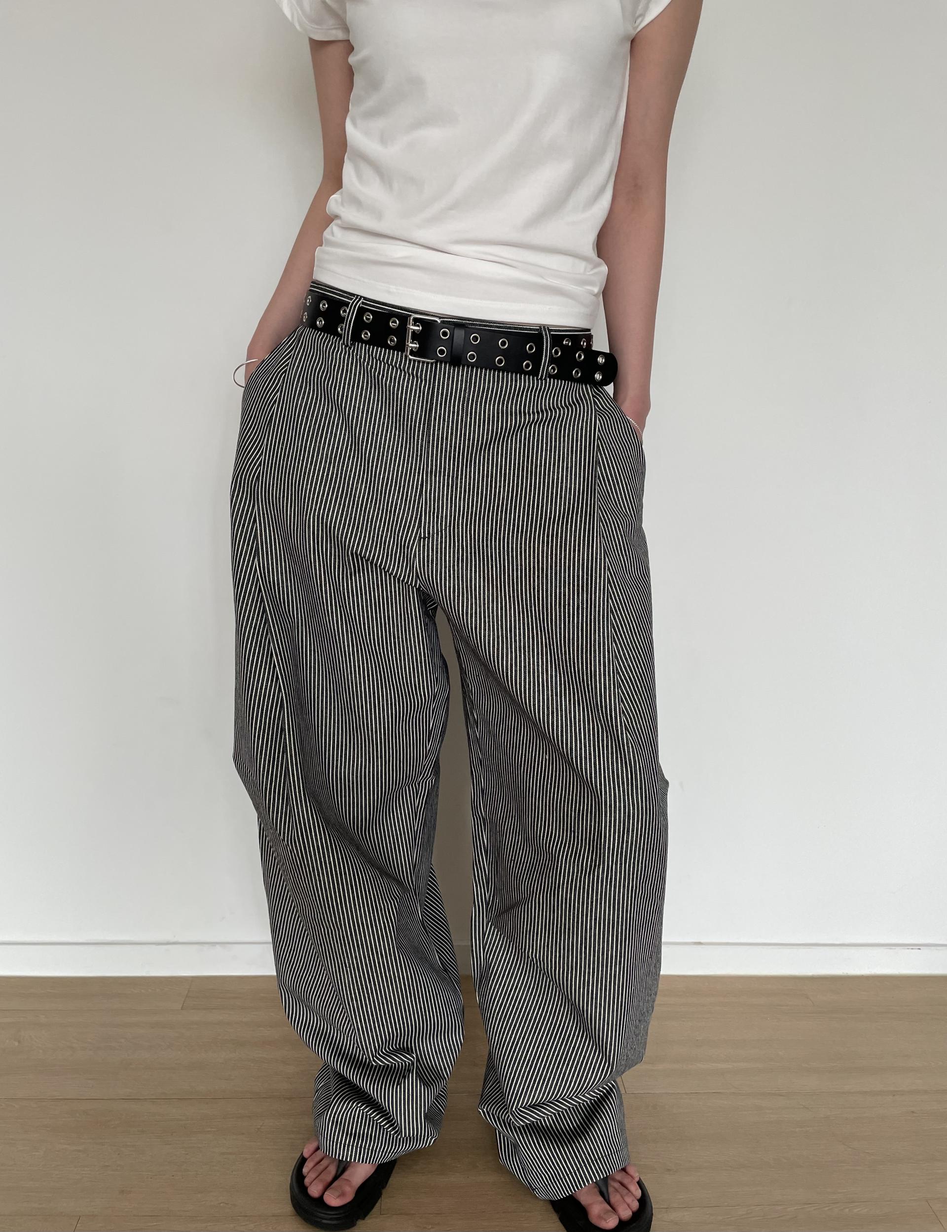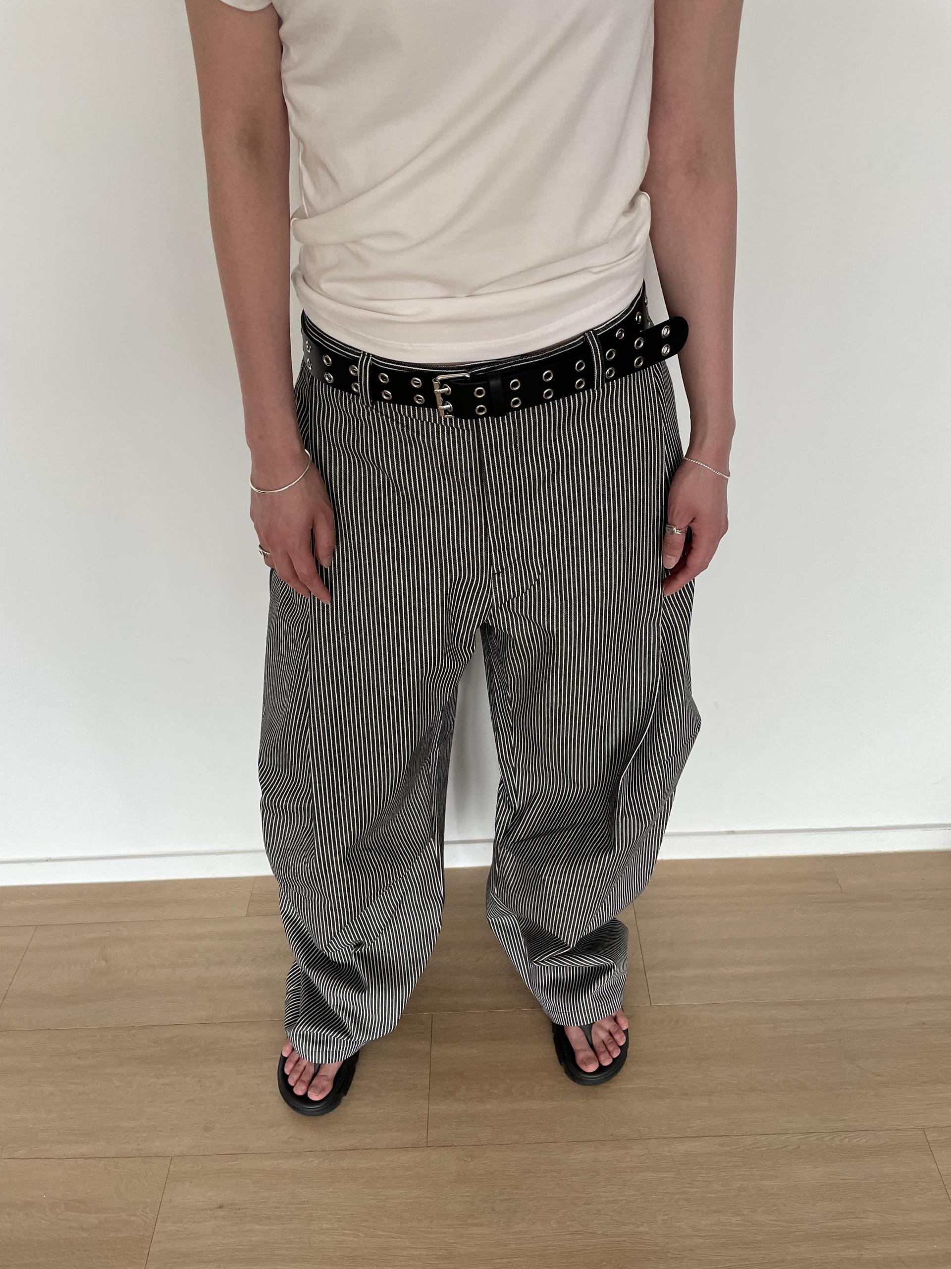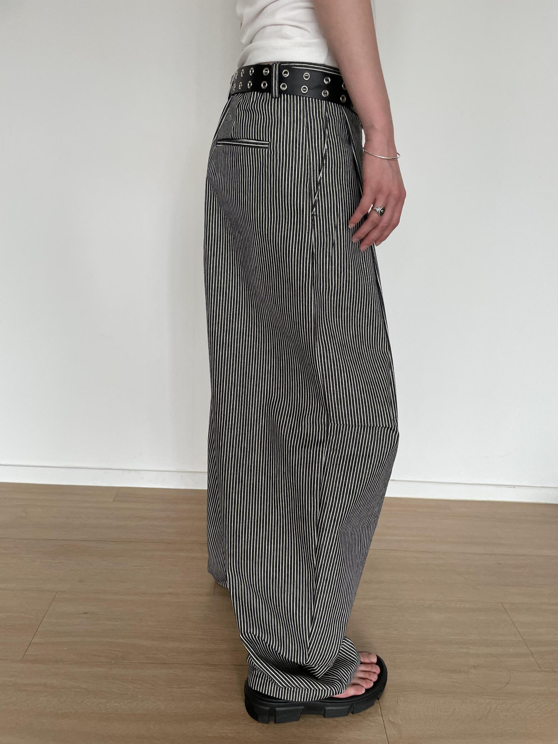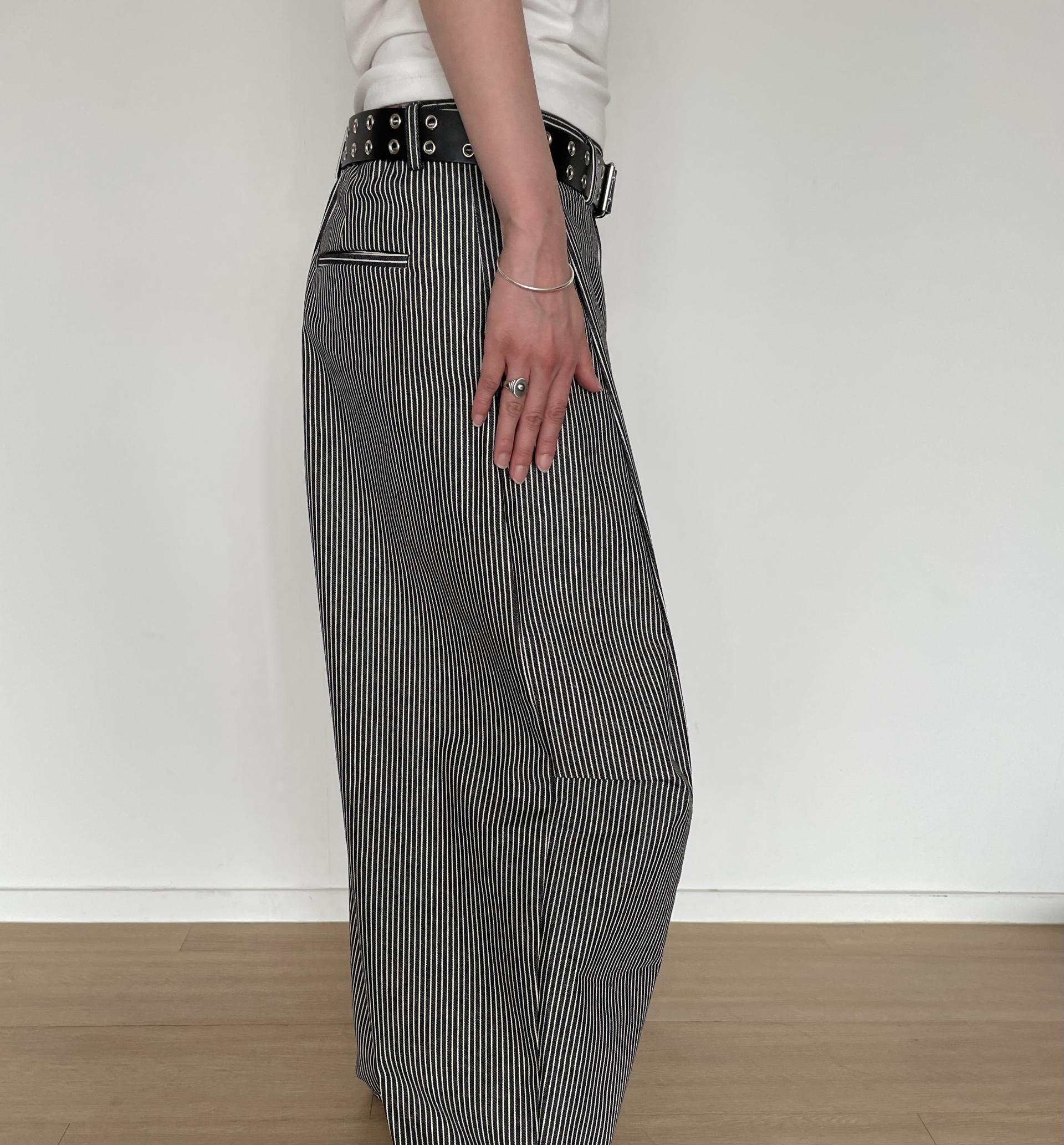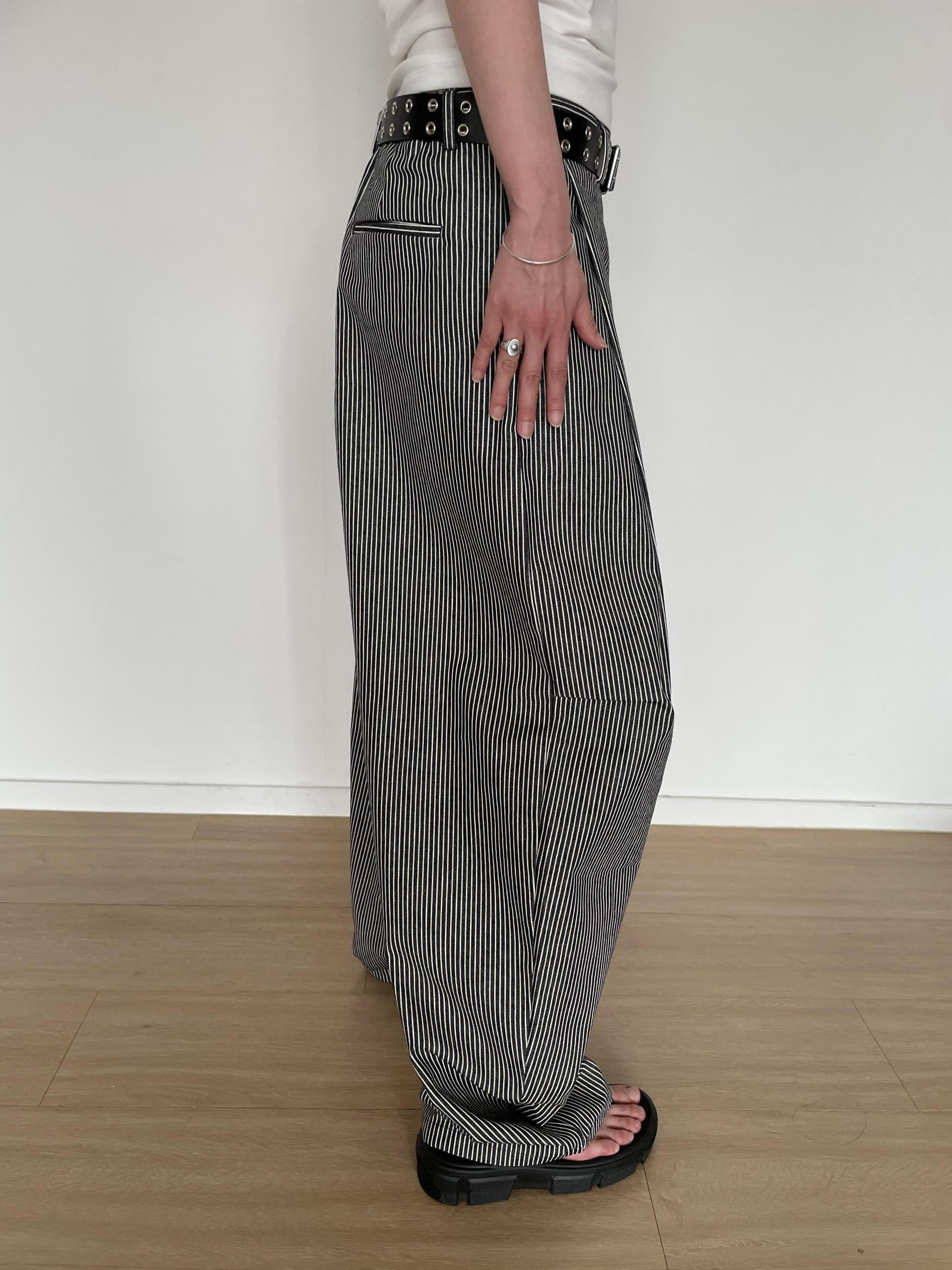 캐주얼하면서도 구조적인 멋이 돋보이는 와이드 스트라이프 팬츠입니다.