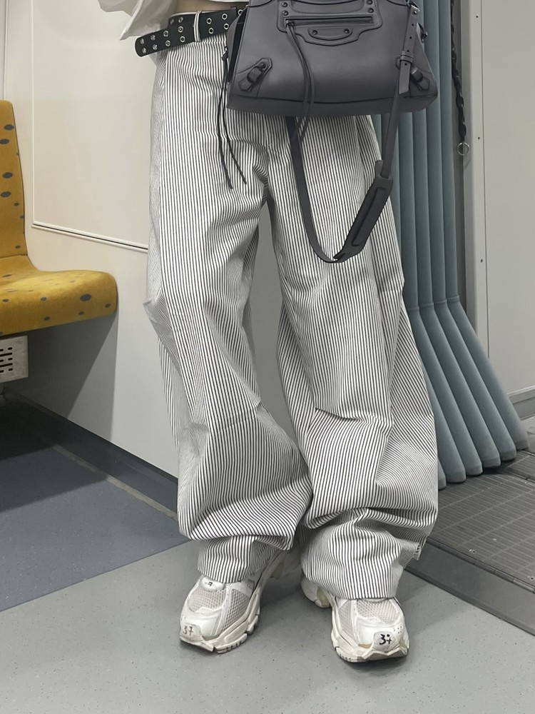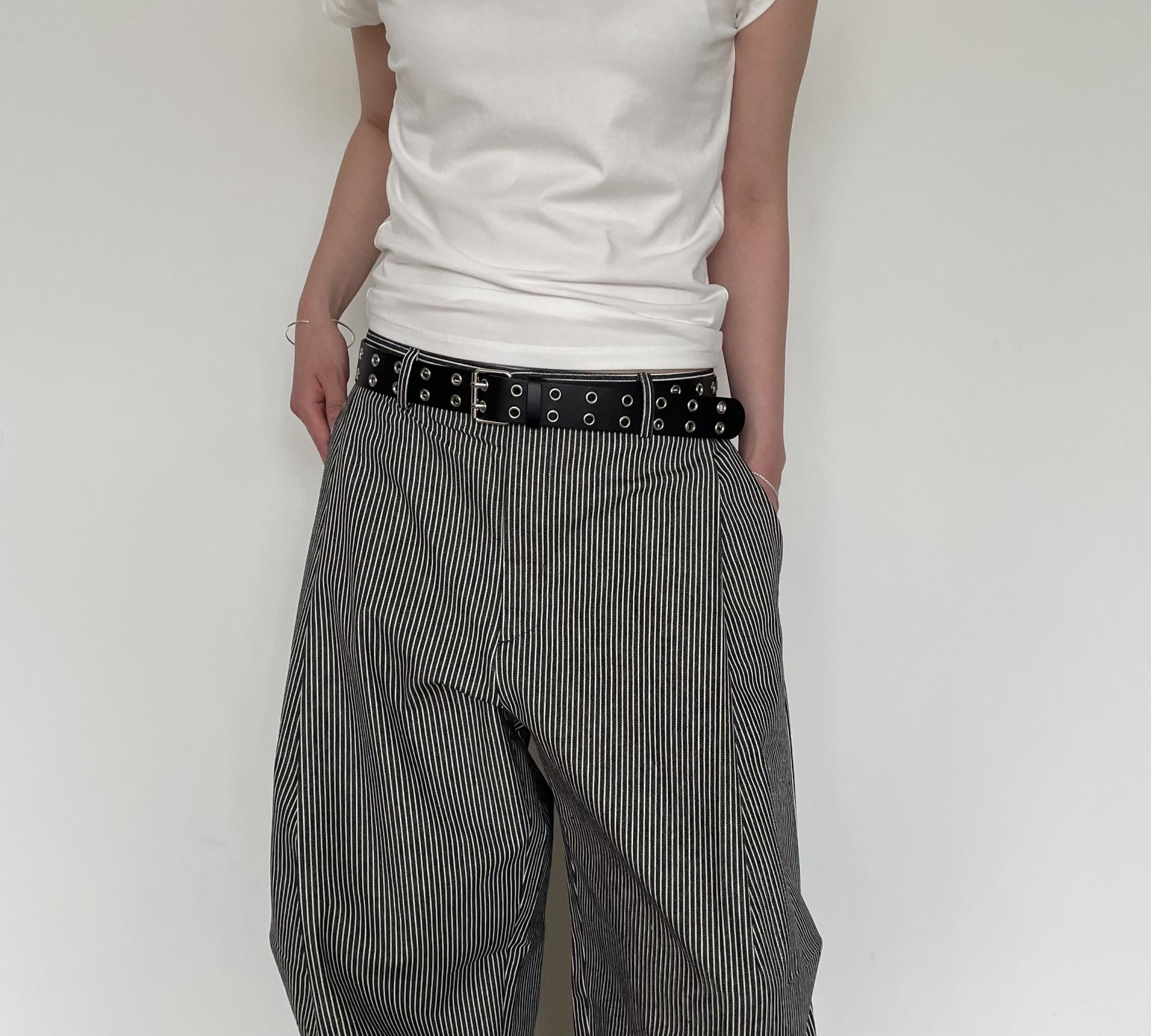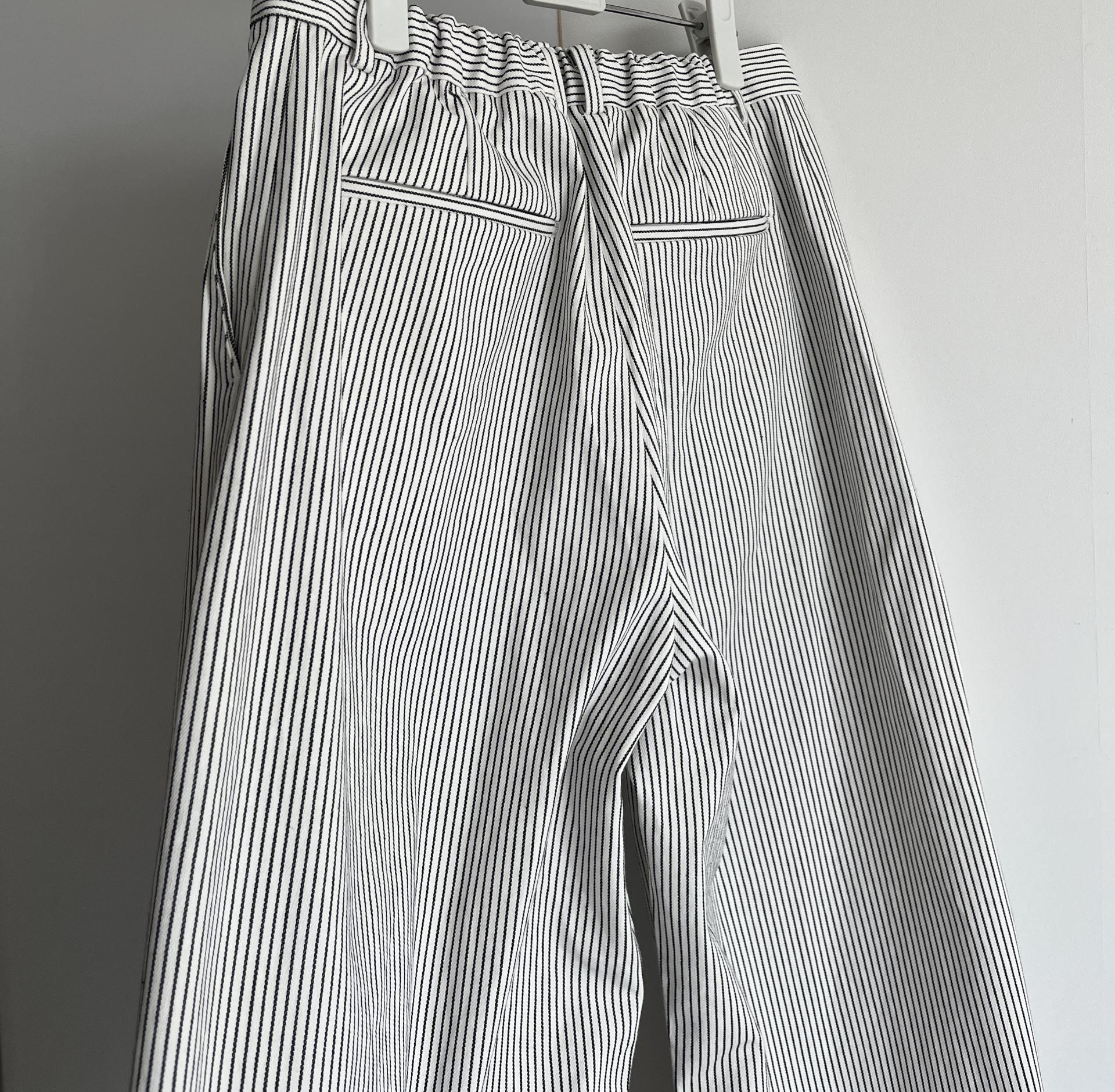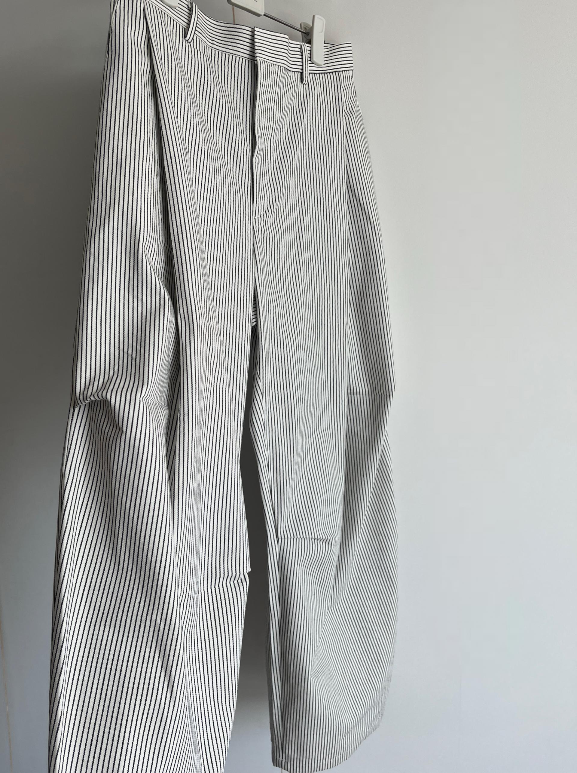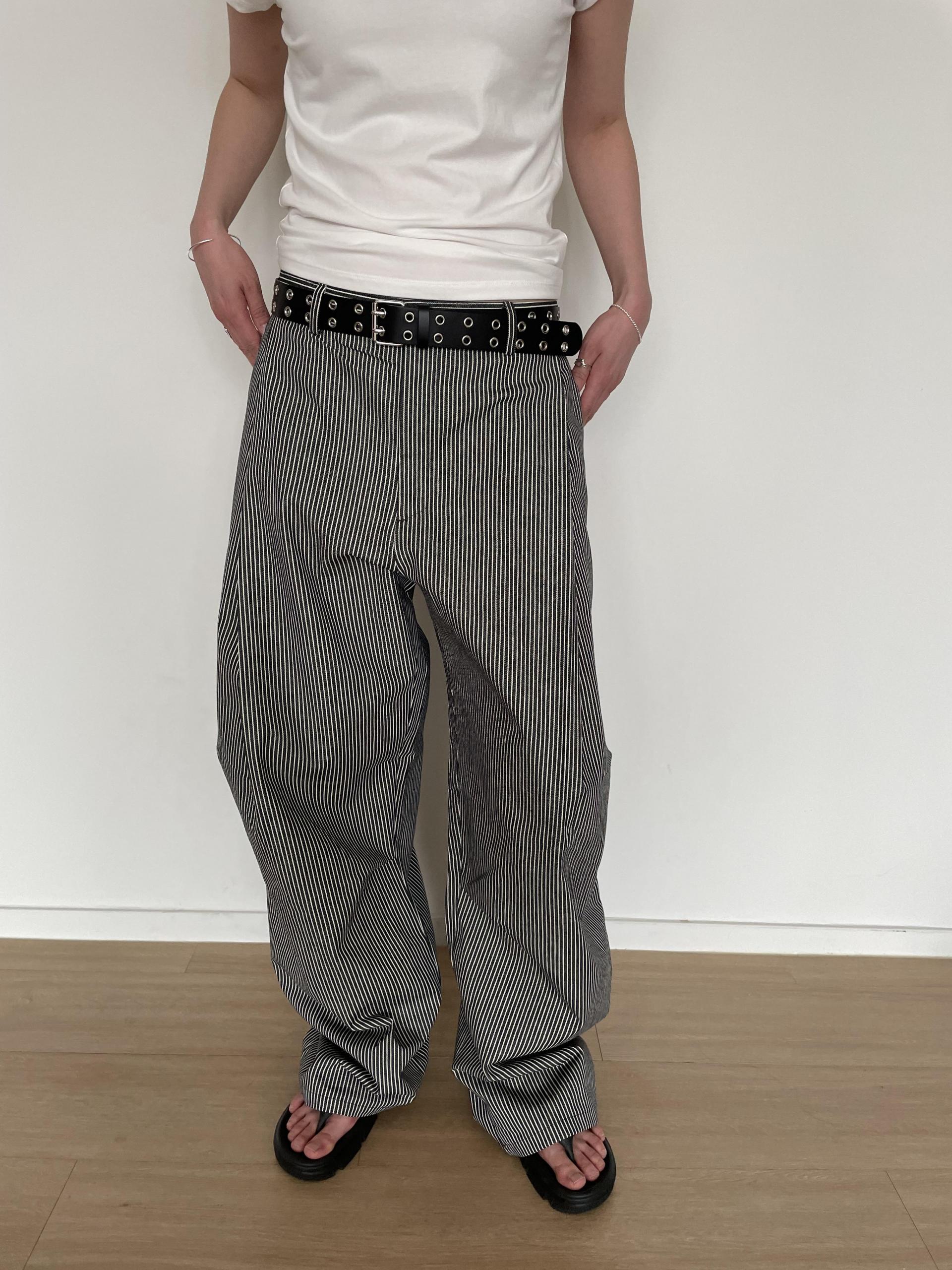 캐주얼하면서도 구조적인 멋이 돋보이는 와이드 스트라이프 팬츠입니다.