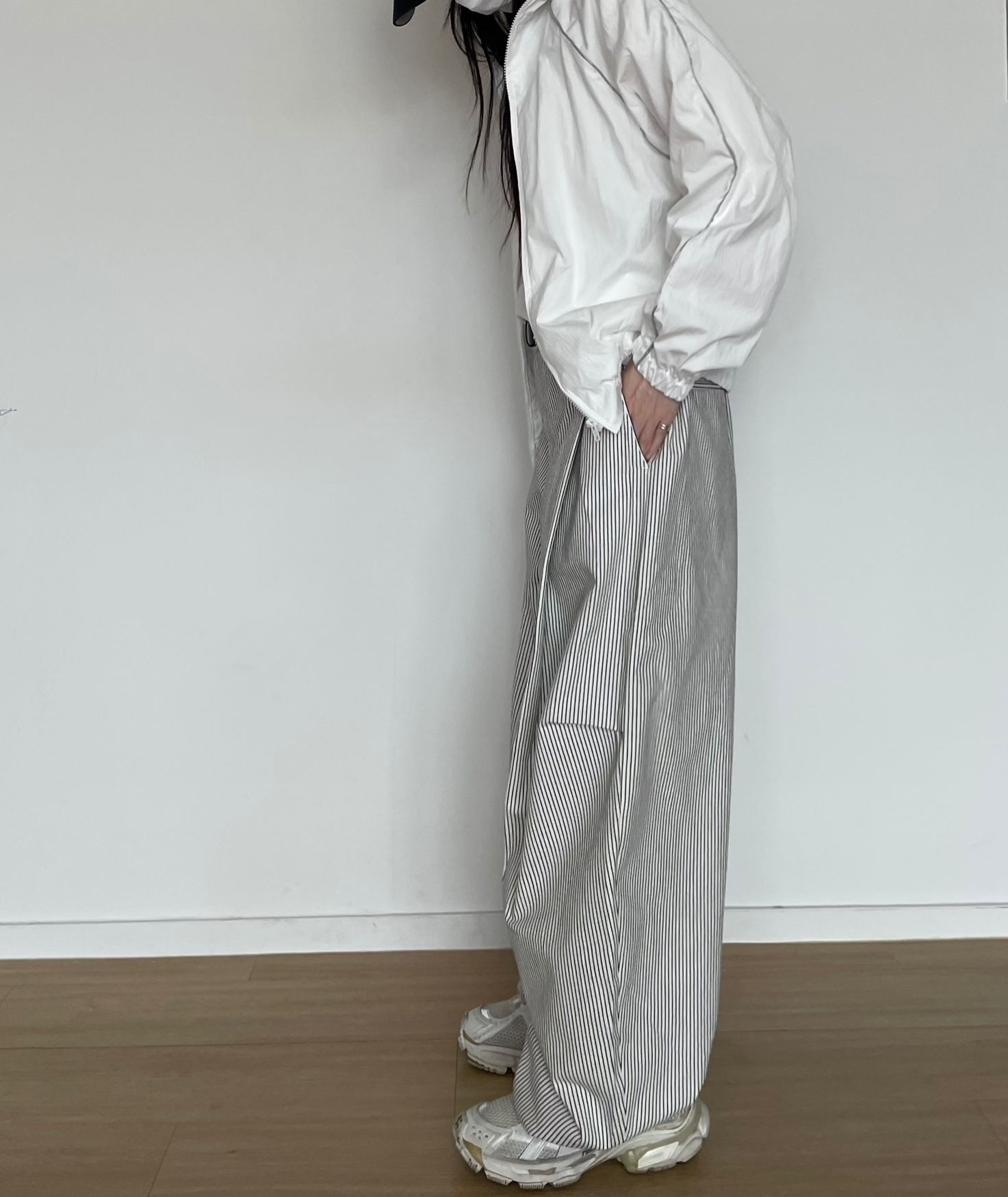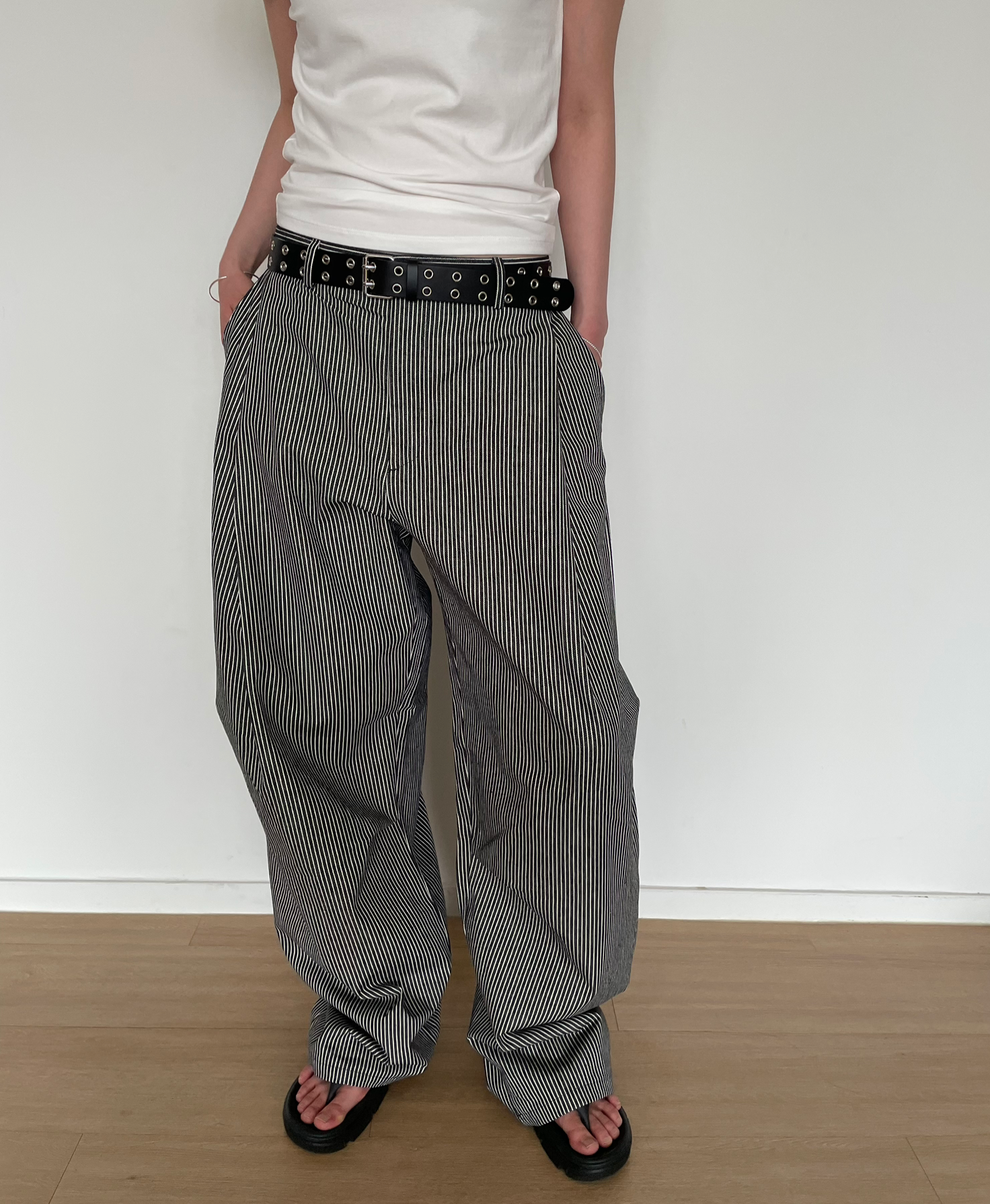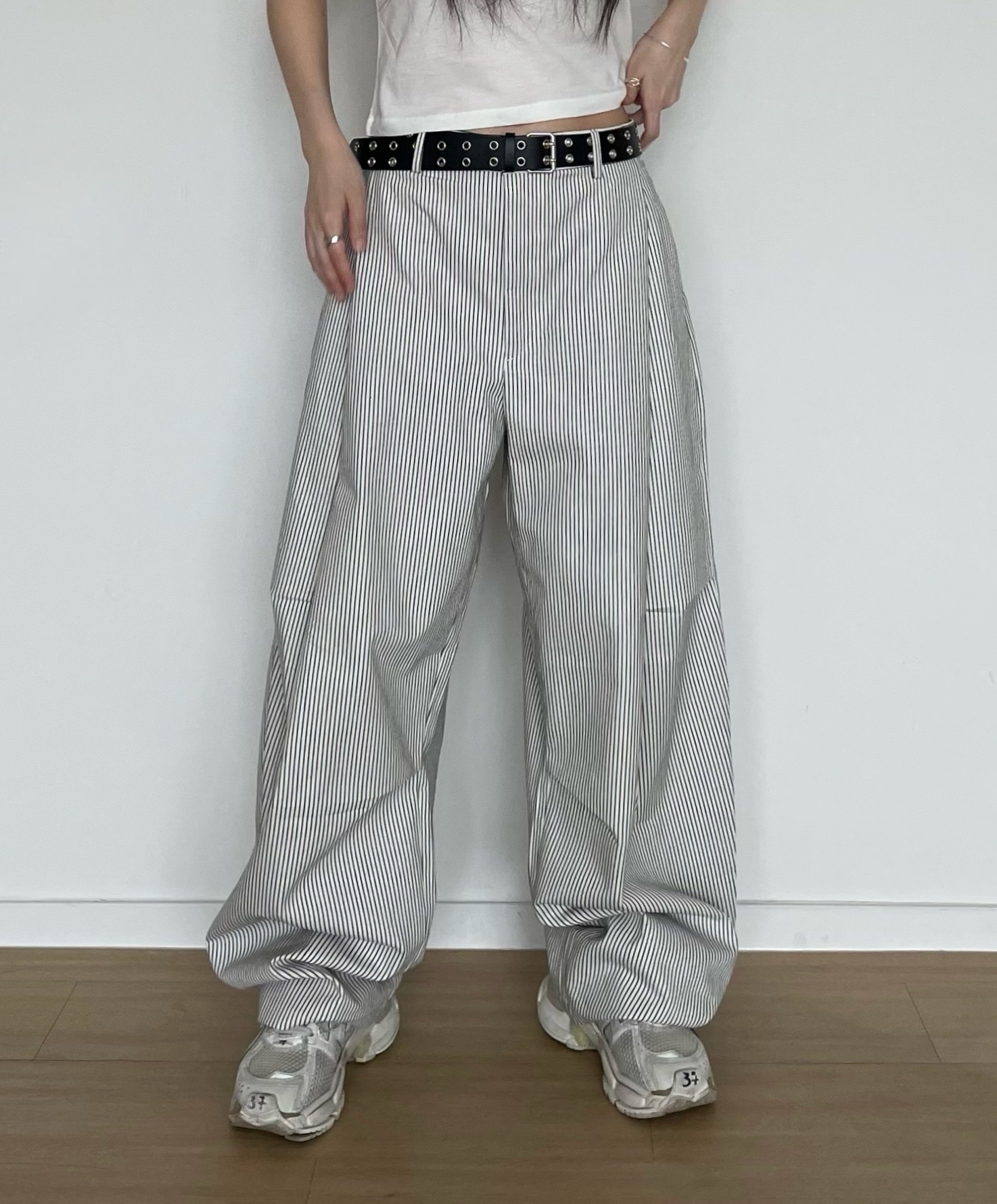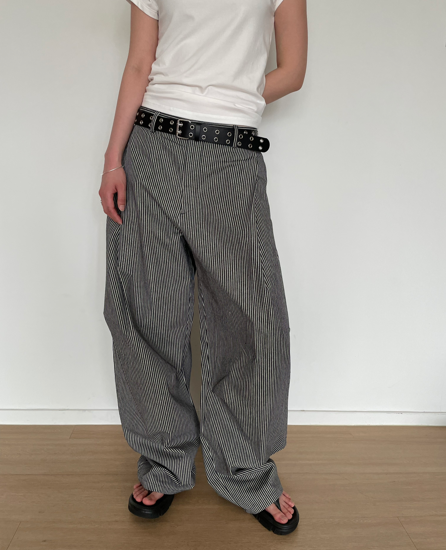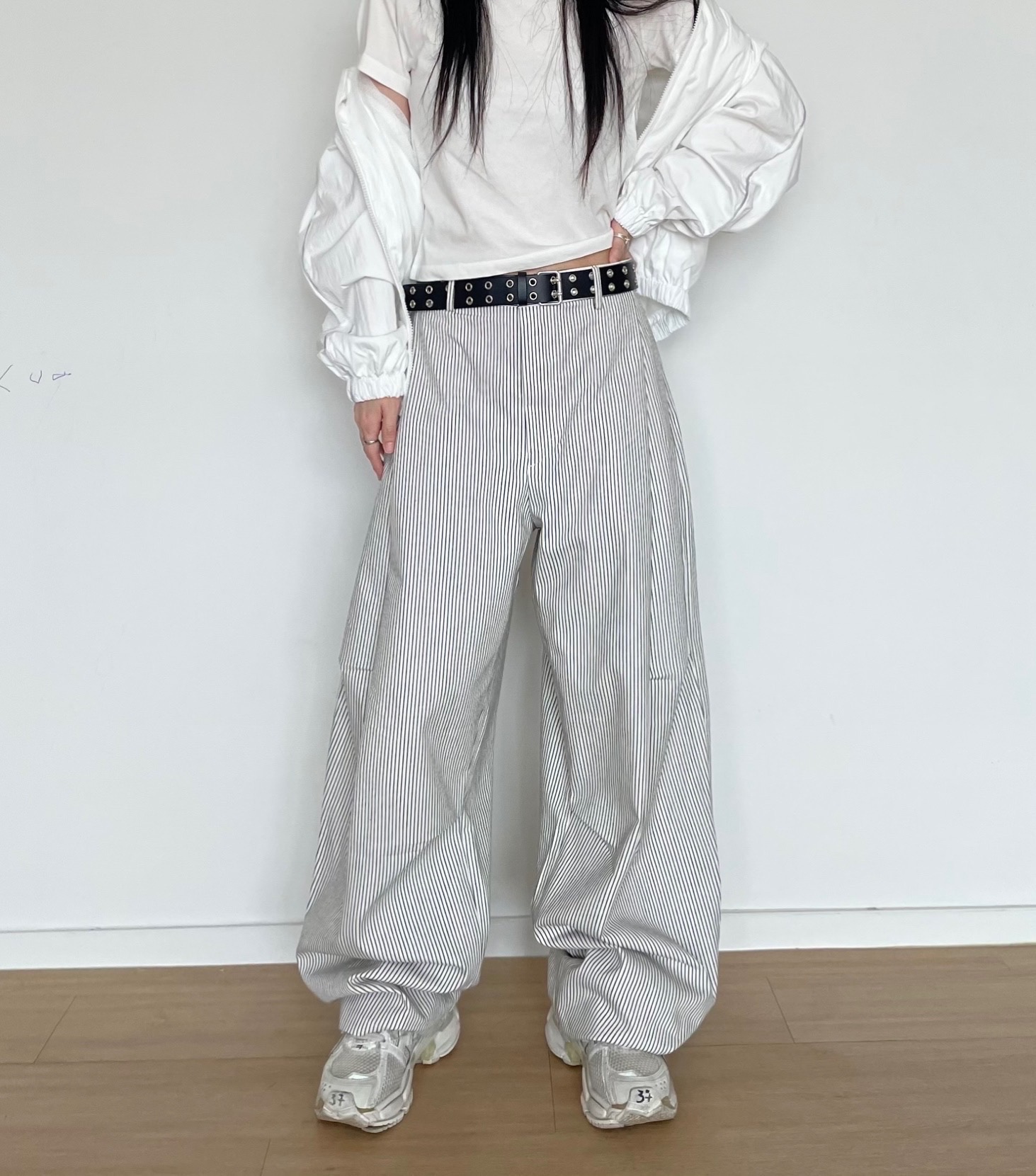 캐주얼하면서도 구조적인 멋이 돋보이는 와이드 스트라이프 팬츠입니다.