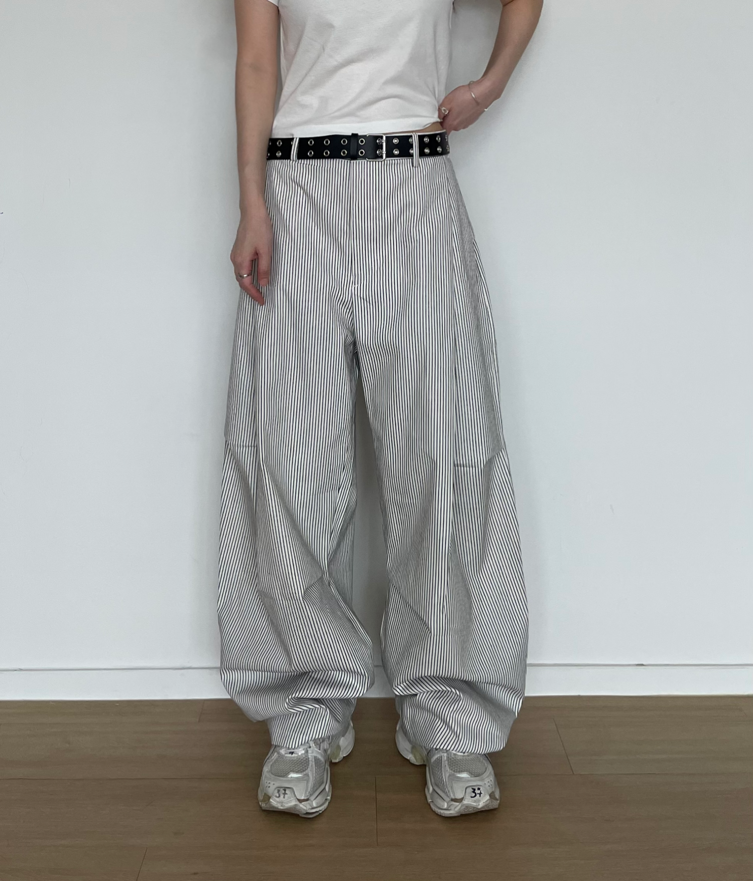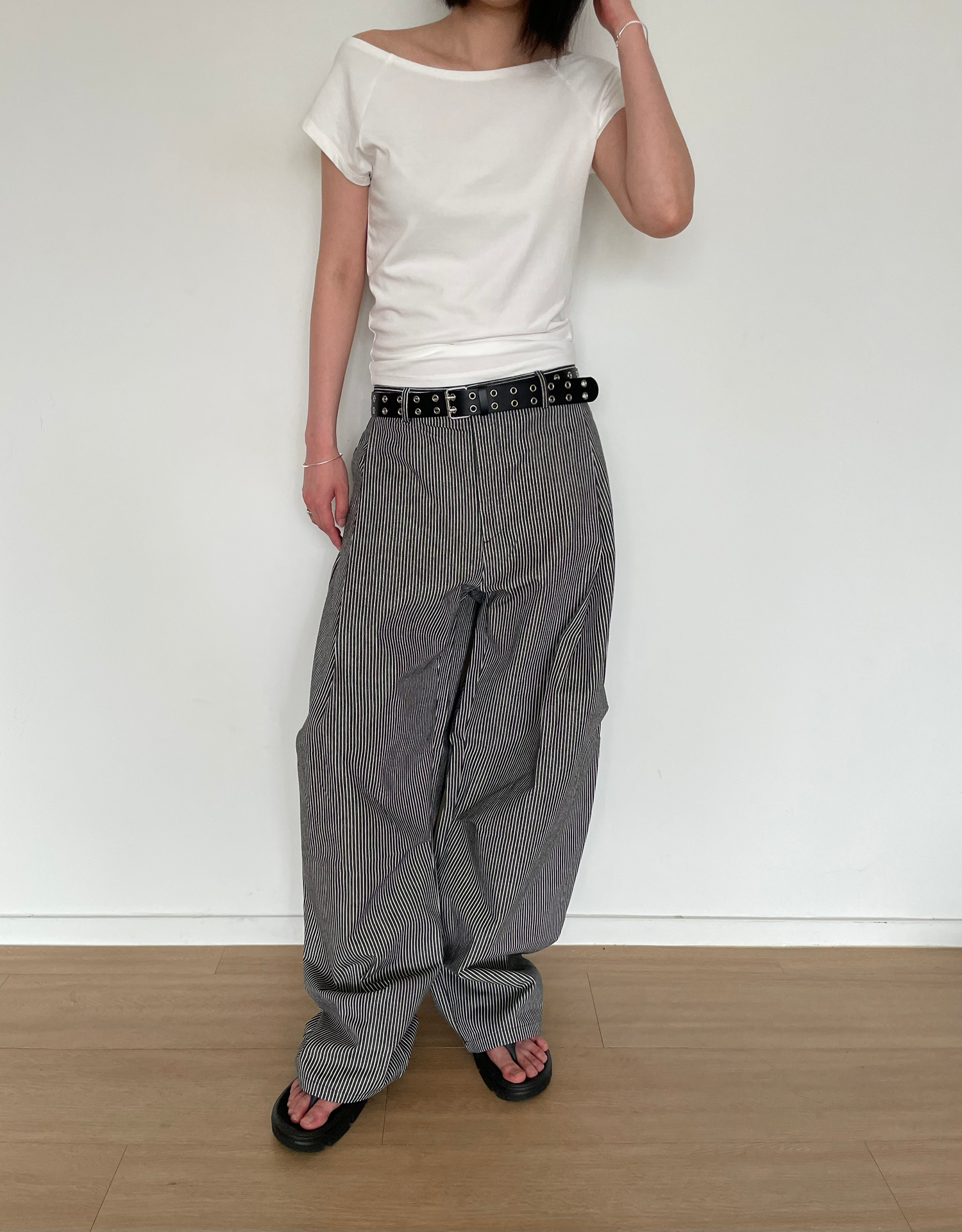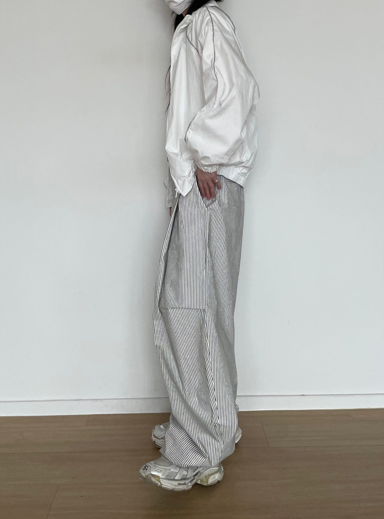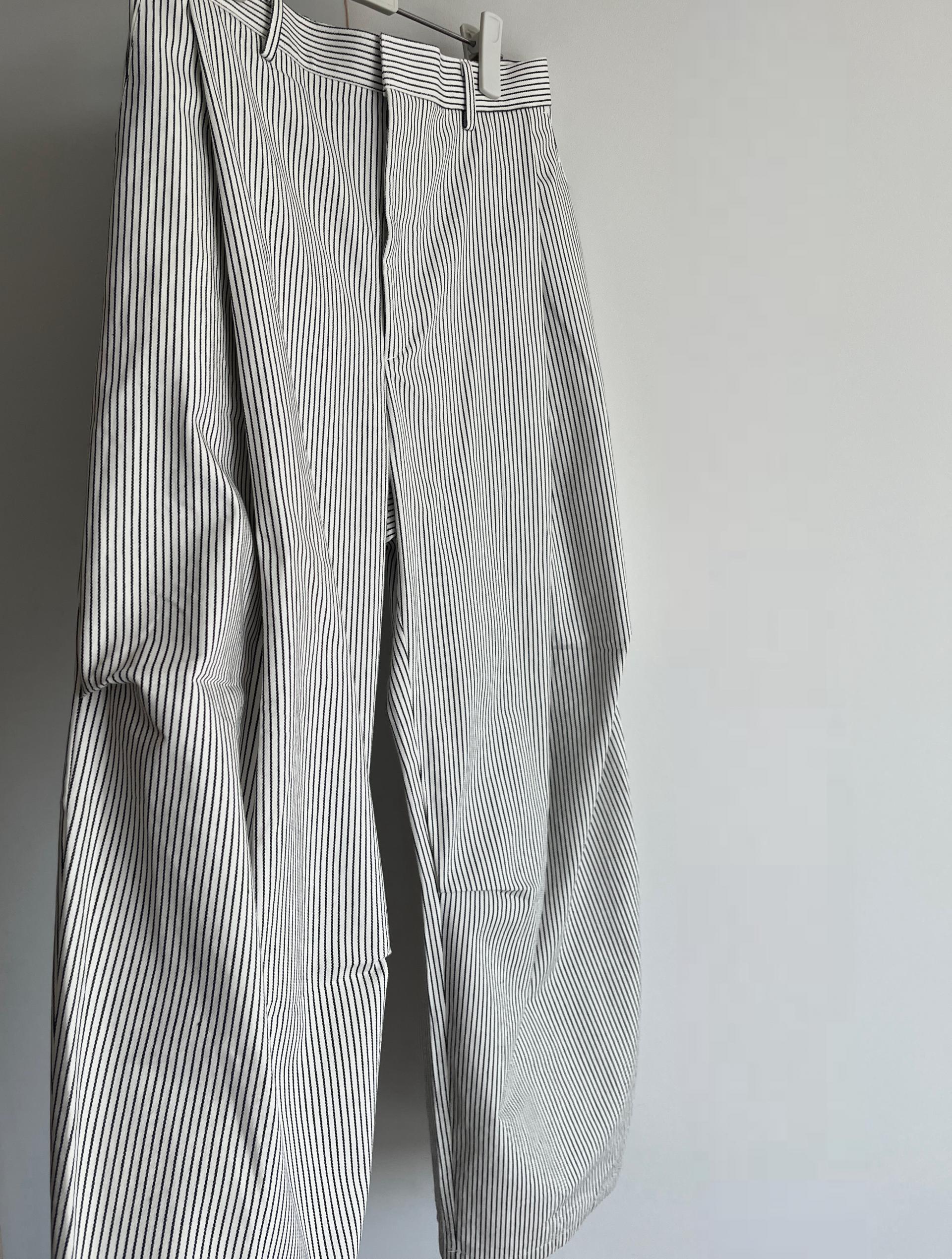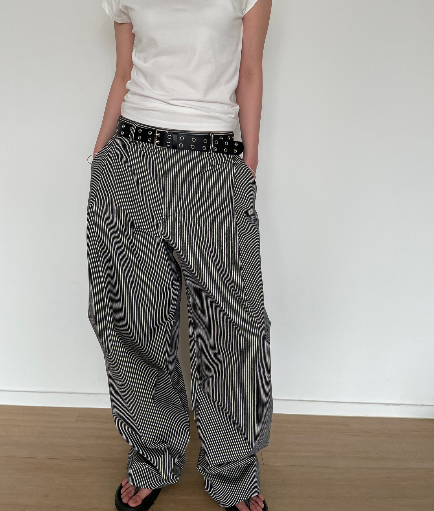 캐주얼하면서도 구조적인 멋이 돋보이는 와이드 스트라이프 팬츠입니다.