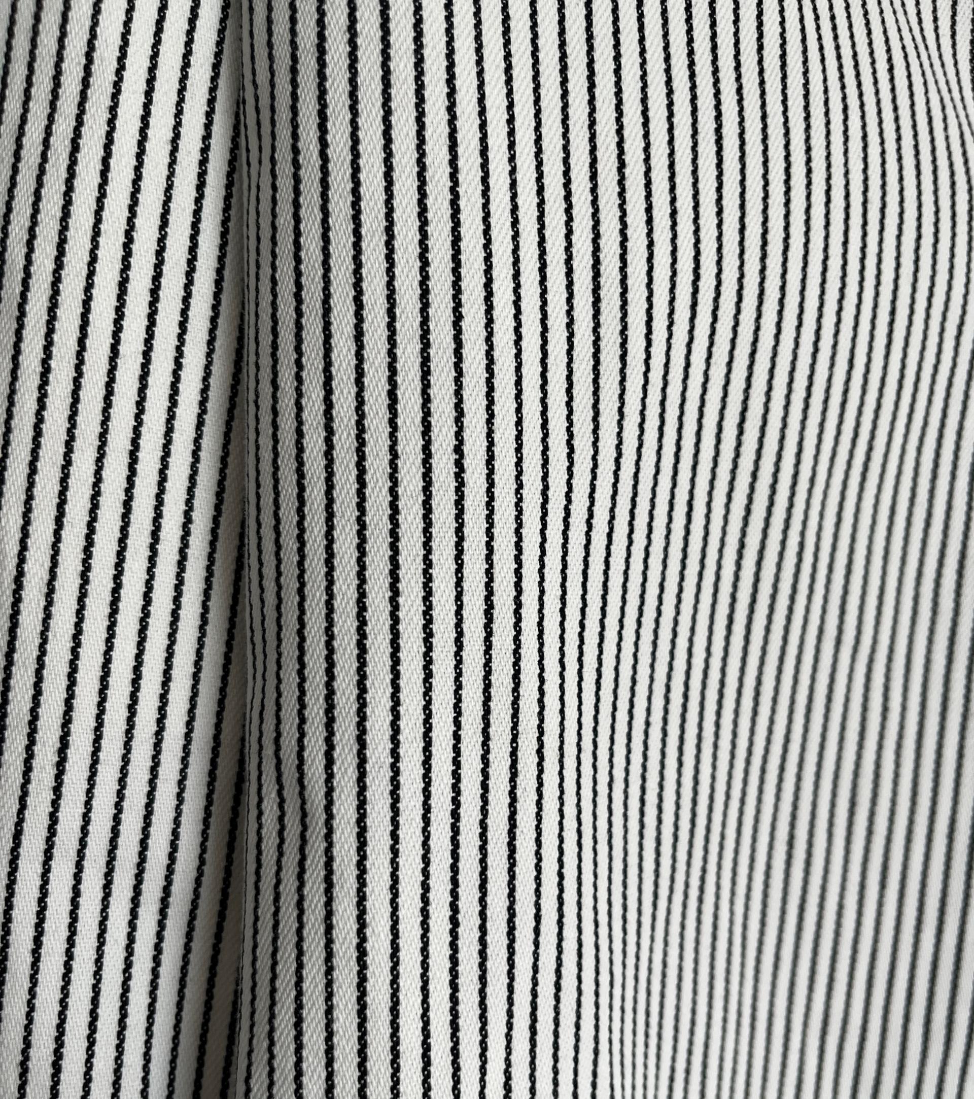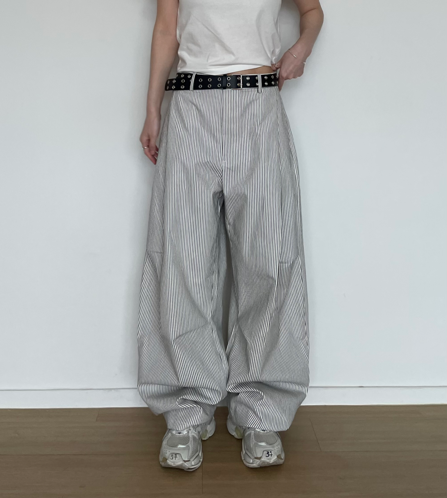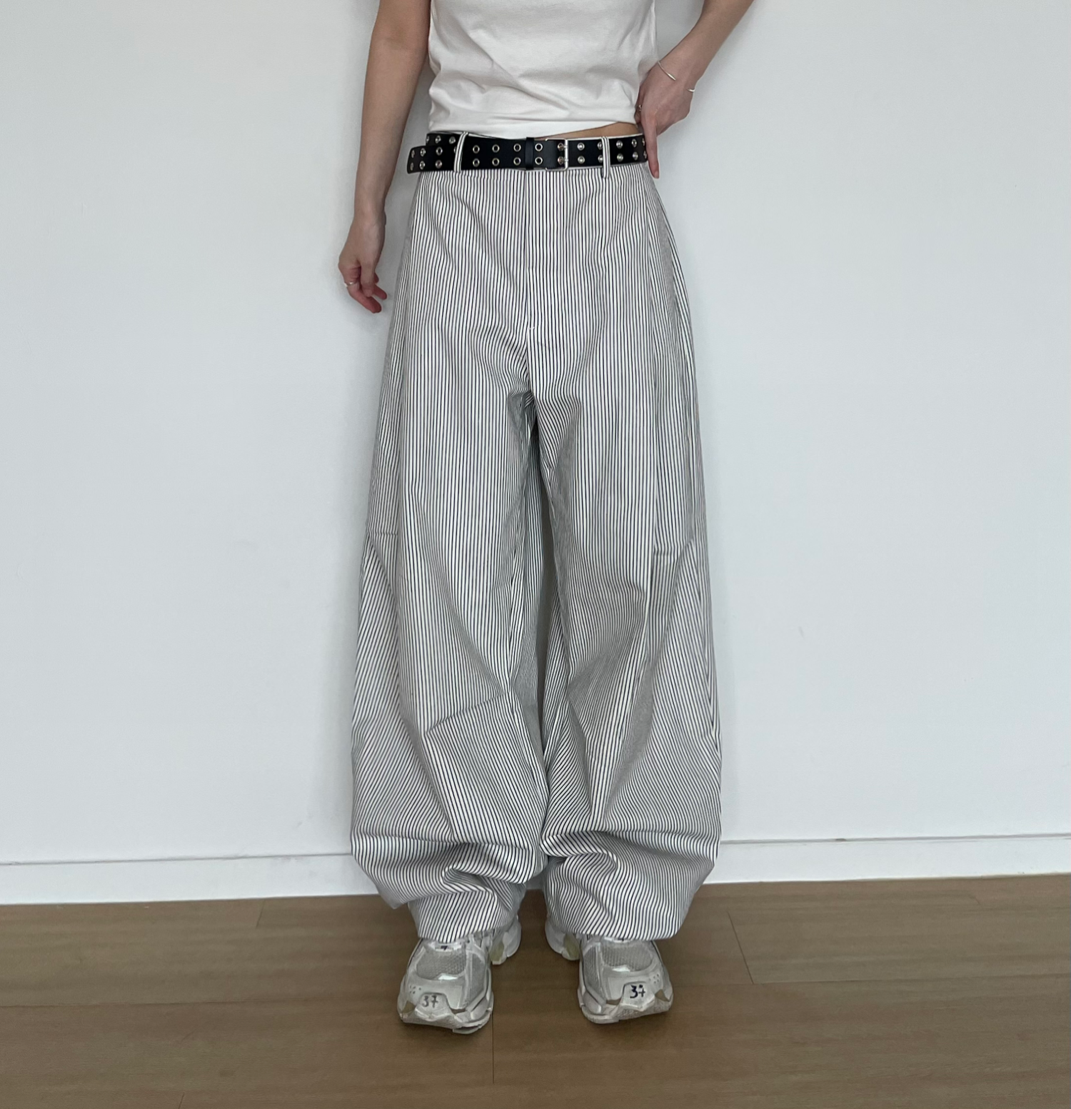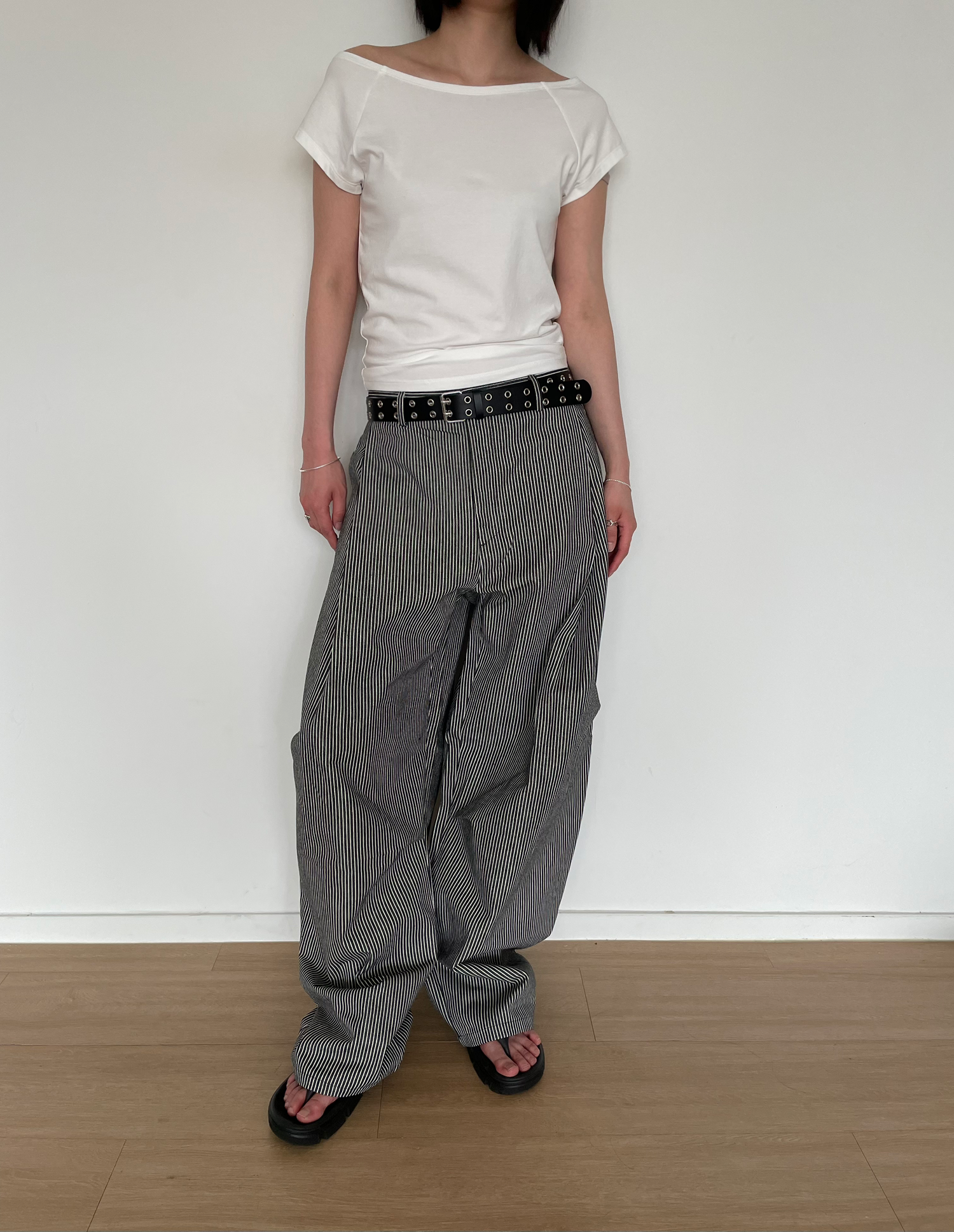 캐주얼하면서도 구조적인 멋이 돋보이는 와이드 스트라이프 팬츠입니다.