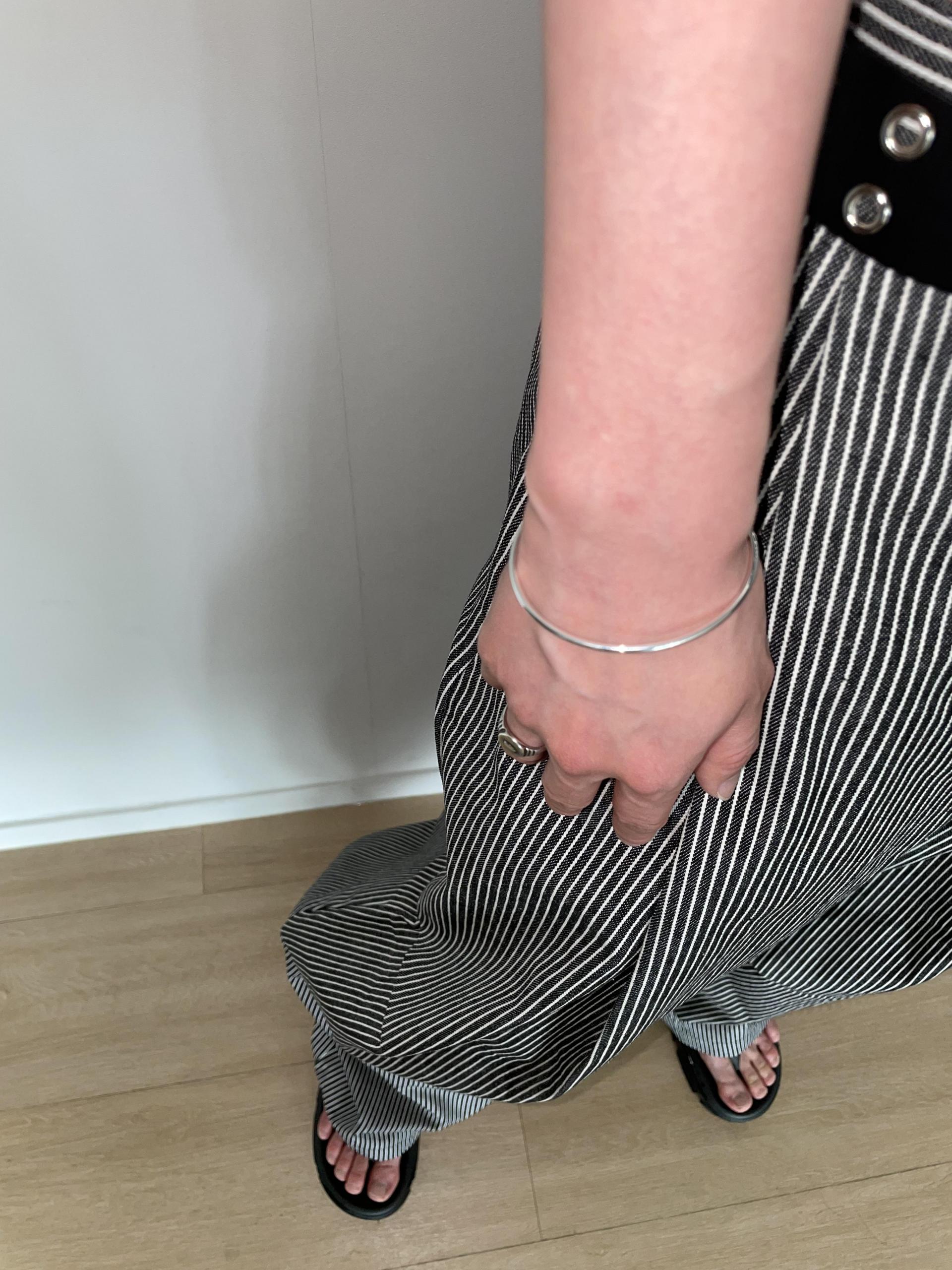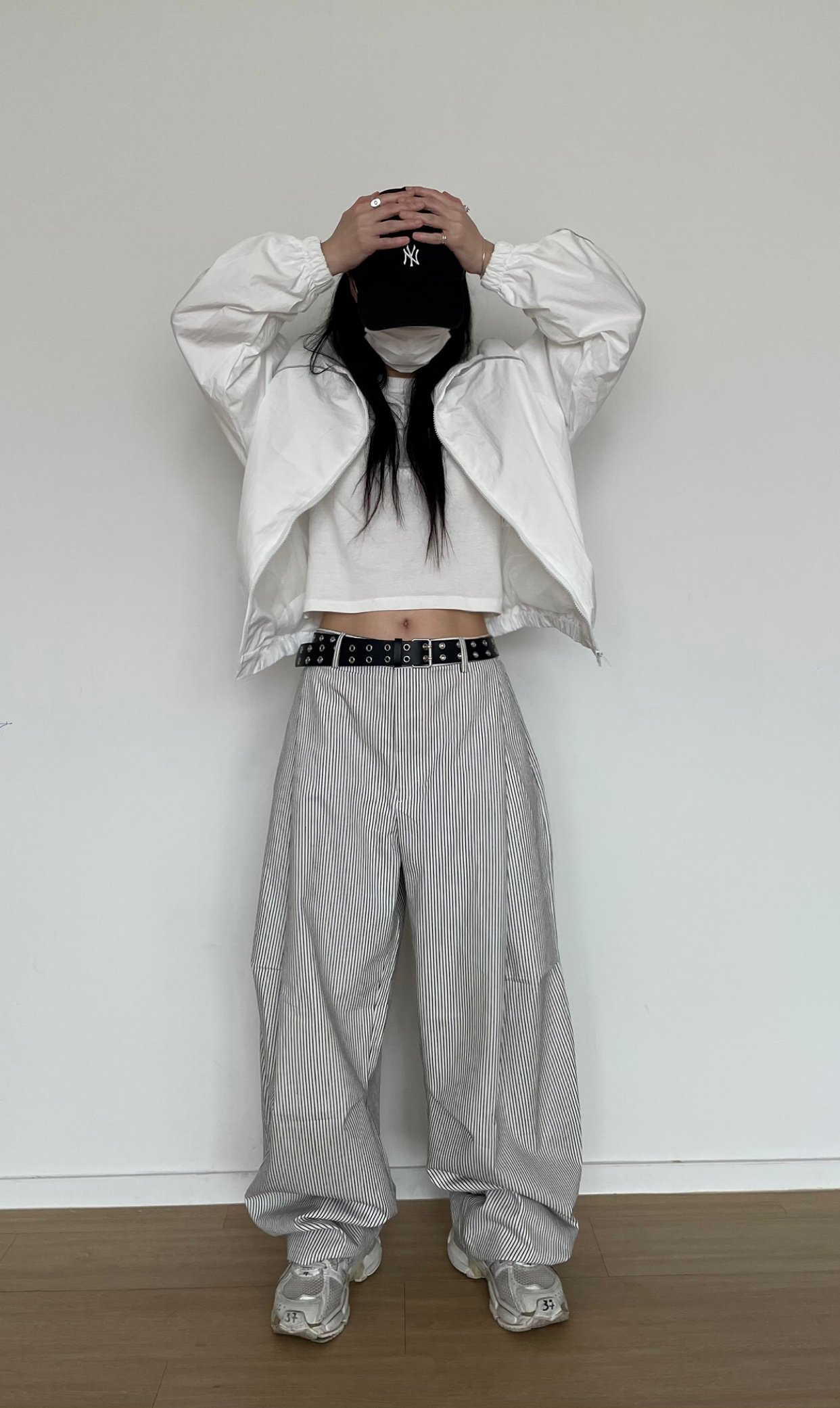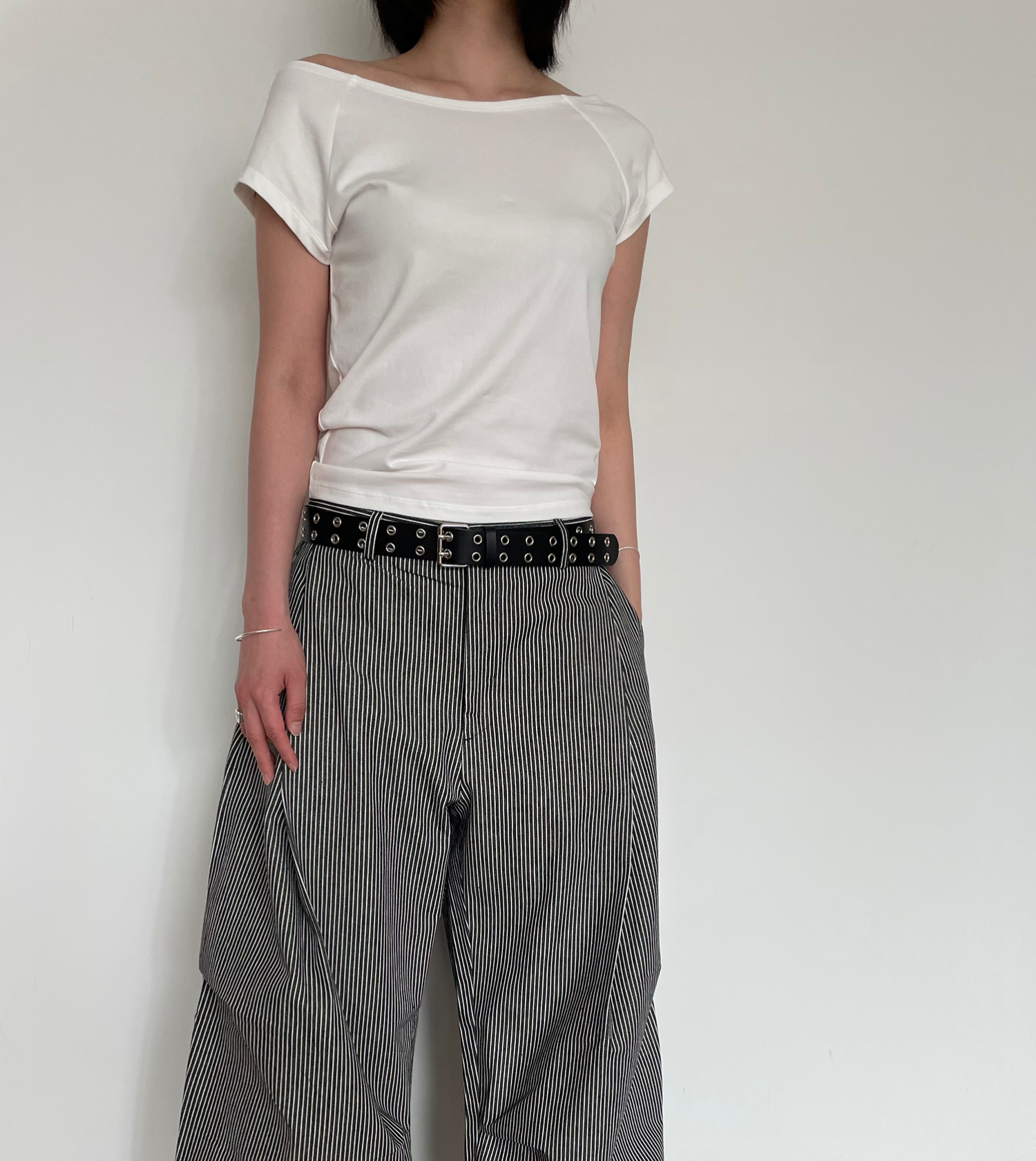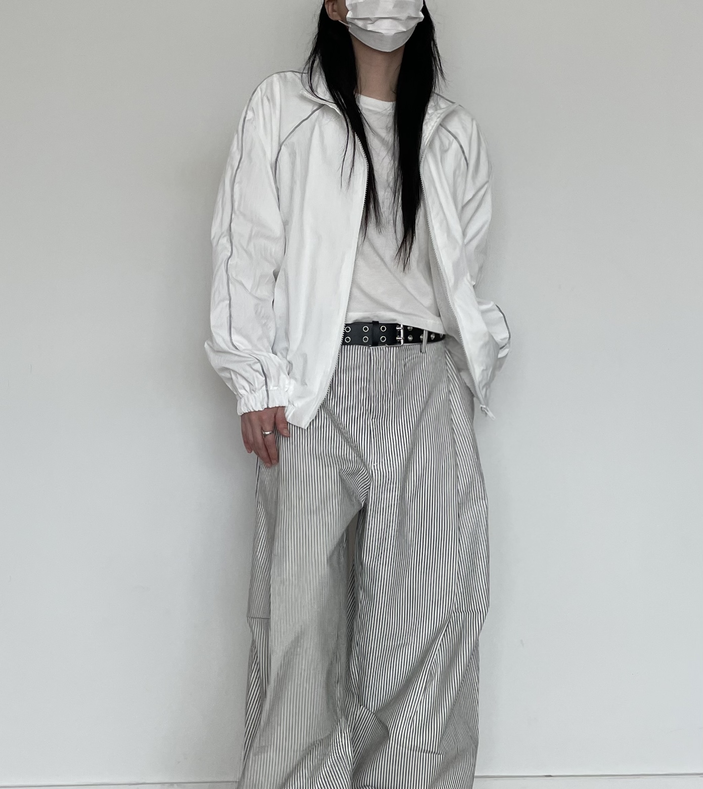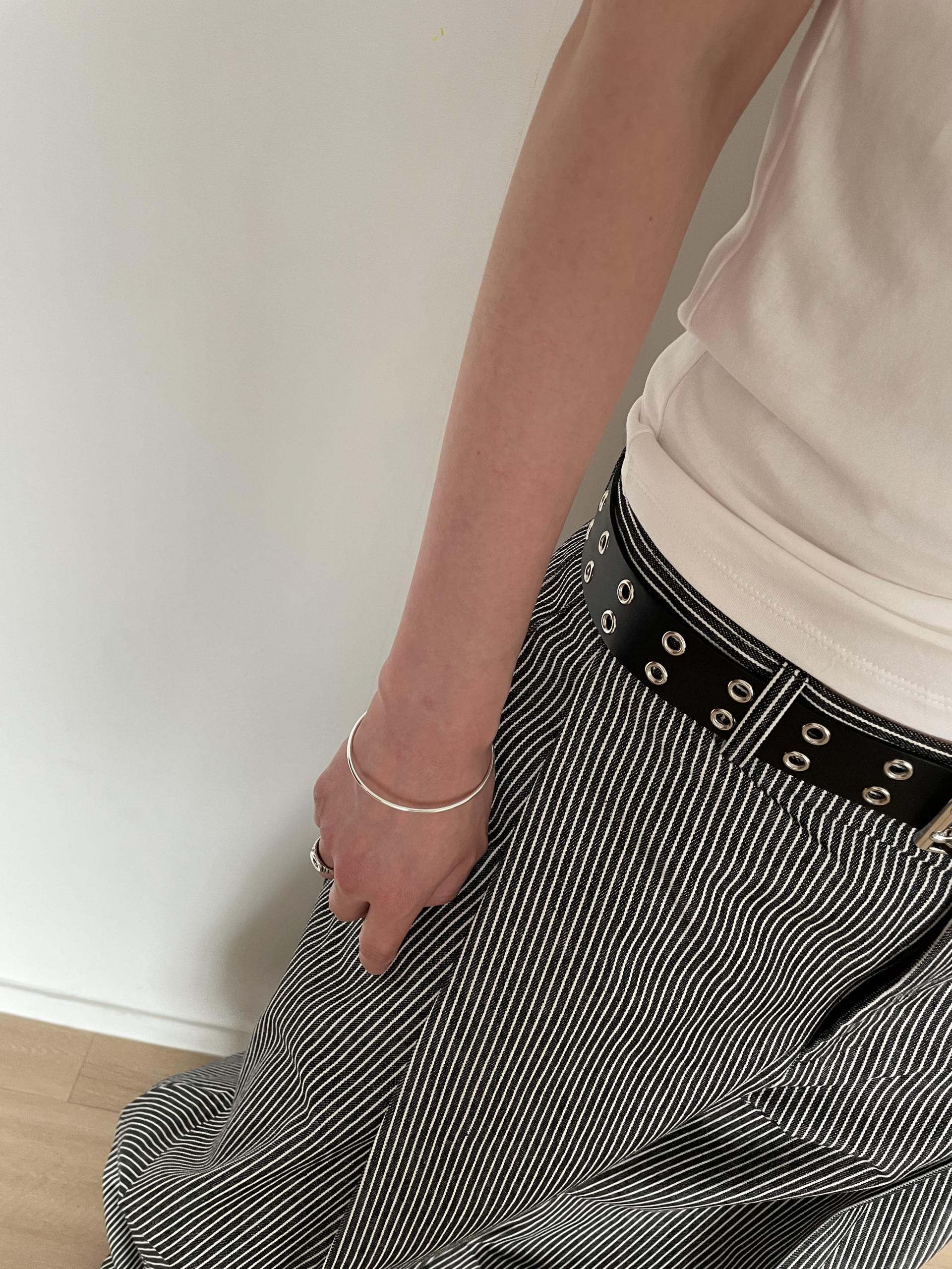 캐주얼하면서도 구조적인 멋이 돋보이는 와이드 스트라이프 팬츠입니다.