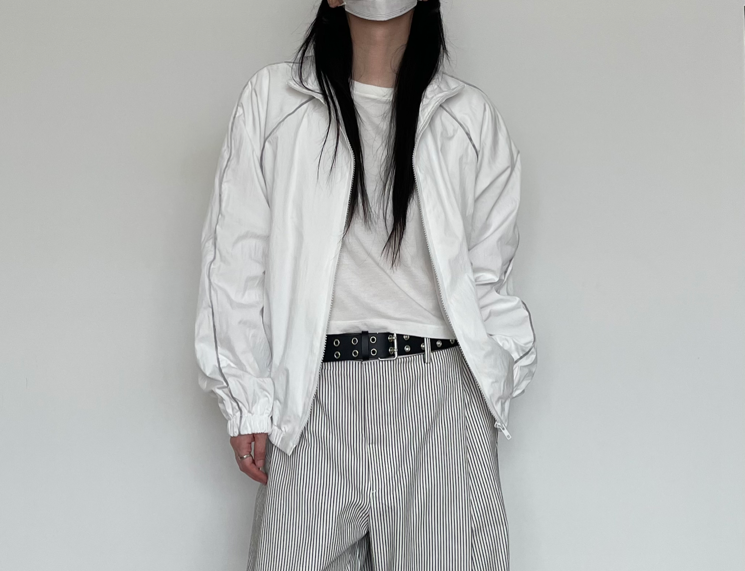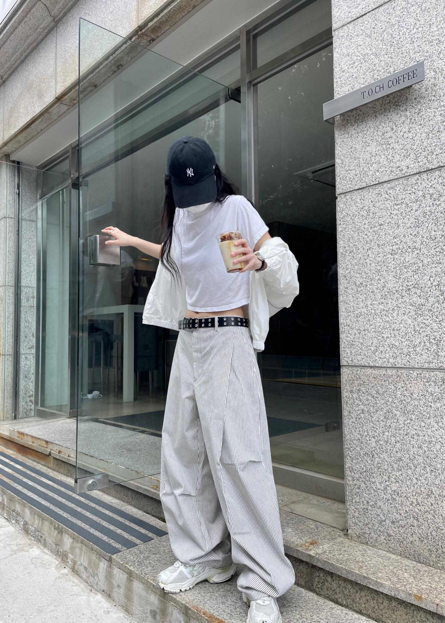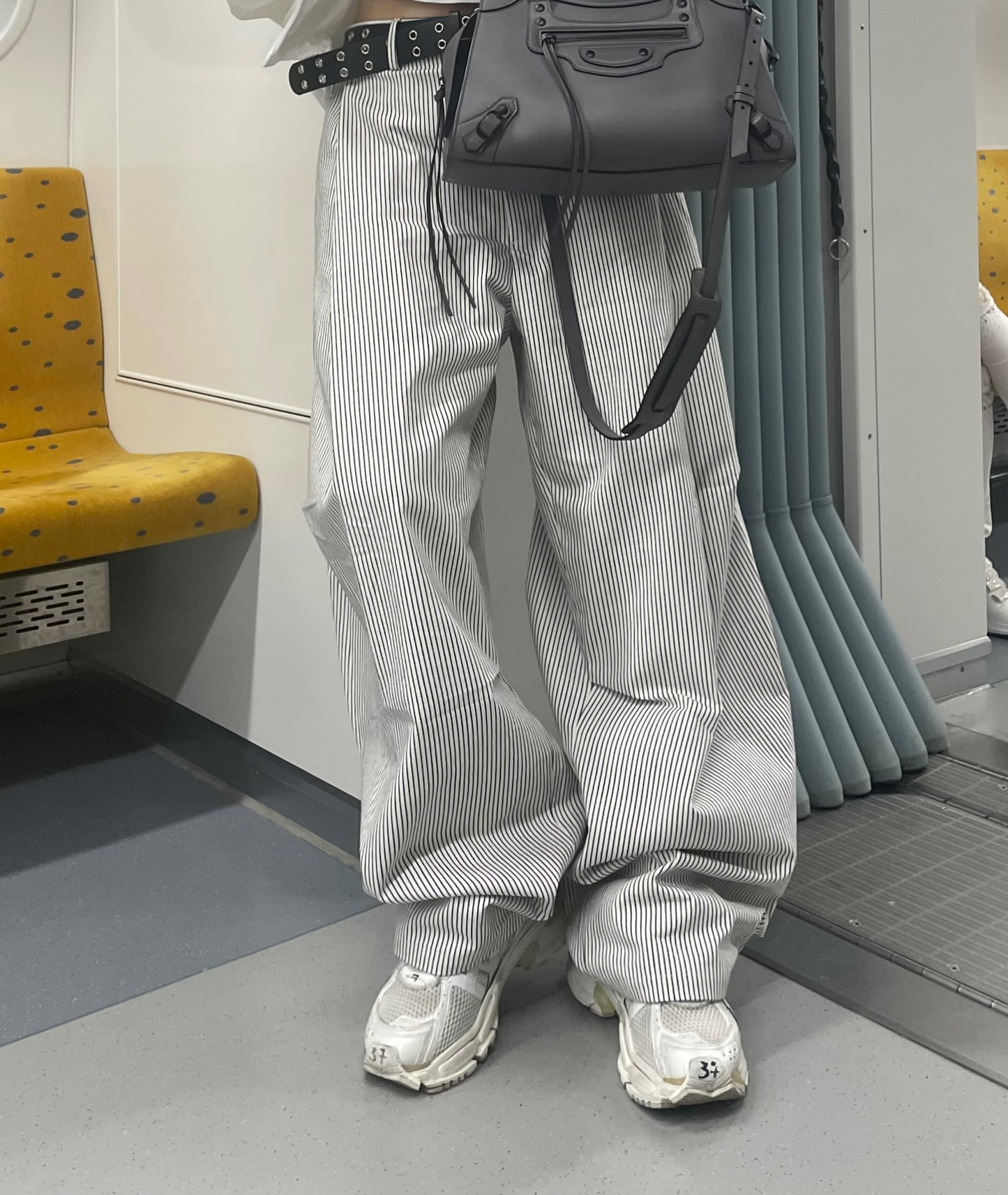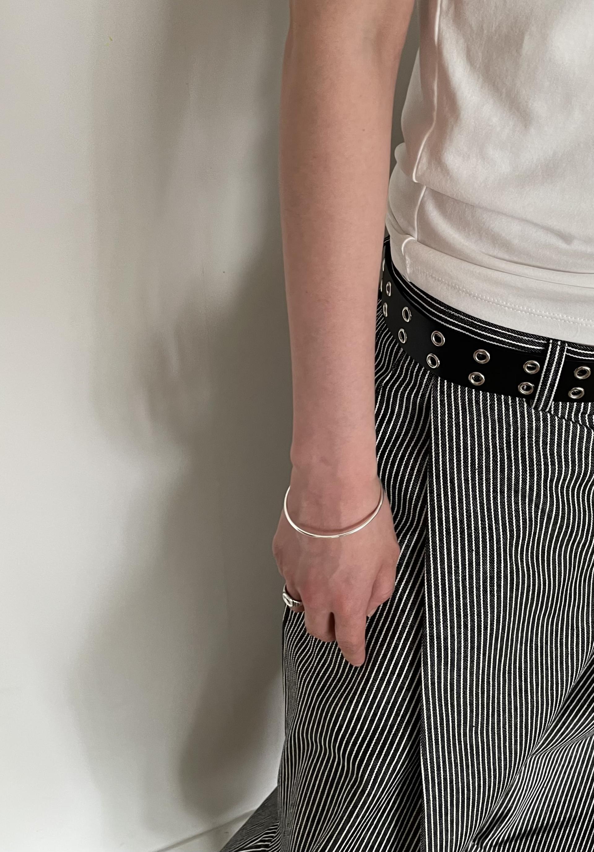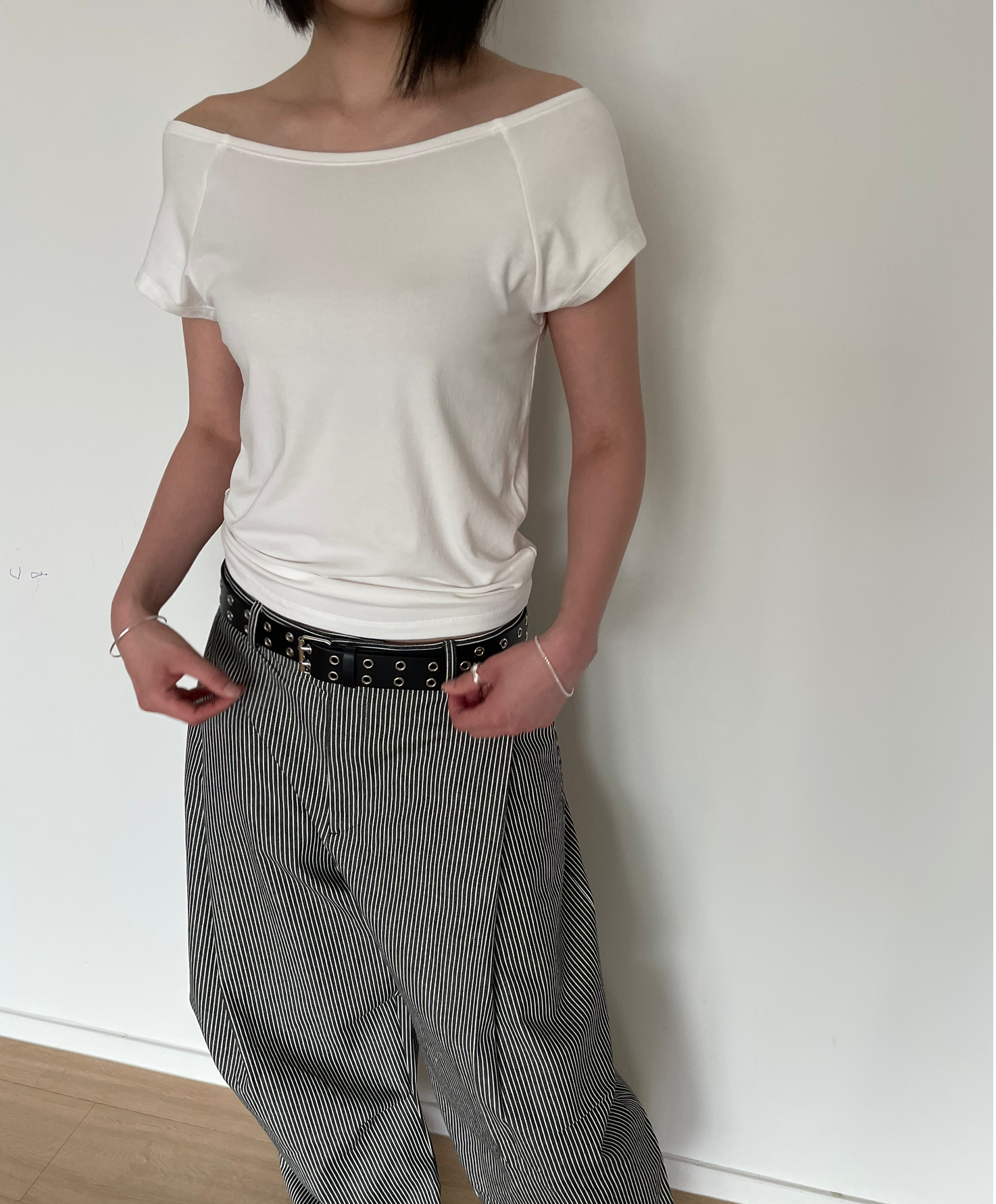 캐주얼하면서도 구조적인 멋이 돋보이는 와이드 스트라이프 팬츠입니다.
