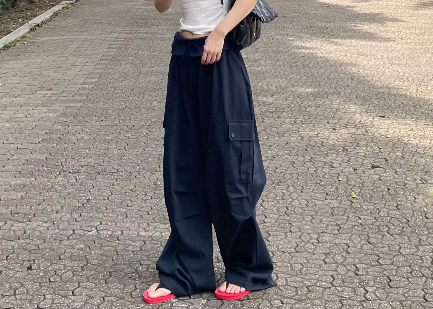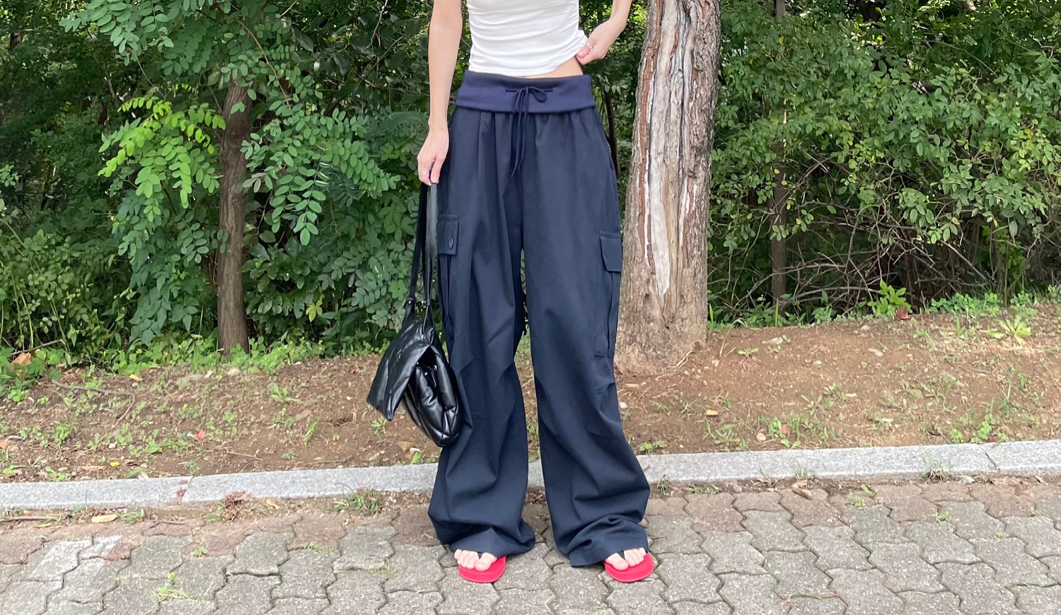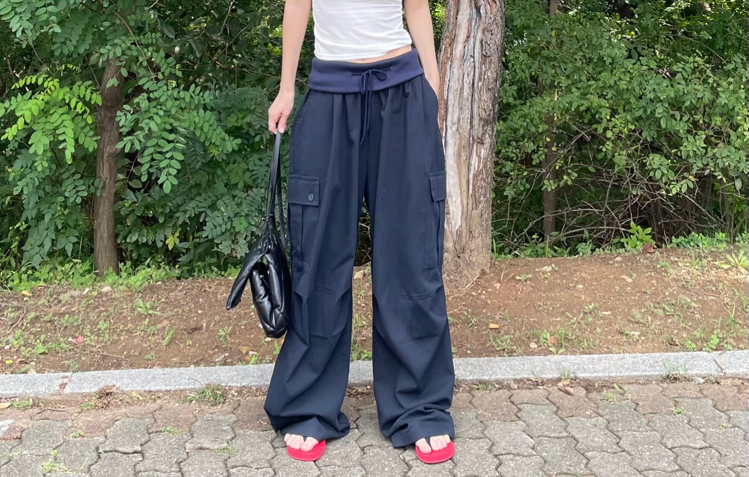 편안하면서도 세련된 무드가 묻어나는 와이드 카고 팬츠입니다. 허리는 시보리 밴딩과 스트링 디테일로 체형에 맞게 조절할 수 있고, 옆선에 자리한 플랩 포켓이 실용성과 디자인 포인트를 동시에 살려줍니다.
