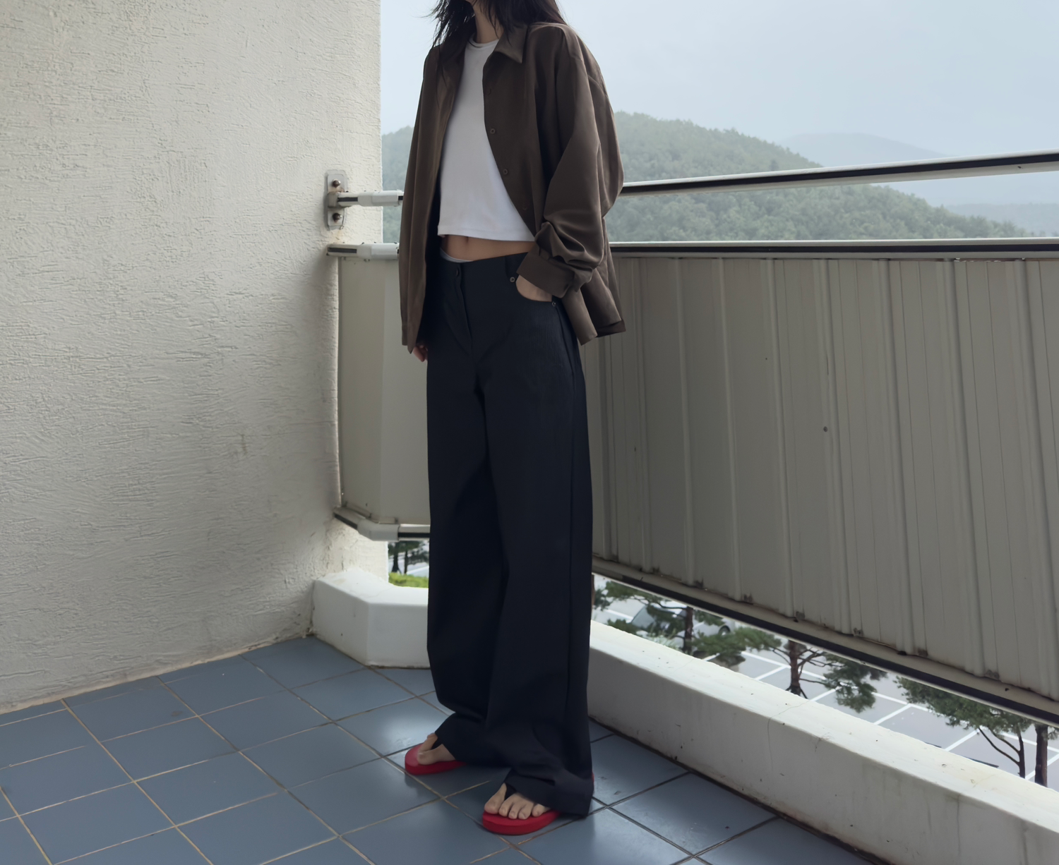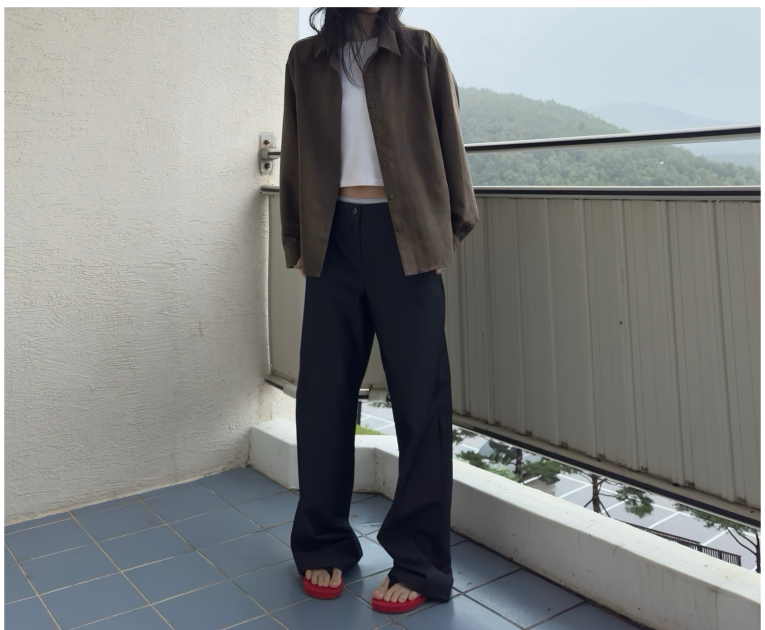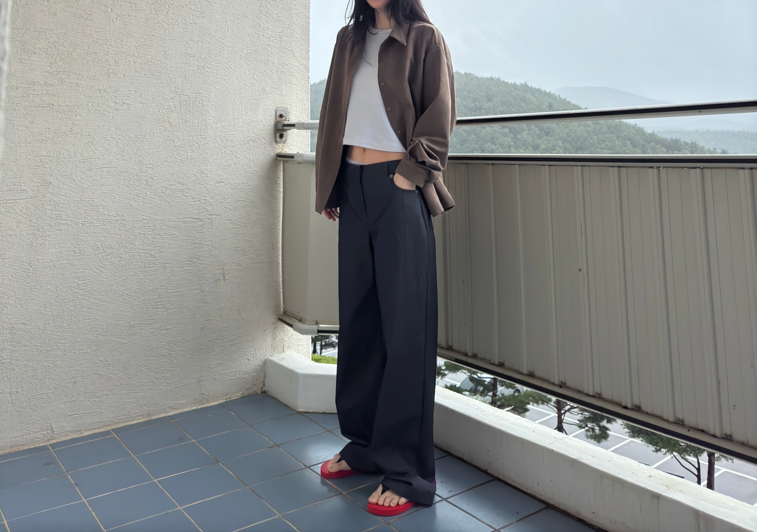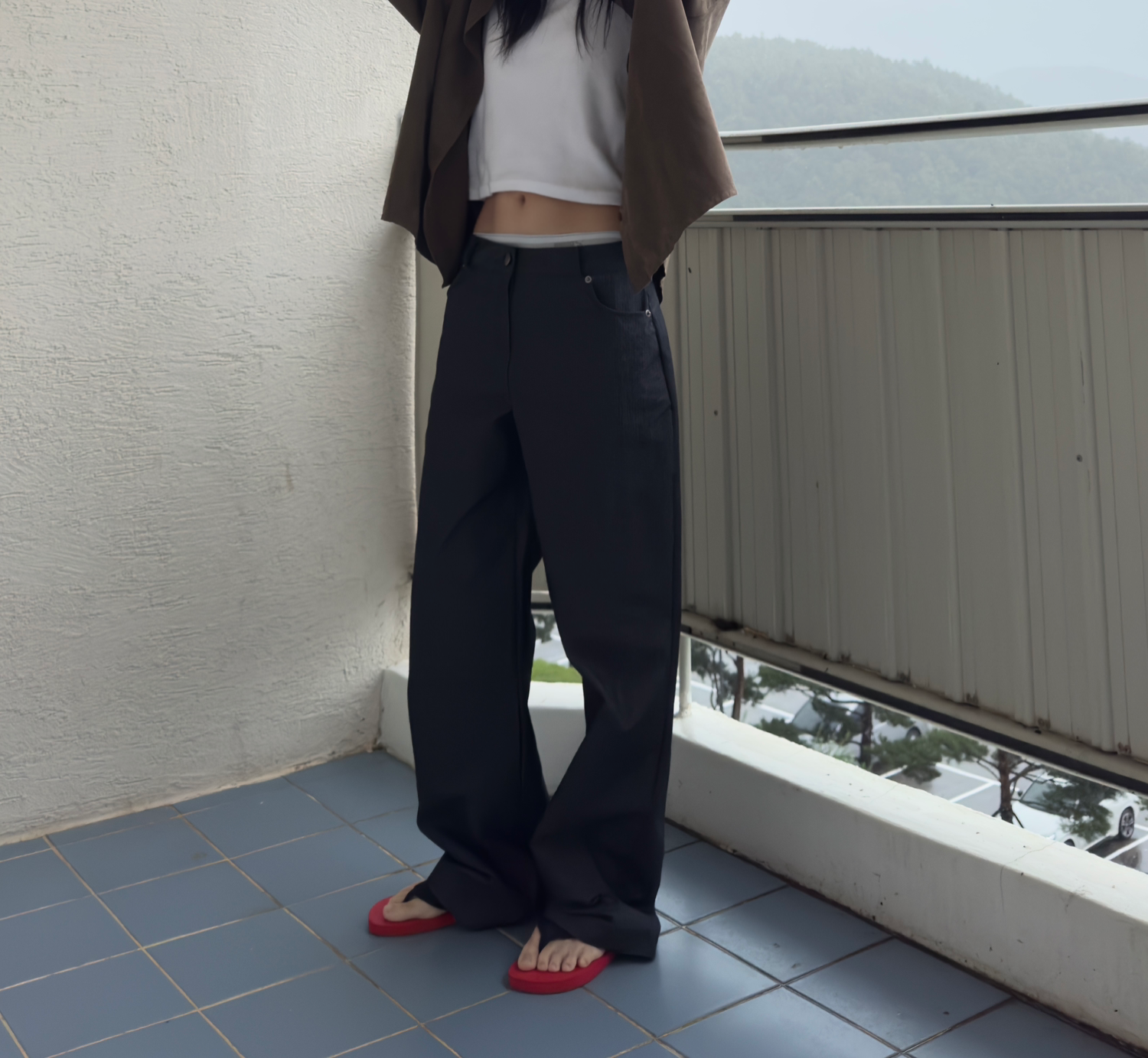 힙 라인부터 밑단까지 쭉 뻗은 핏이 모던한 분위기를 연출합니다.