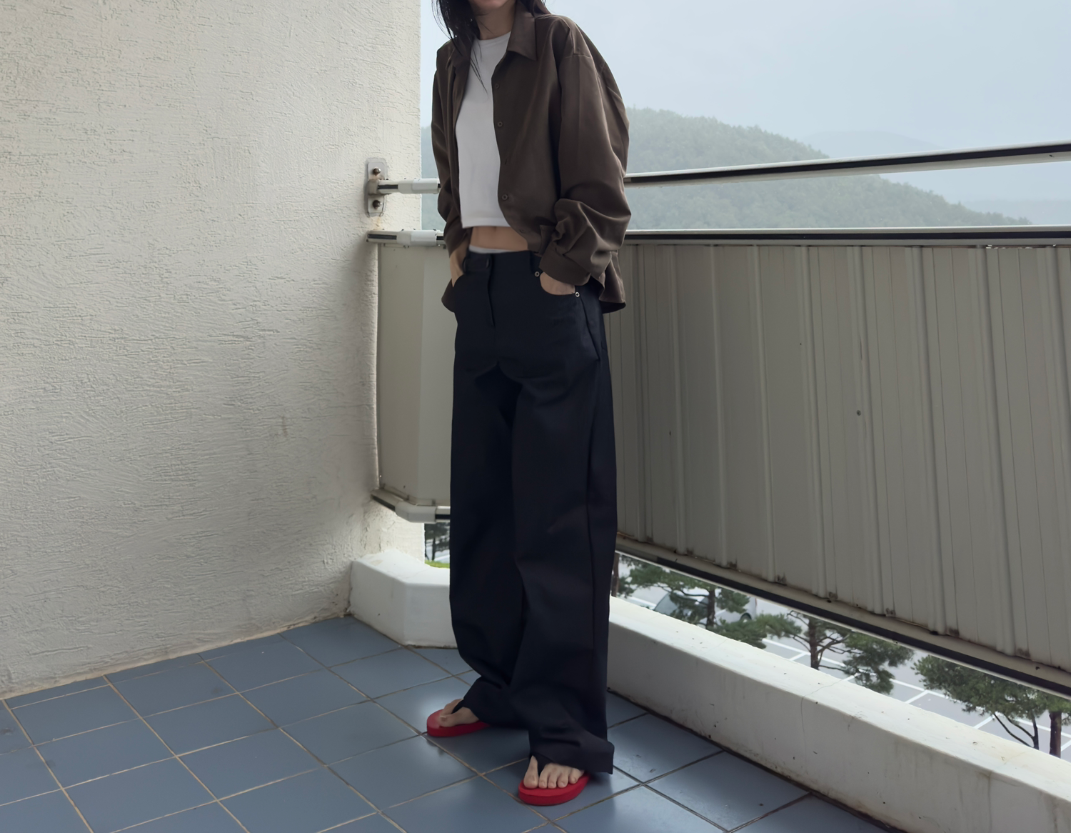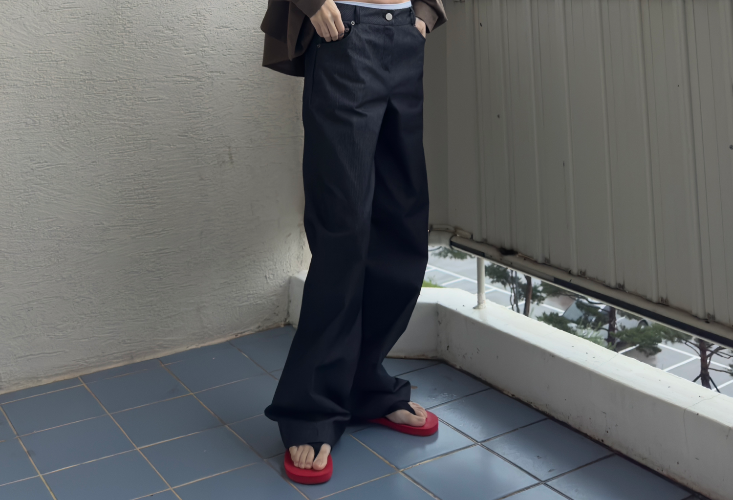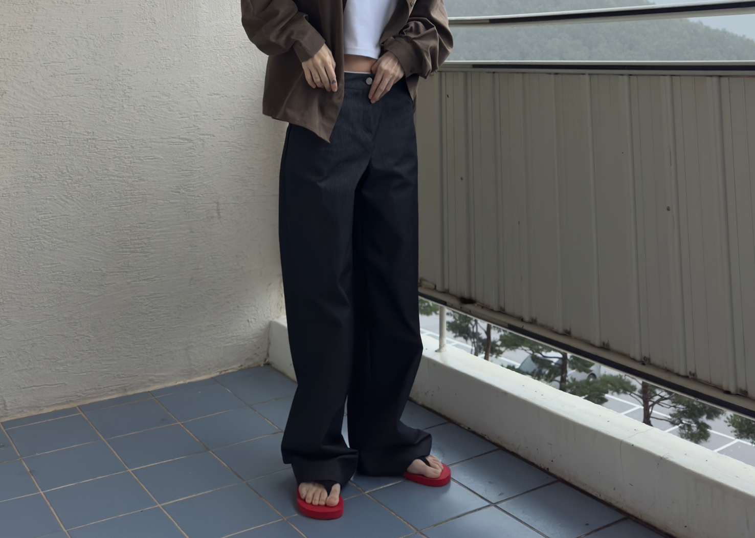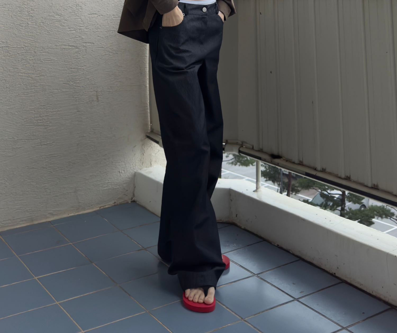 힙 라인부터 밑단까지 쭉 뻗은 핏이 모던한 분위기를 연출합니다.