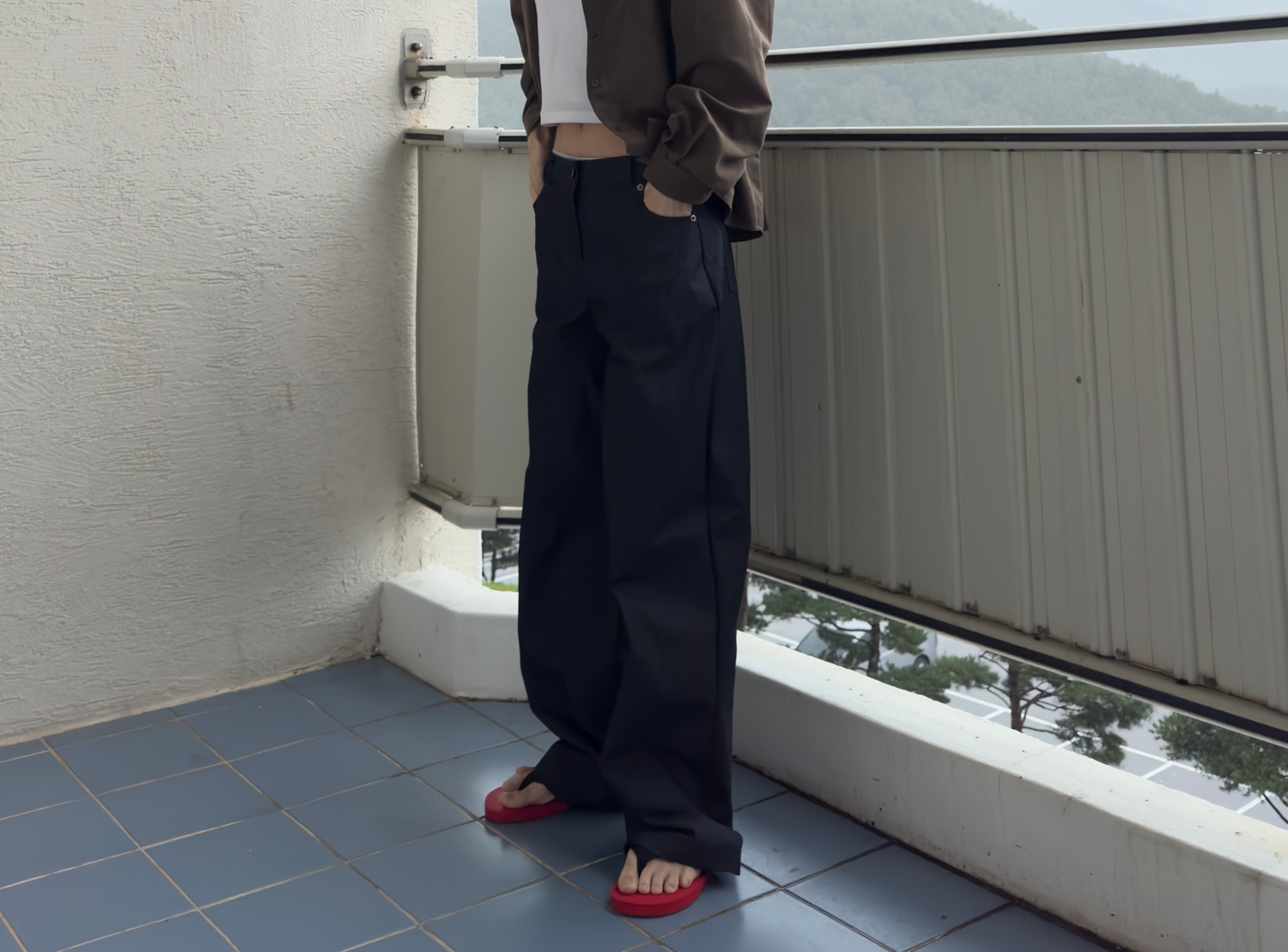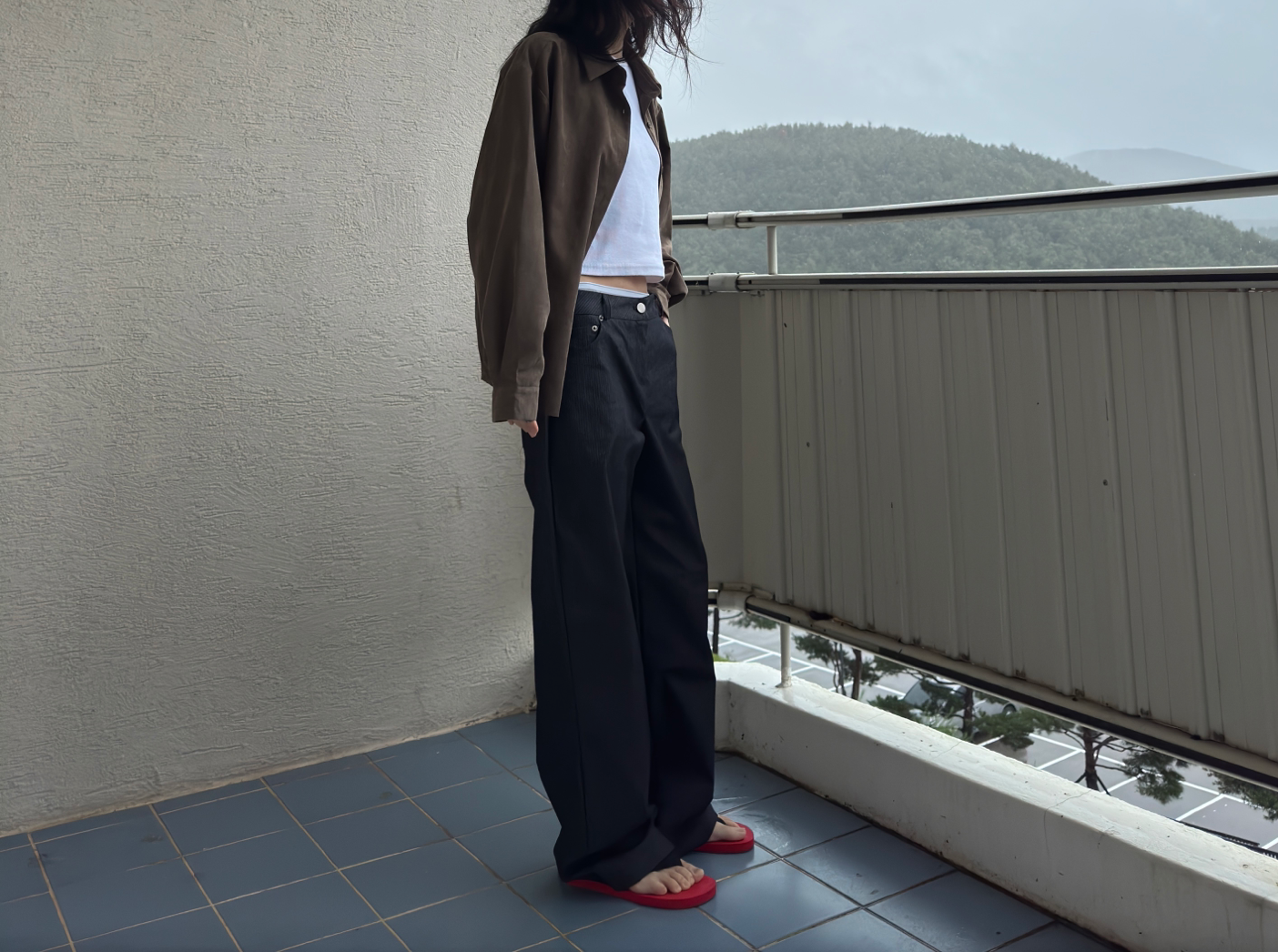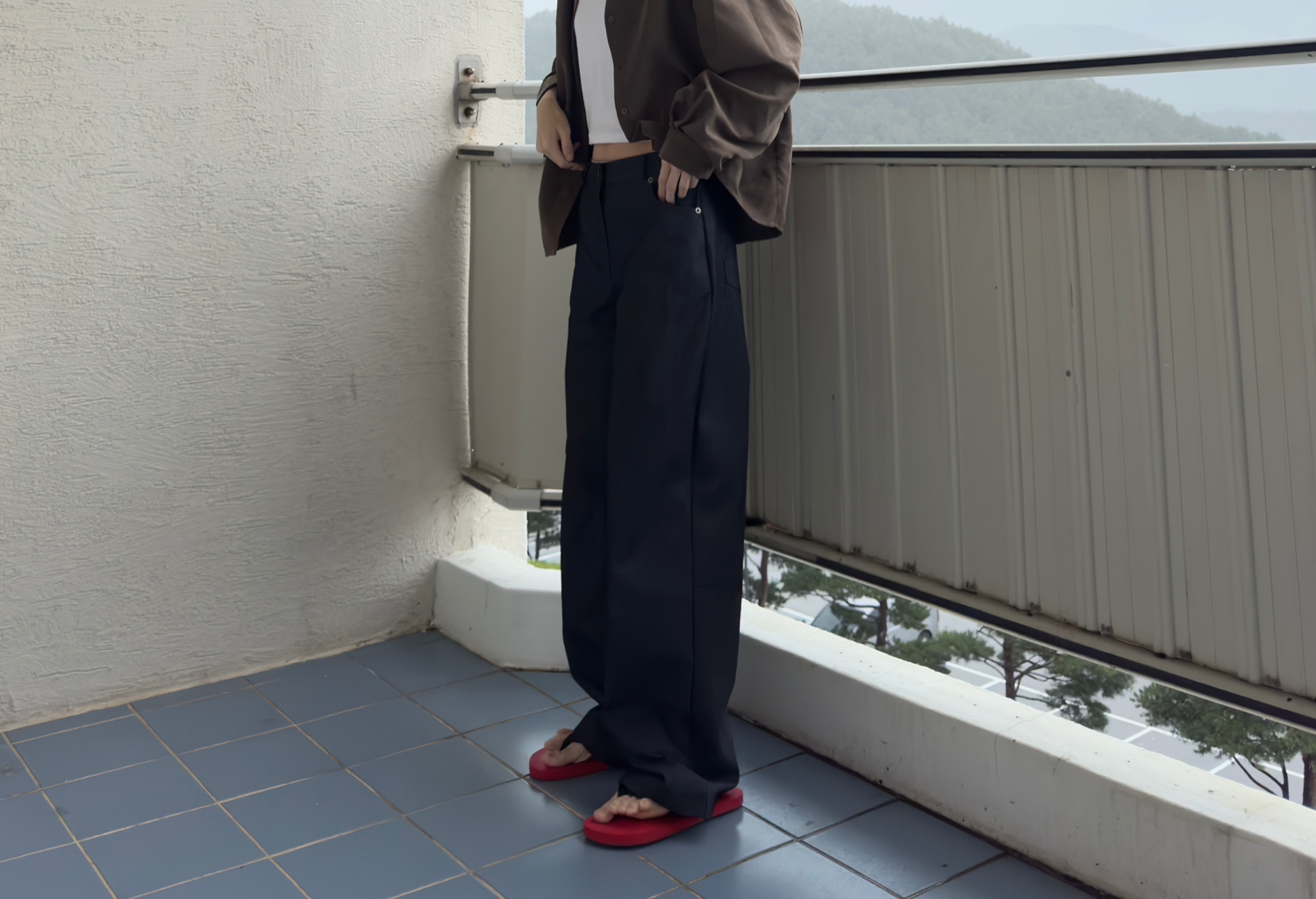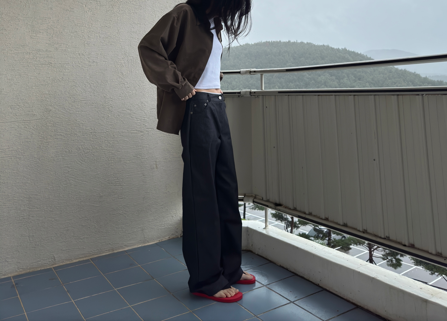 힙 라인부터 밑단까지 쭉 뻗은 핏이 모던한 분위기를 연출합니다.