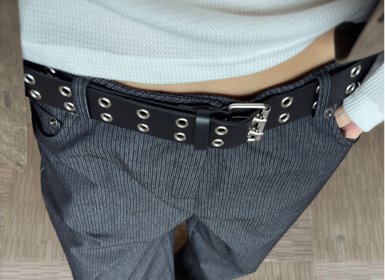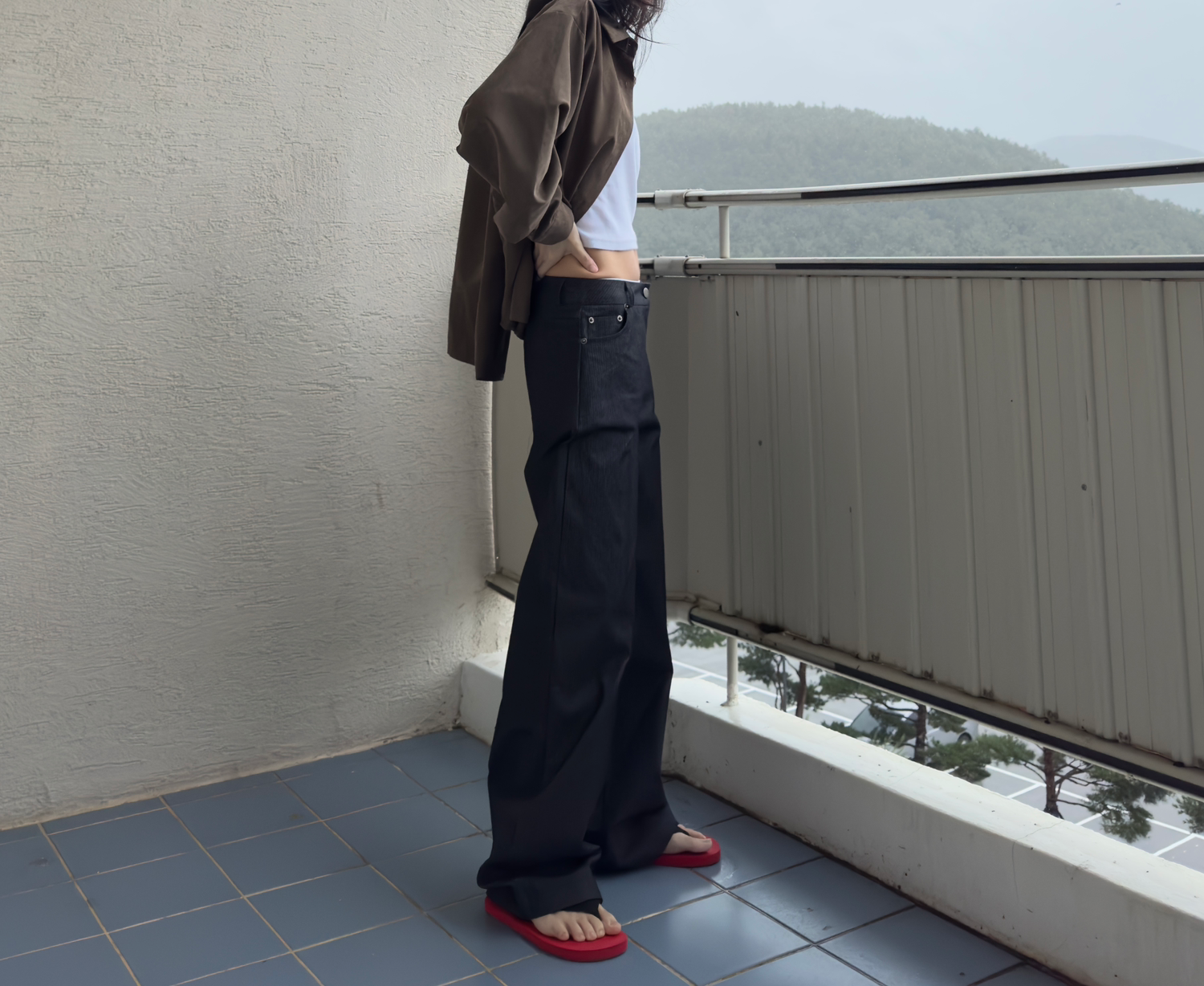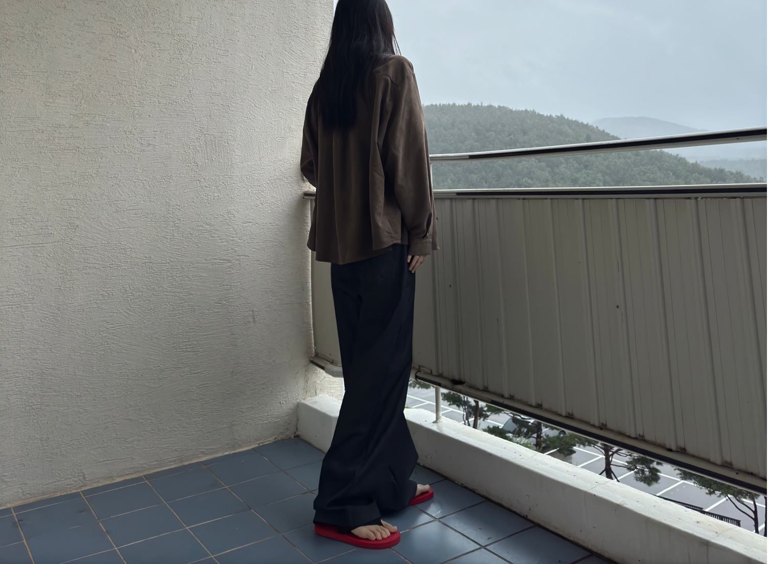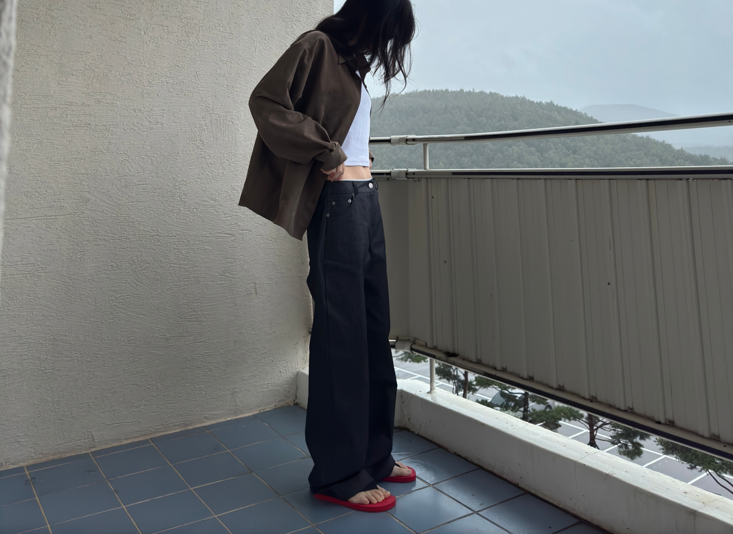 힙 라인부터 밑단까지 쭉 뻗은 핏이 모던한 분위기를 연출합니다.