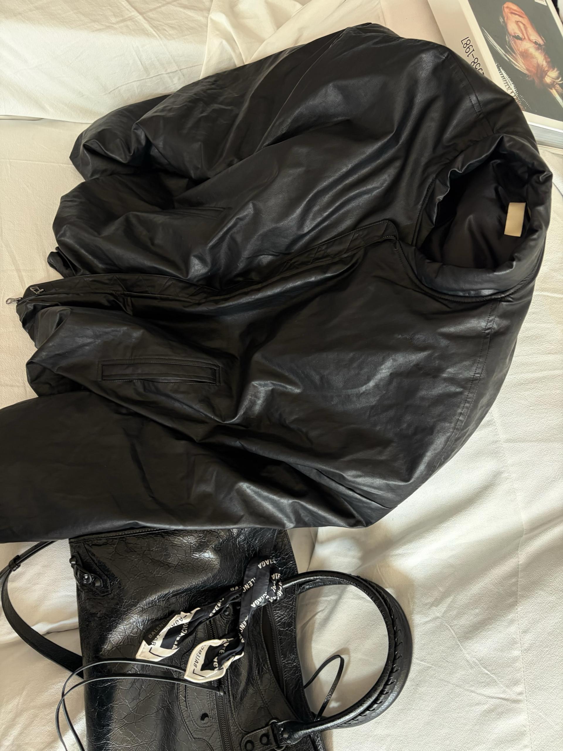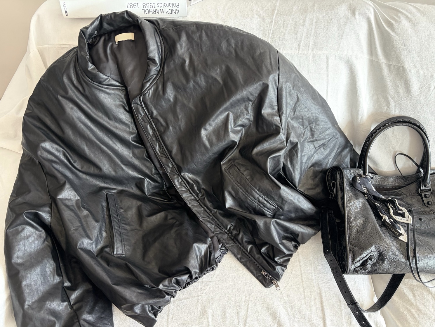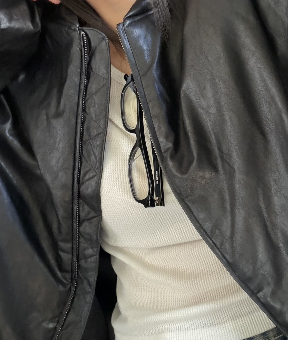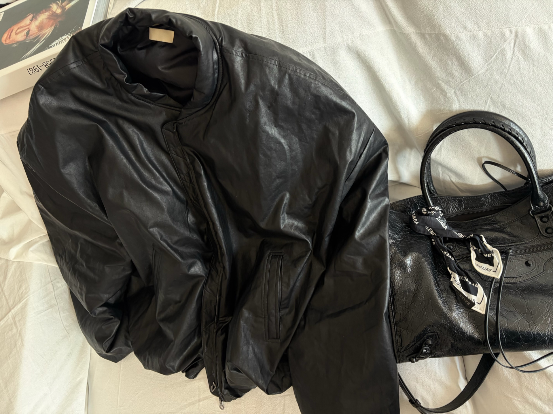 매력적인 레더 텍스처에 오버핏 실루엣을 더한 보머 스타일의 레더 패딩입니다. 무심한 듯 툭 떨어지는 숄더 라인과 루즈한 소매로 여유로운 무드를 연출합니다.