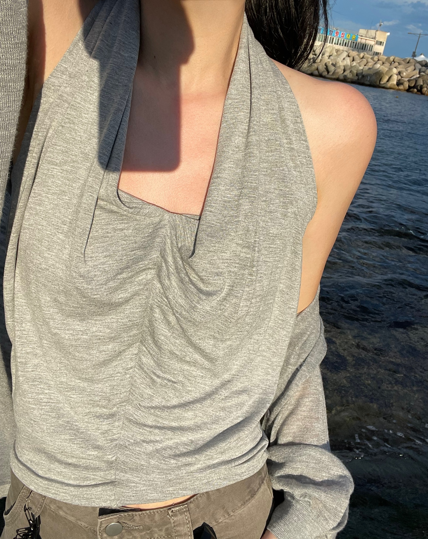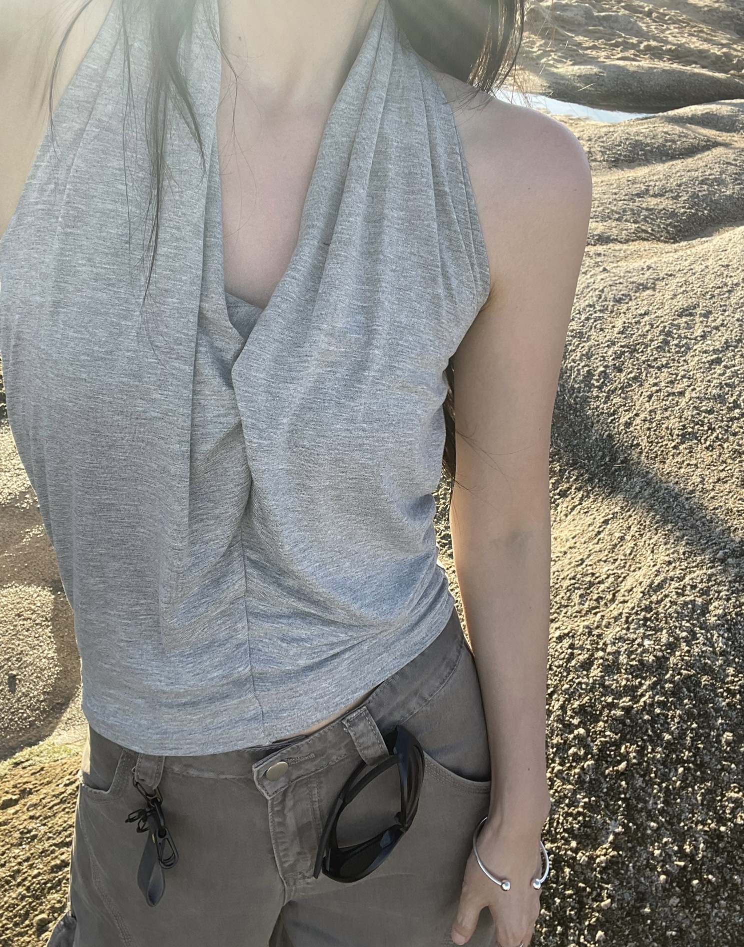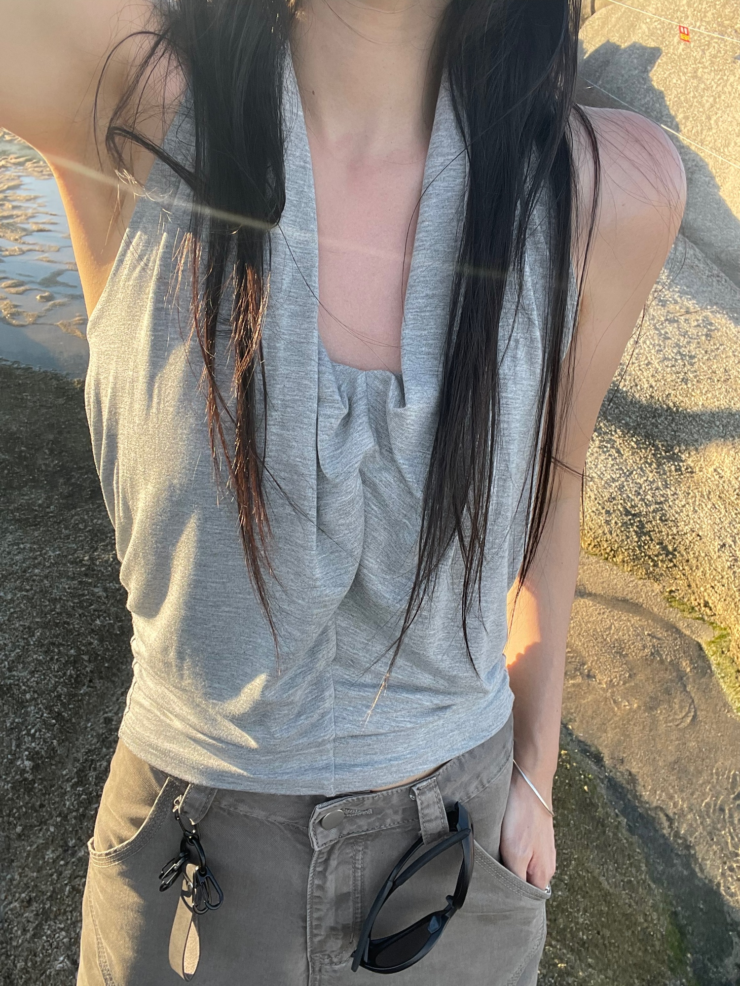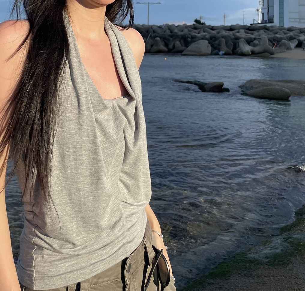 디자인 포인트는 홀터형 네크라인의 드레이프 처리입니다. 목 뒤로 감아 묶는 전형적 홀터가 아닌 네크라인 부분을 넉넉히 잡아 자연스러운 셔링(주름)과 V슬릿이 생기도록 만든 형태로 목선과 쇄골을 돋보이게 해줍니다. 중앙에 보이는 심 중심 봉제선이 있어 심플하지만 세련된 실루엣을 살려주고, 넓은 암홀 덕분에 활동성이 좋습니다.