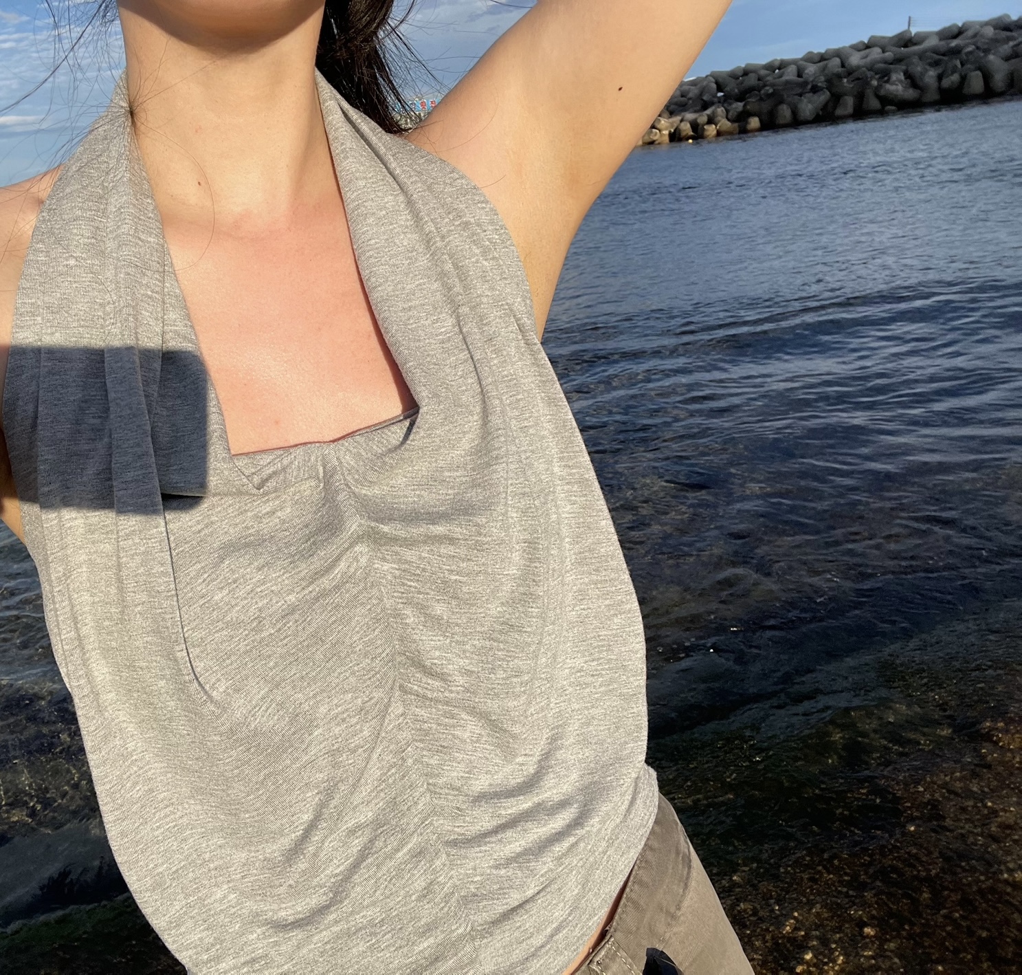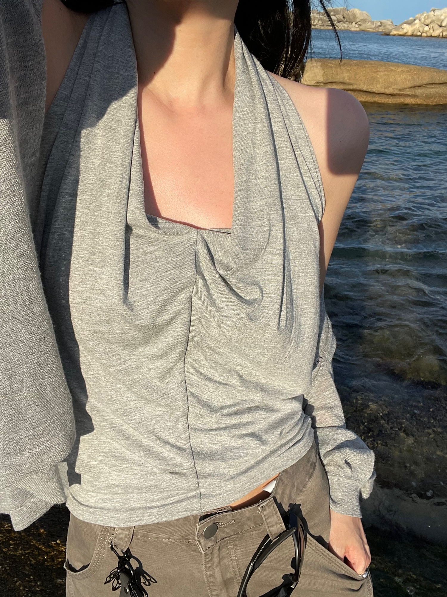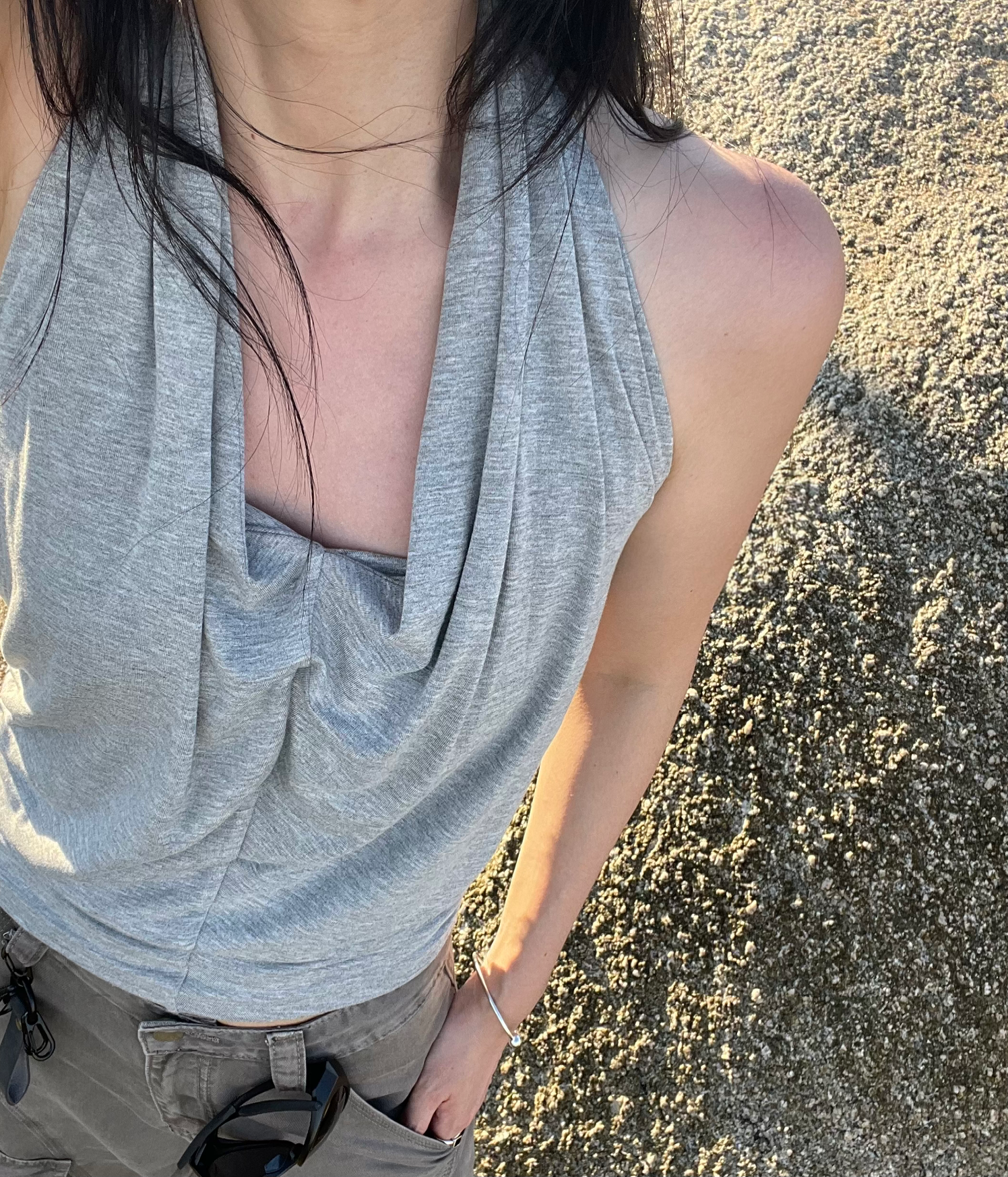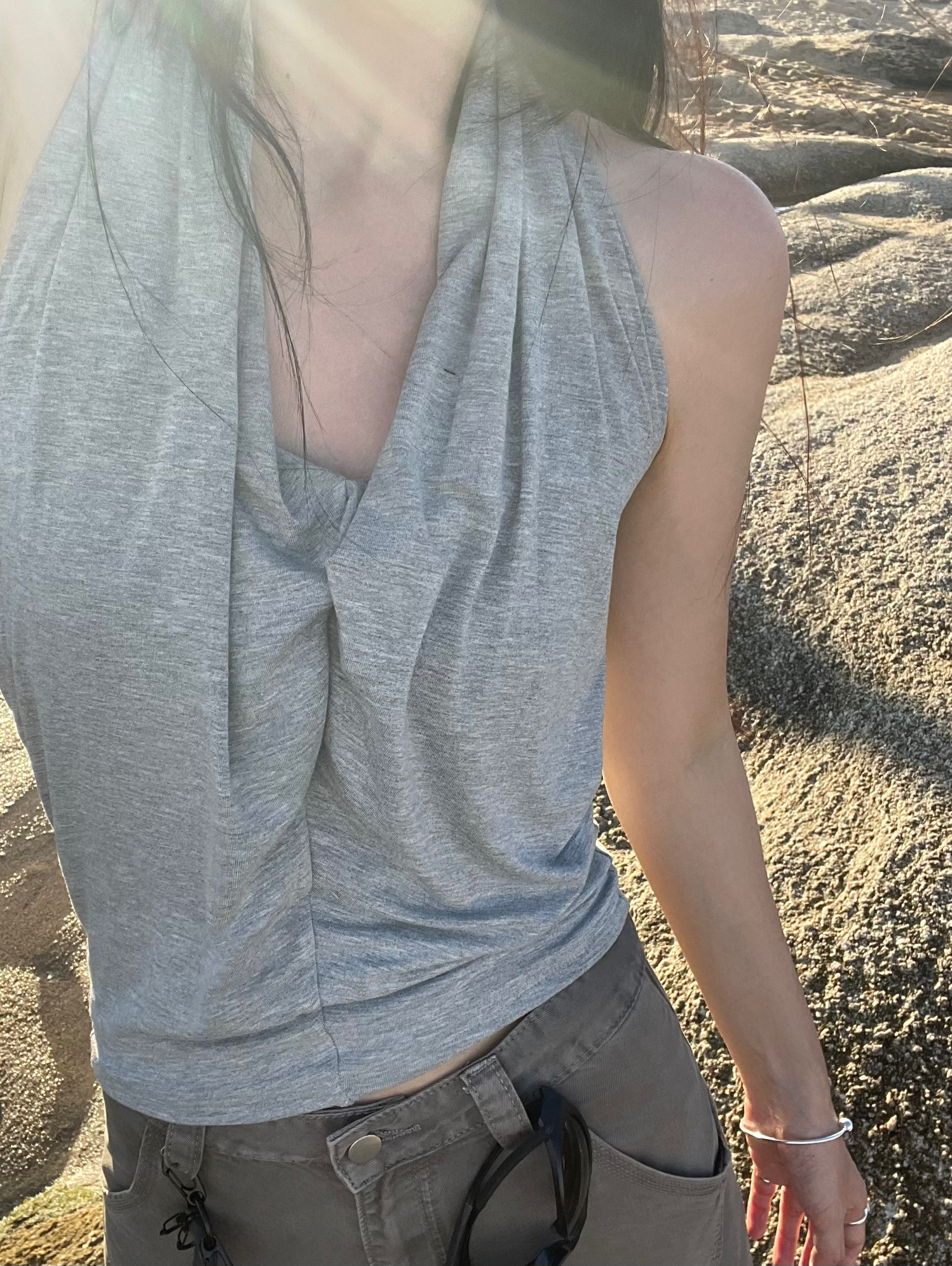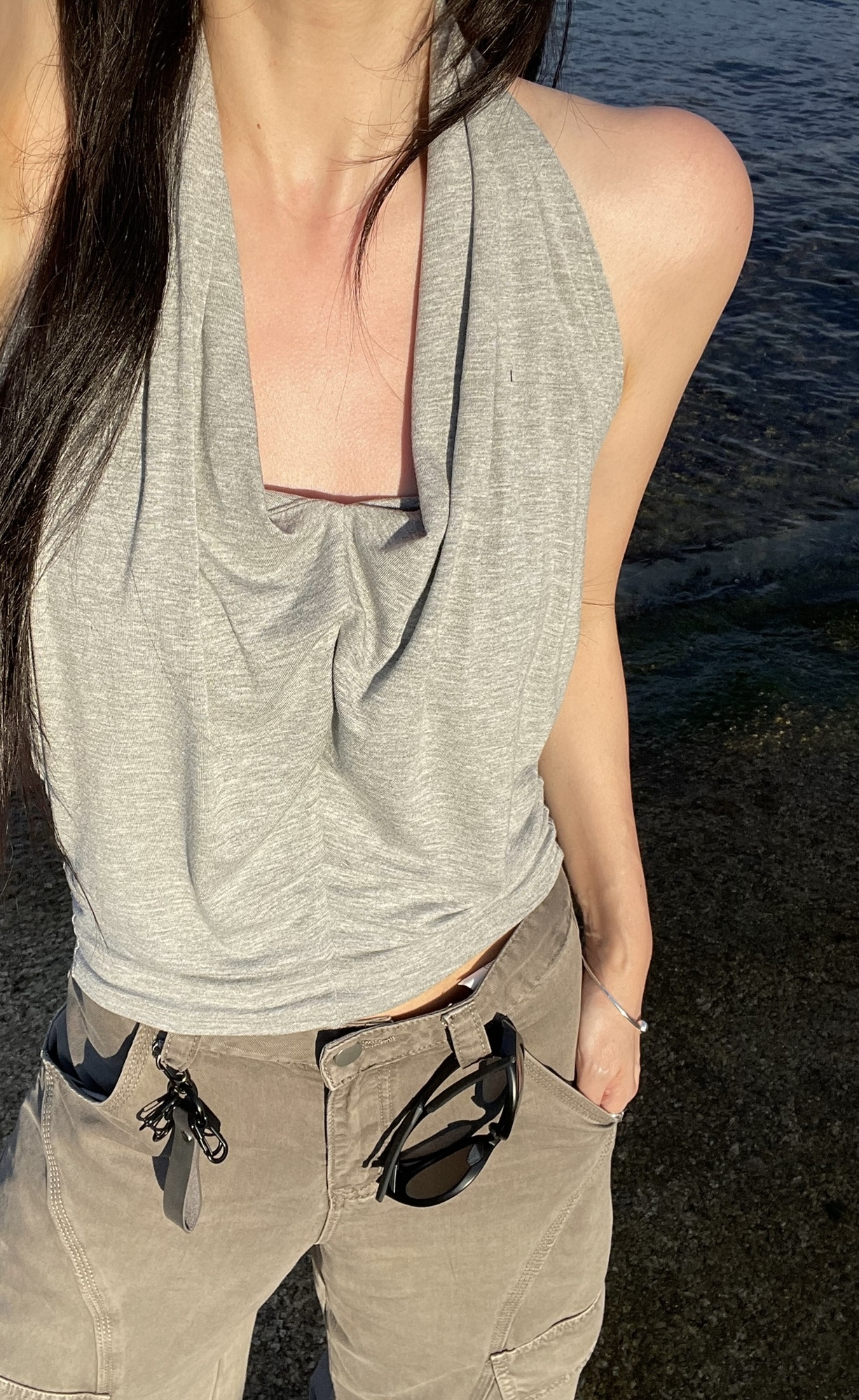 디자인 포인트는 홀터형 네크라인의 드레이프 처리입니다. 목 뒤로 감아 묶는 전형적 홀터가 아닌 네크라인 부분을 넉넉히 잡아 자연스러운 셔링(주름)과 V슬릿이 생기도록 만든 형태로 목선과 쇄골을 돋보이게 해줍니다. 중앙에 보이는 심 중심 봉제선이 있어 심플하지만 세련된 실루엣을 살려주고, 넓은 암홀 덕분에 활동성이 좋습니다.