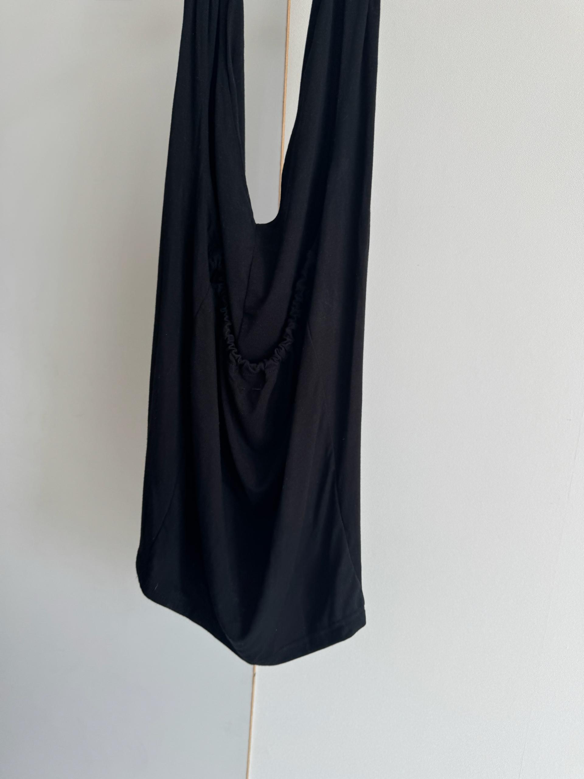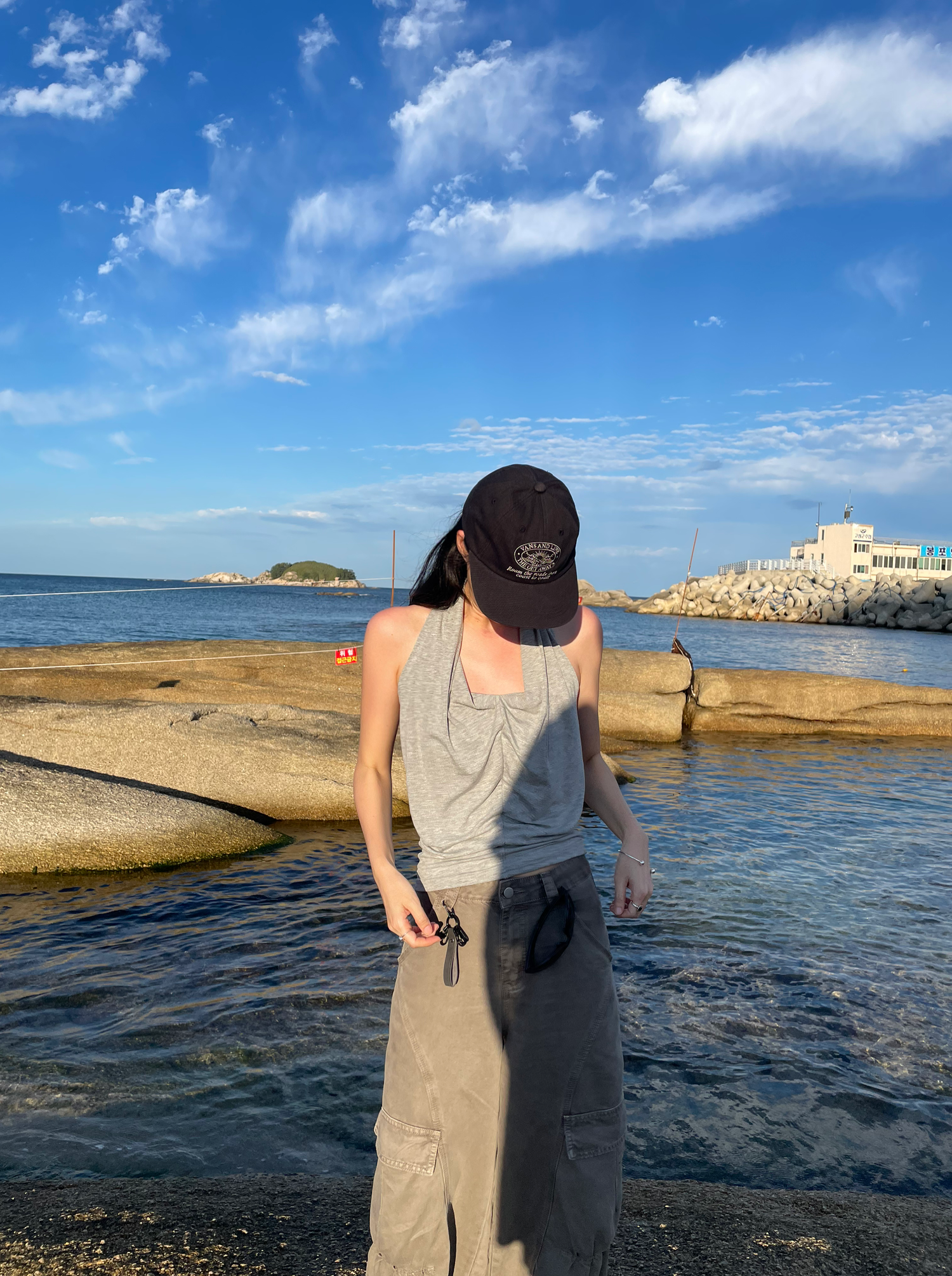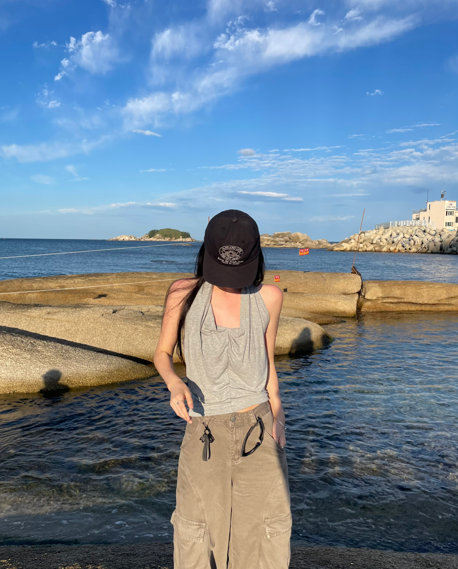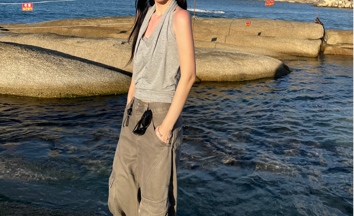 디자인 포인트는 홀터형 네크라인의 드레이프 처리입니다. 목 뒤로 감아 묶는 전형적 홀터가 아닌 네크라인 부분을 넉넉히 잡아 자연스러운 셔링(주름)과 V슬릿이 생기도록 만든 형태로 목선과 쇄골을 돋보이게 해줍니다. 중앙에 보이는 심 중심 봉제선이 있어 심플하지만 세련된 실루엣을 살려주고, 넓은 암홀 덕분에 활동성이 좋습니다.