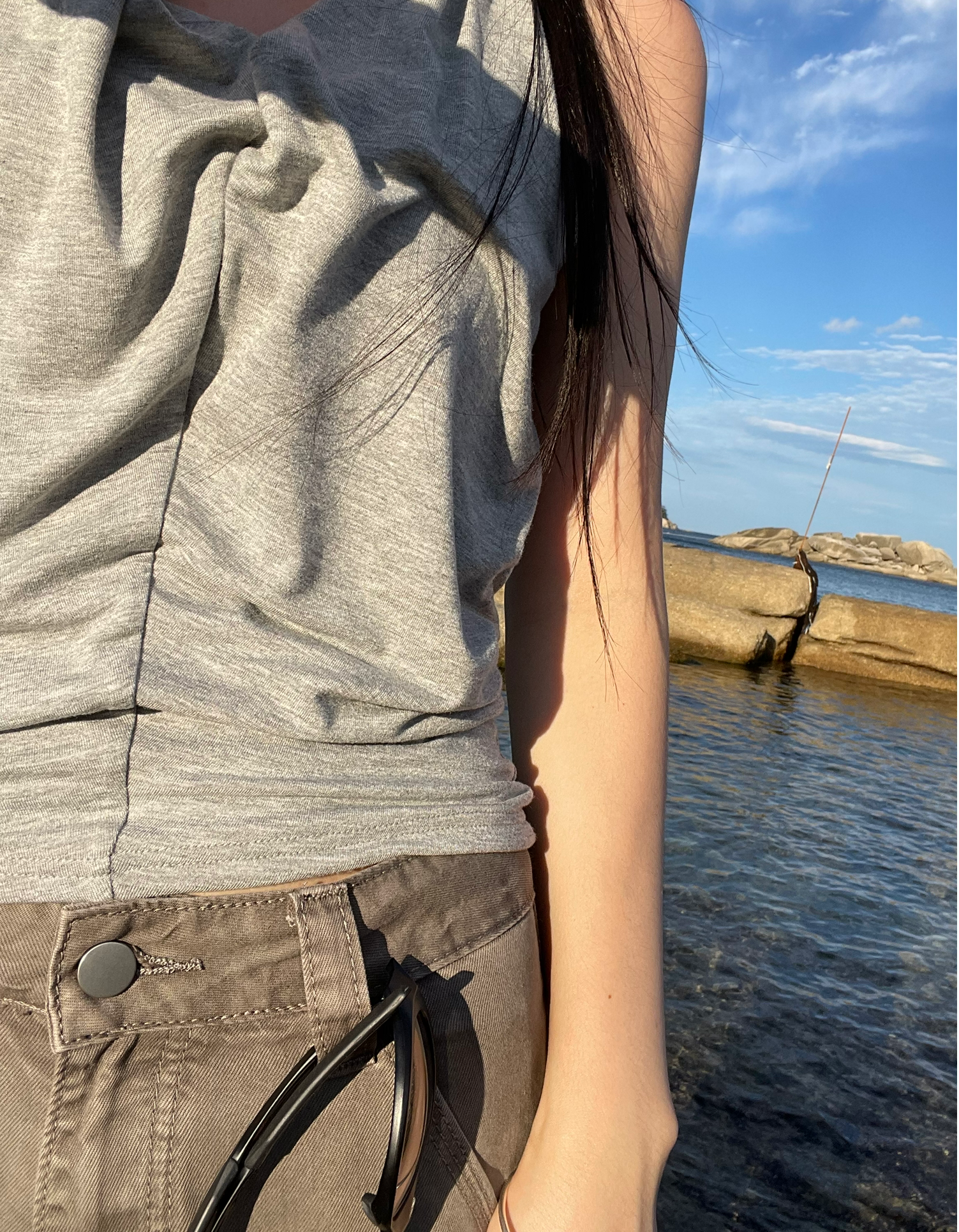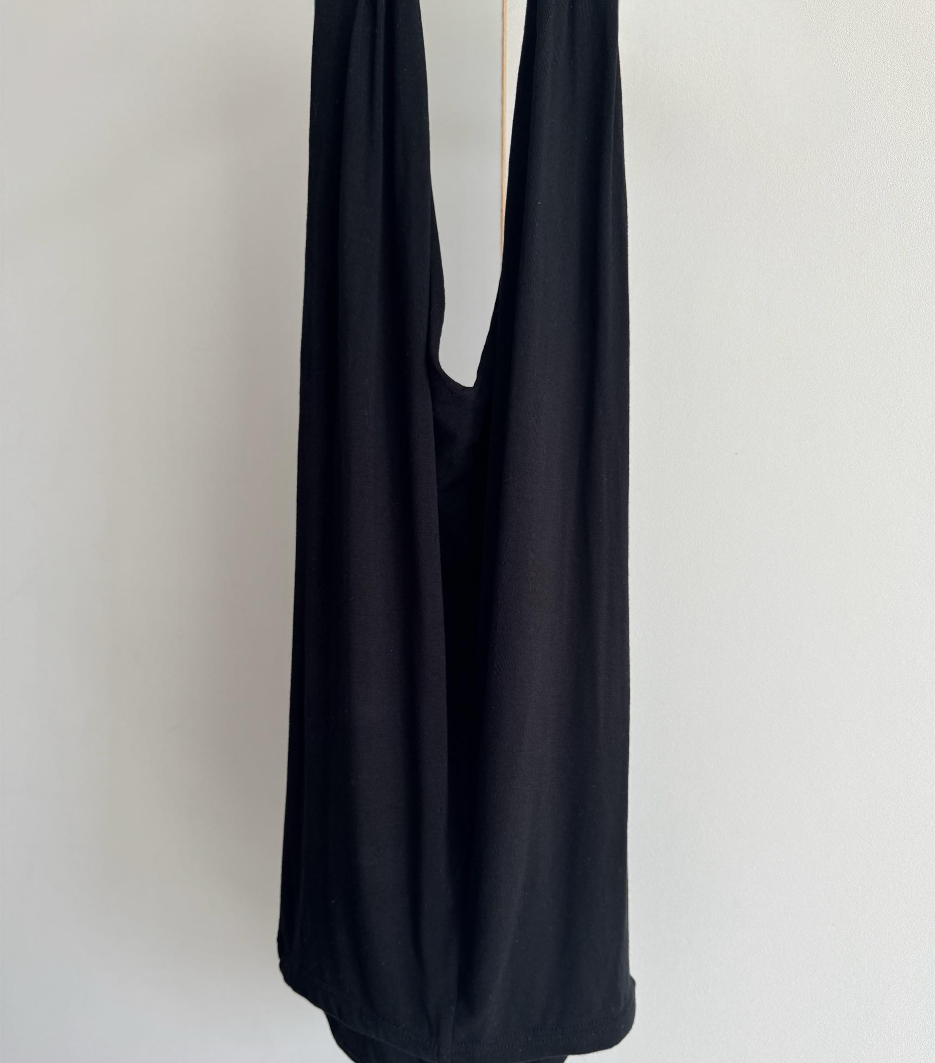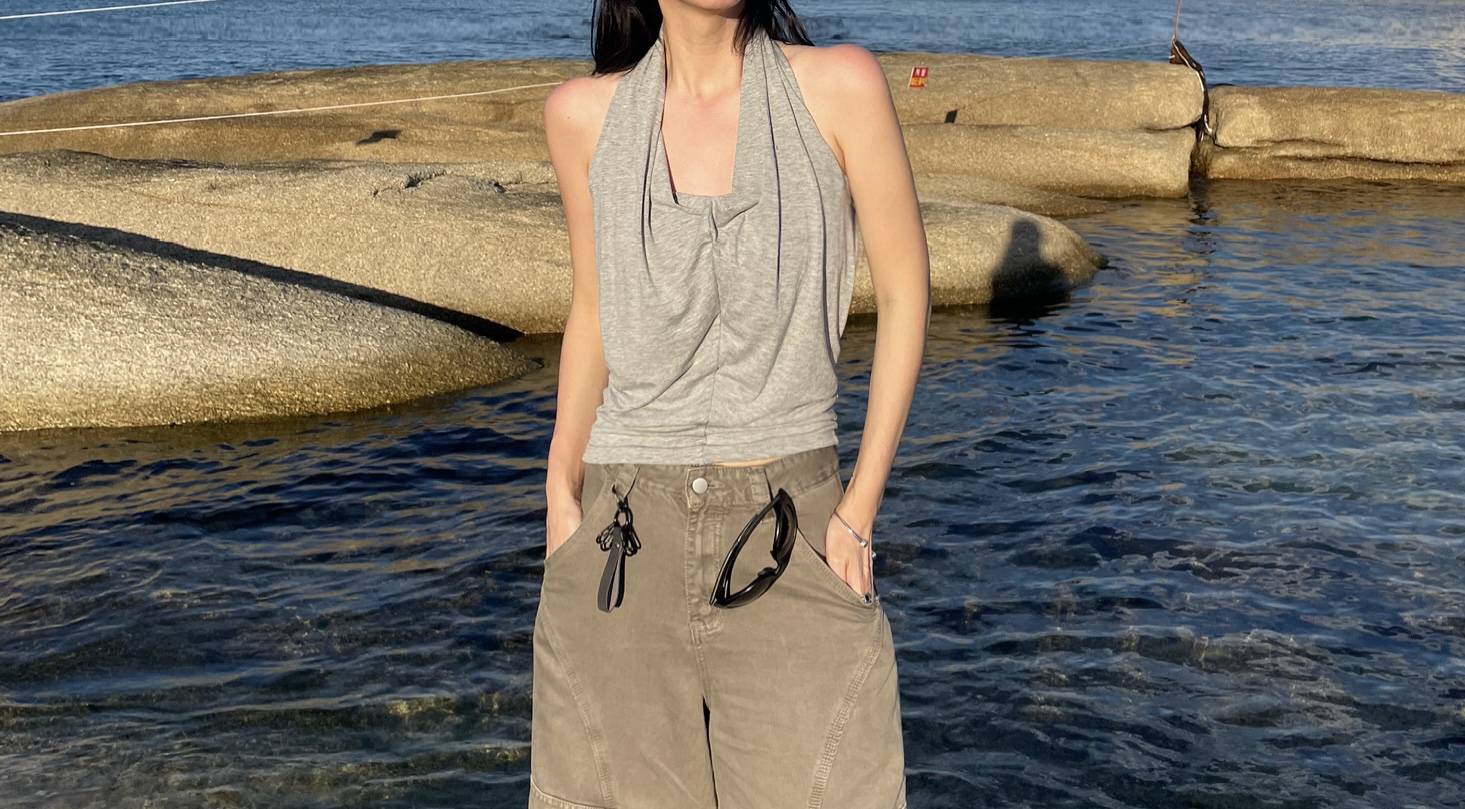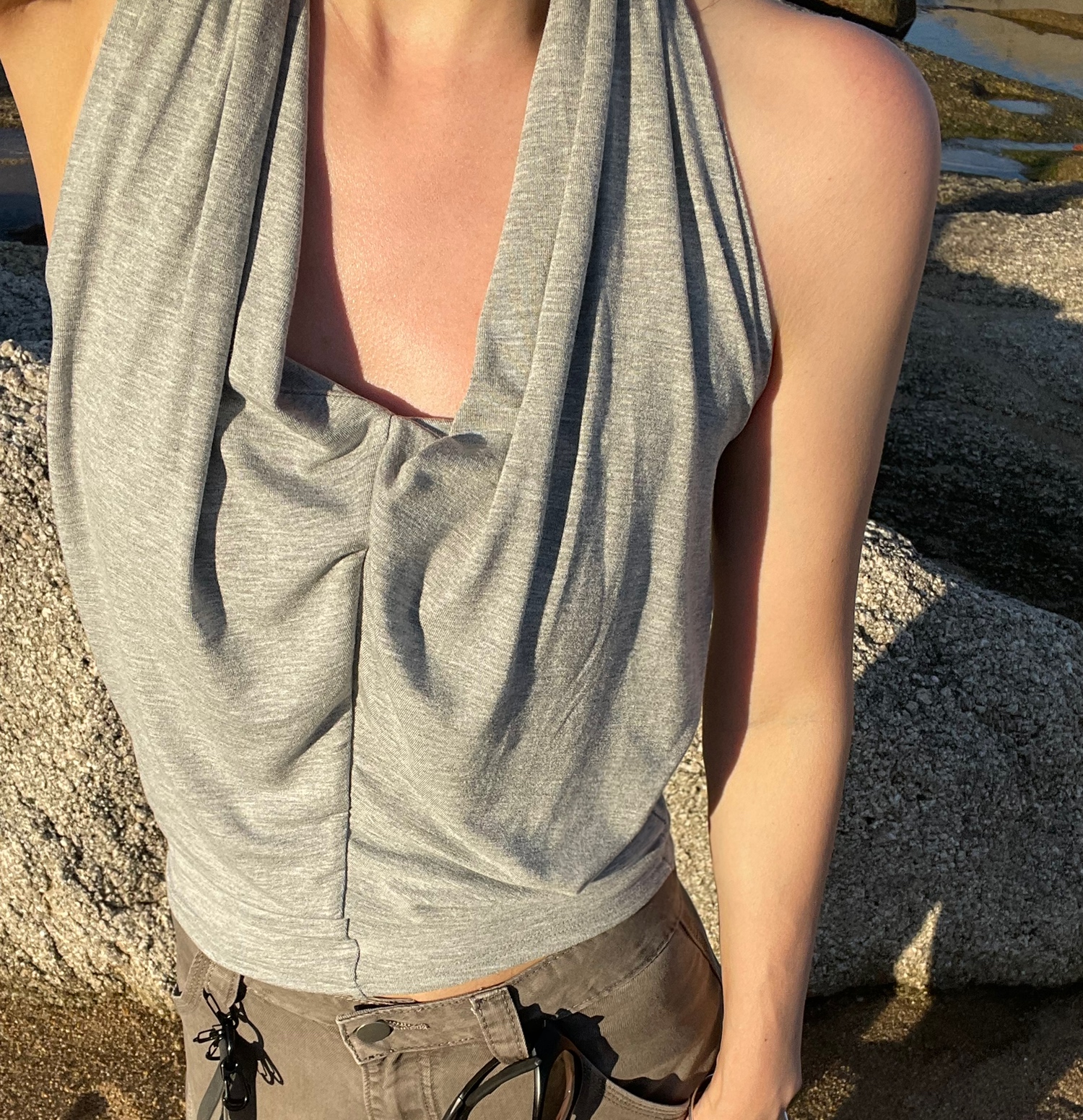 디자인 포인트는 홀터형 네크라인의 드레이프 처리입니다. 목 뒤로 감아 묶는 전형적 홀터가 아닌 네크라인 부분을 넉넉히 잡아 자연스러운 셔링(주름)과 V슬릿이 생기도록 만든 형태로 목선과 쇄골을 돋보이게 해줍니다. 중앙에 보이는 심 중심 봉제선이 있어 심플하지만 세련된 실루엣을 살려주고, 넓은 암홀 덕분에 활동성이 좋습니다.