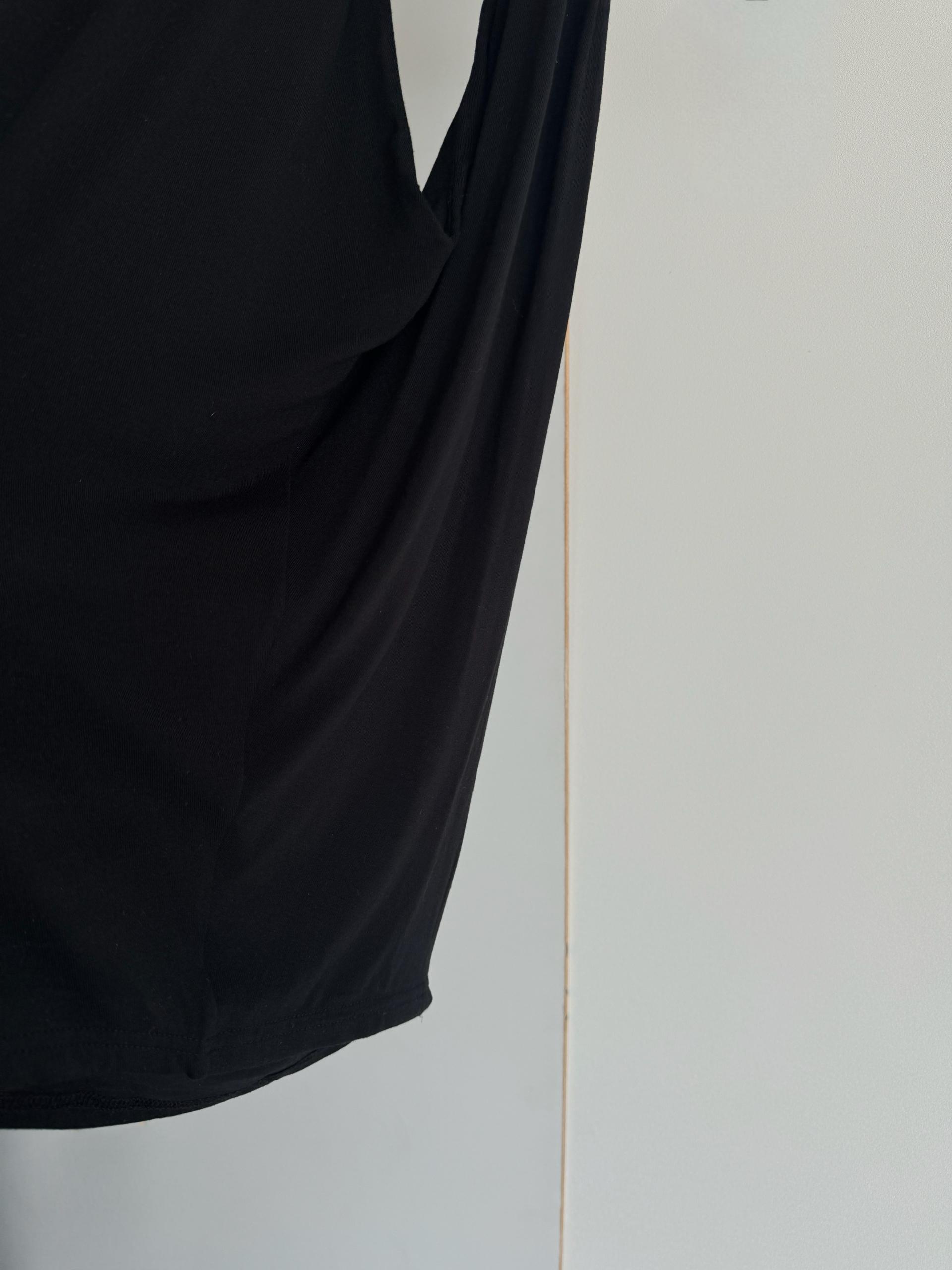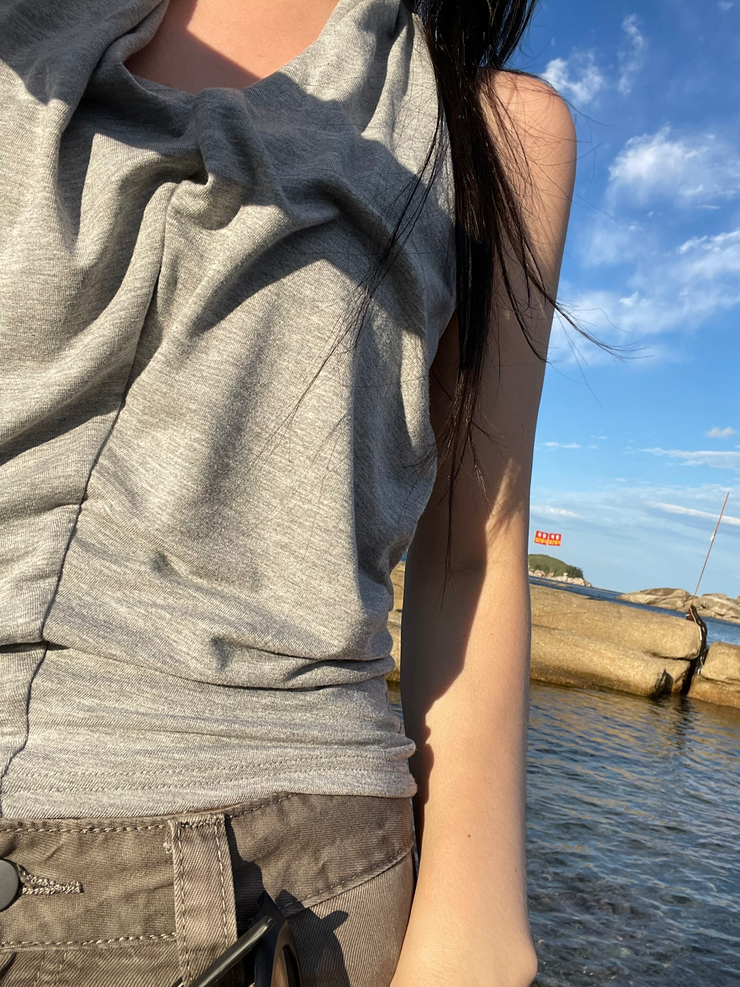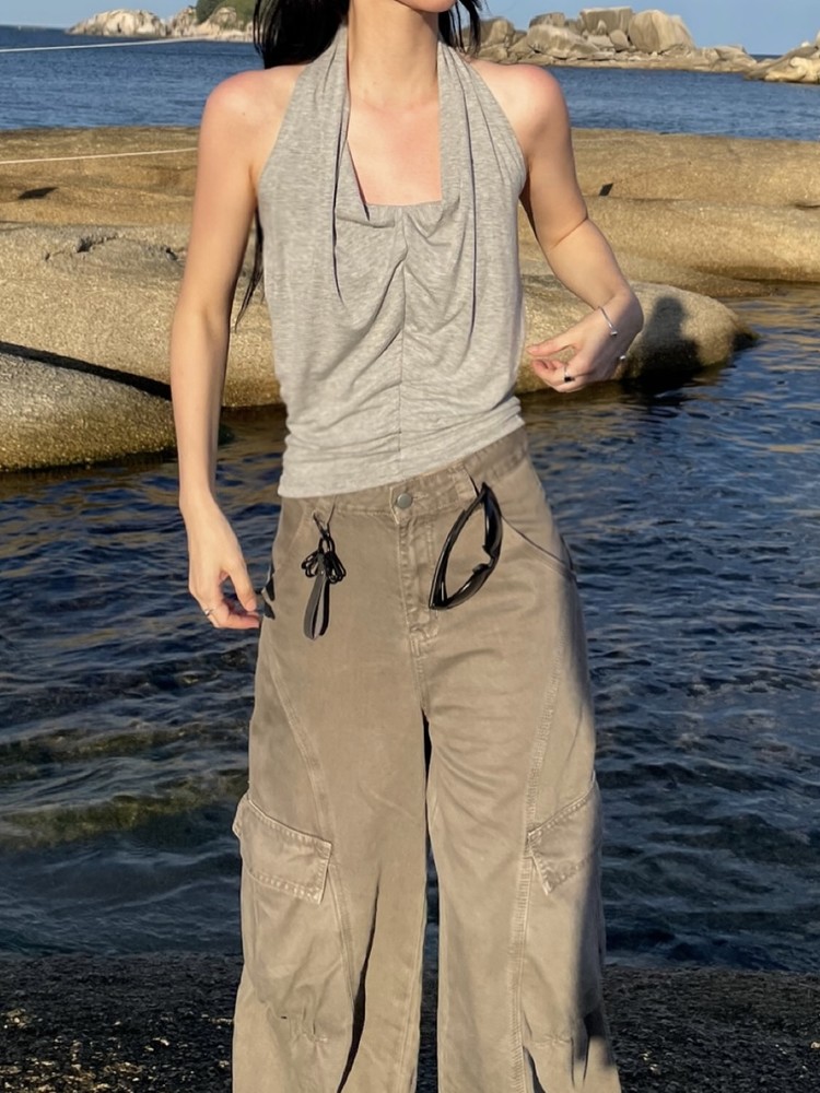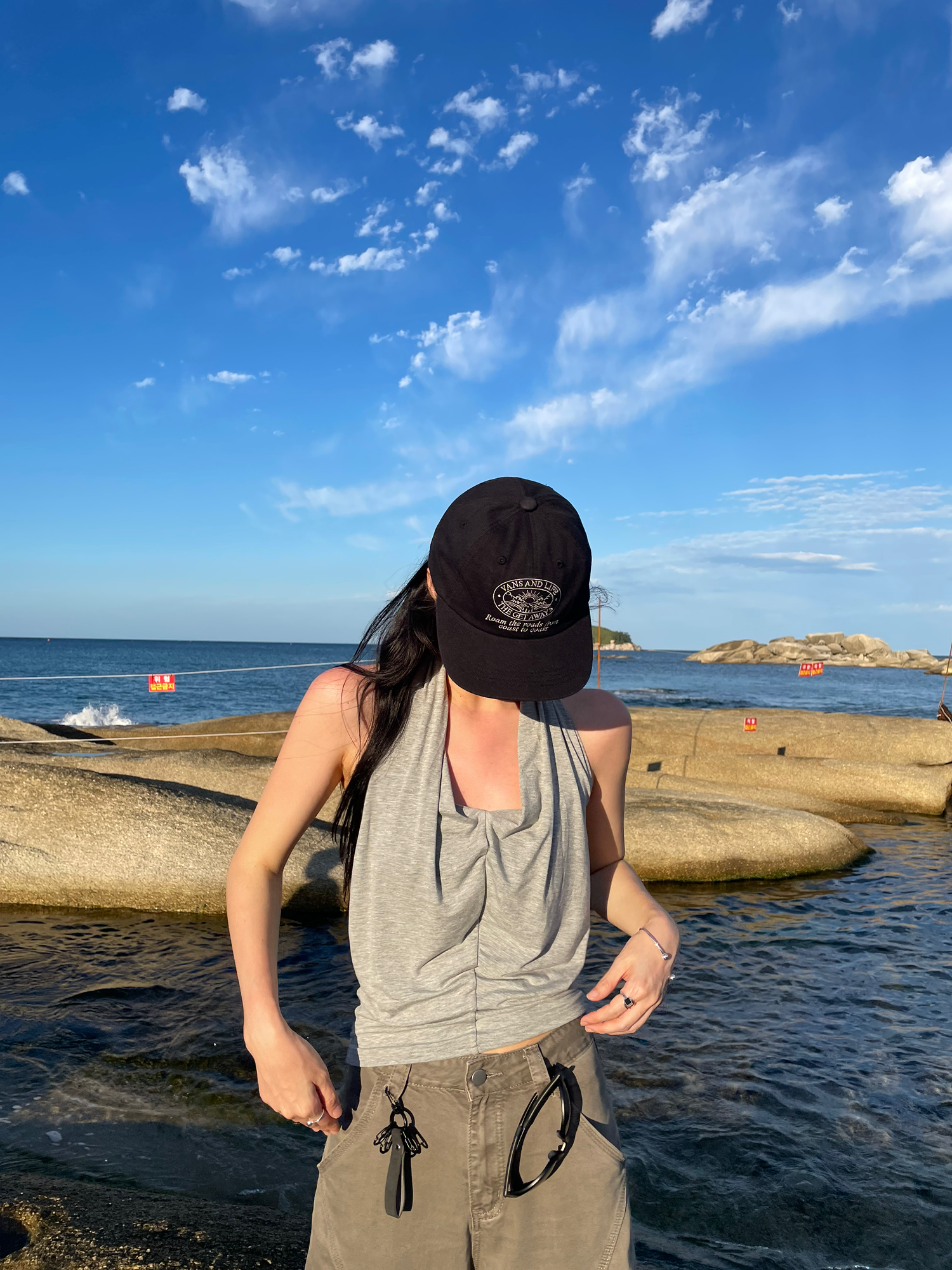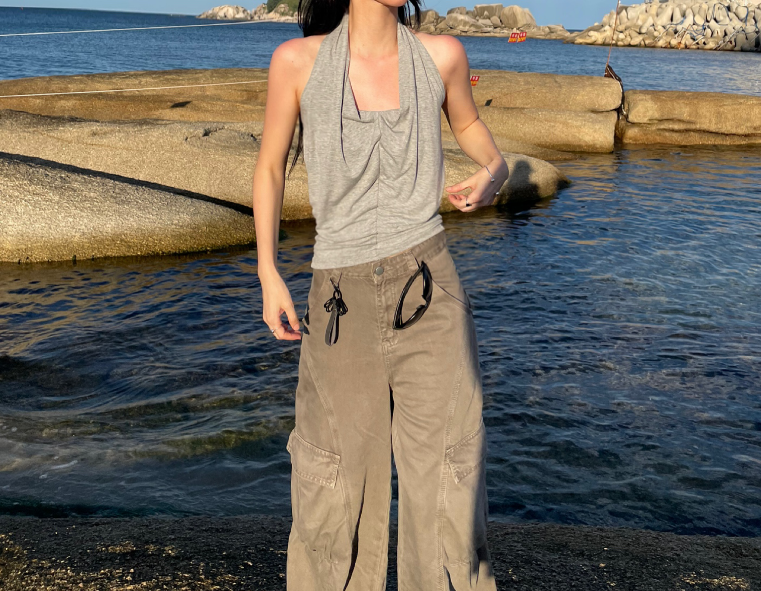 디자인 포인트는 홀터형 네크라인의 드레이프 처리입니다. 목 뒤로 감아 묶는 전형적 홀터가 아닌 네크라인 부분을 넉넉히 잡아 자연스러운 셔링(주름)과 V슬릿이 생기도록 만든 형태로 목선과 쇄골을 돋보이게 해줍니다. 중앙에 보이는 심 중심 봉제선이 있어 심플하지만 세련된 실루엣을 살려주고, 넓은 암홀 덕분에 활동성이 좋습니다.