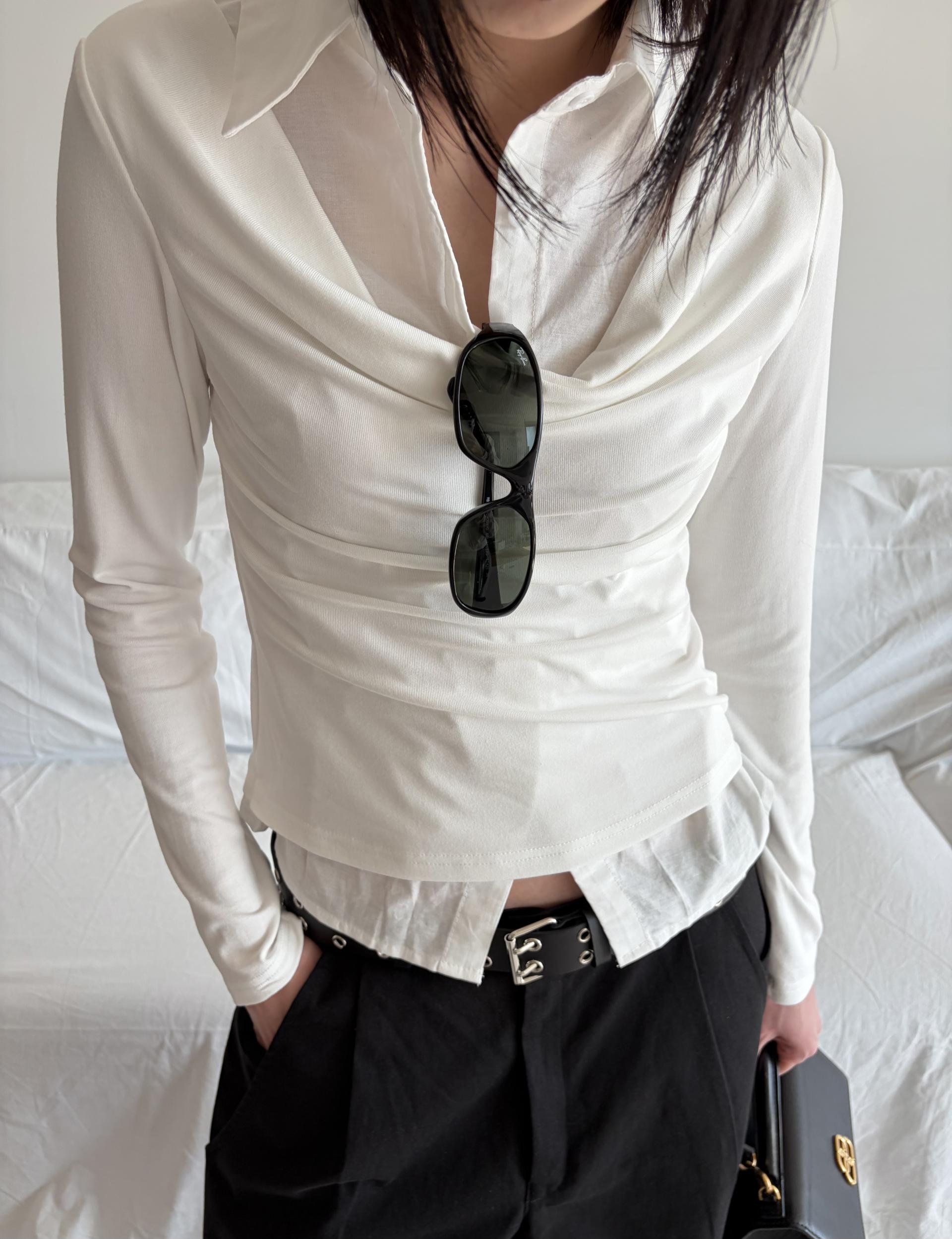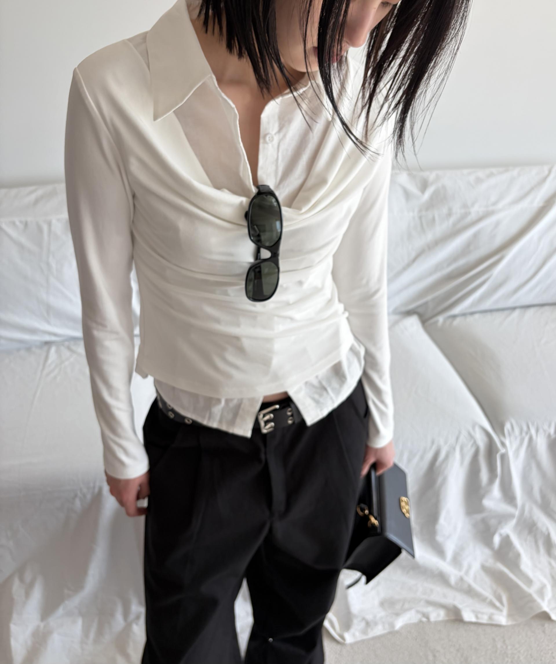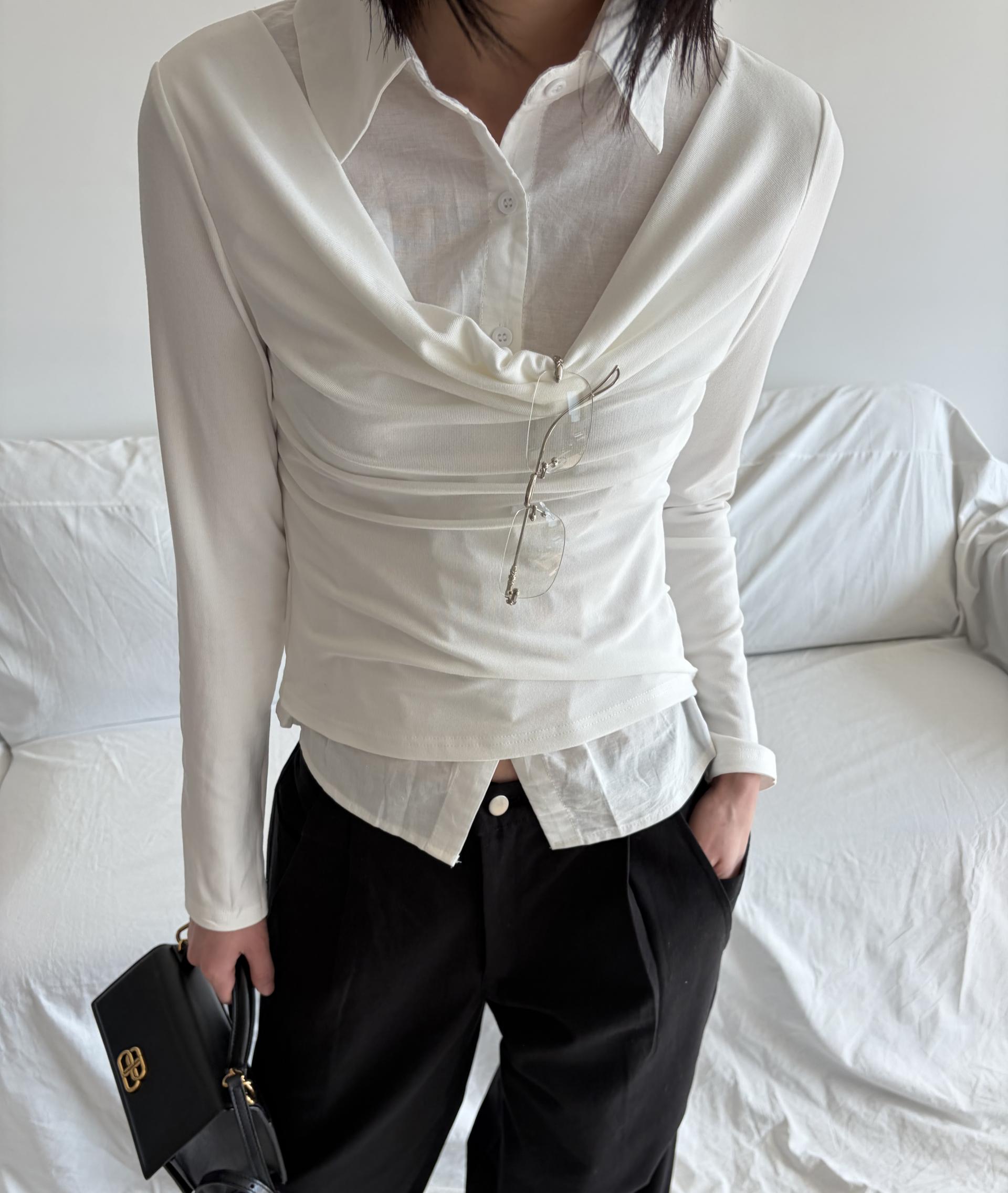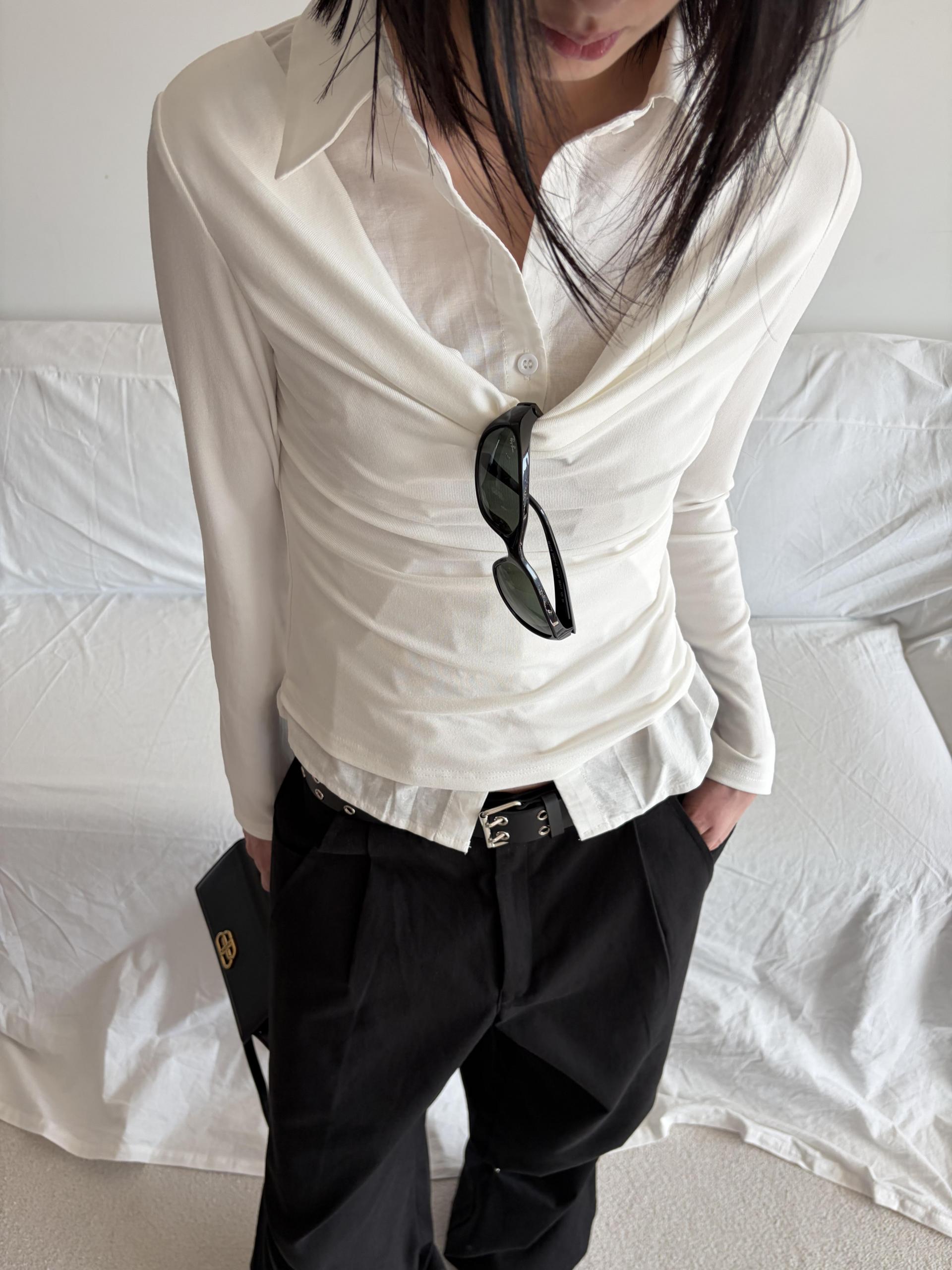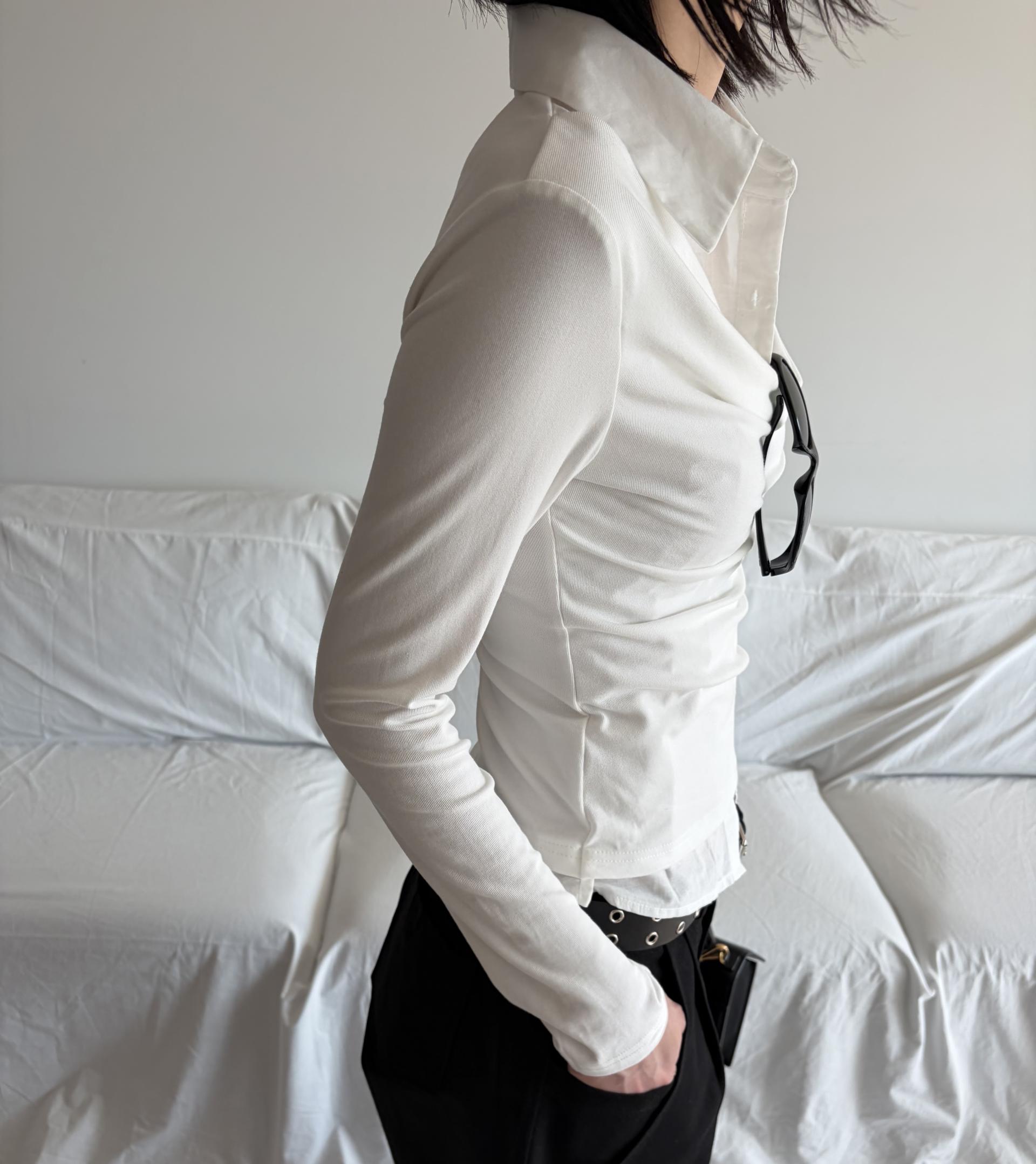 - 겹쳐 입은 듯한 셔츠 카라 디테일로 미니멀한무드와 트렌디함을 동시에