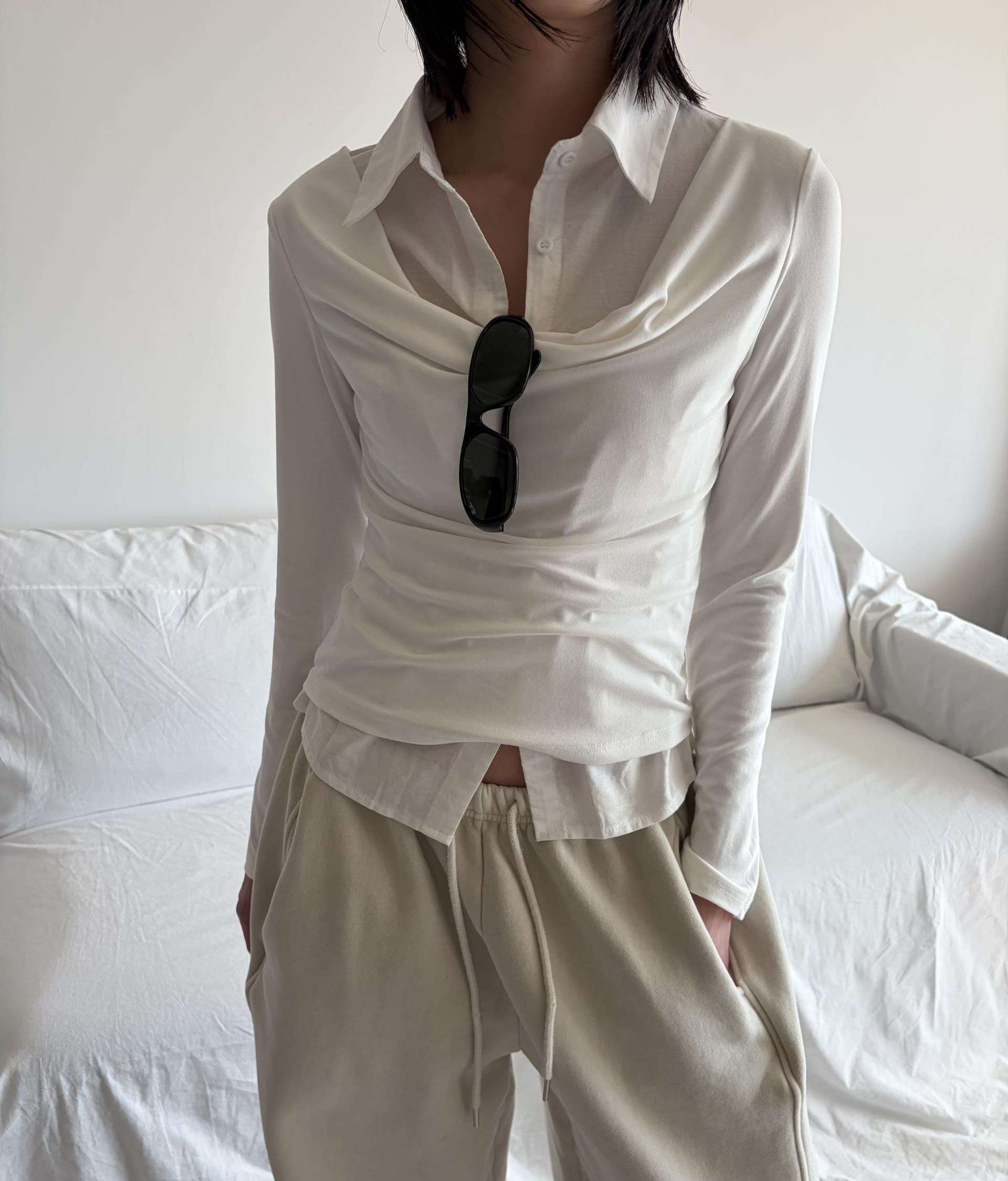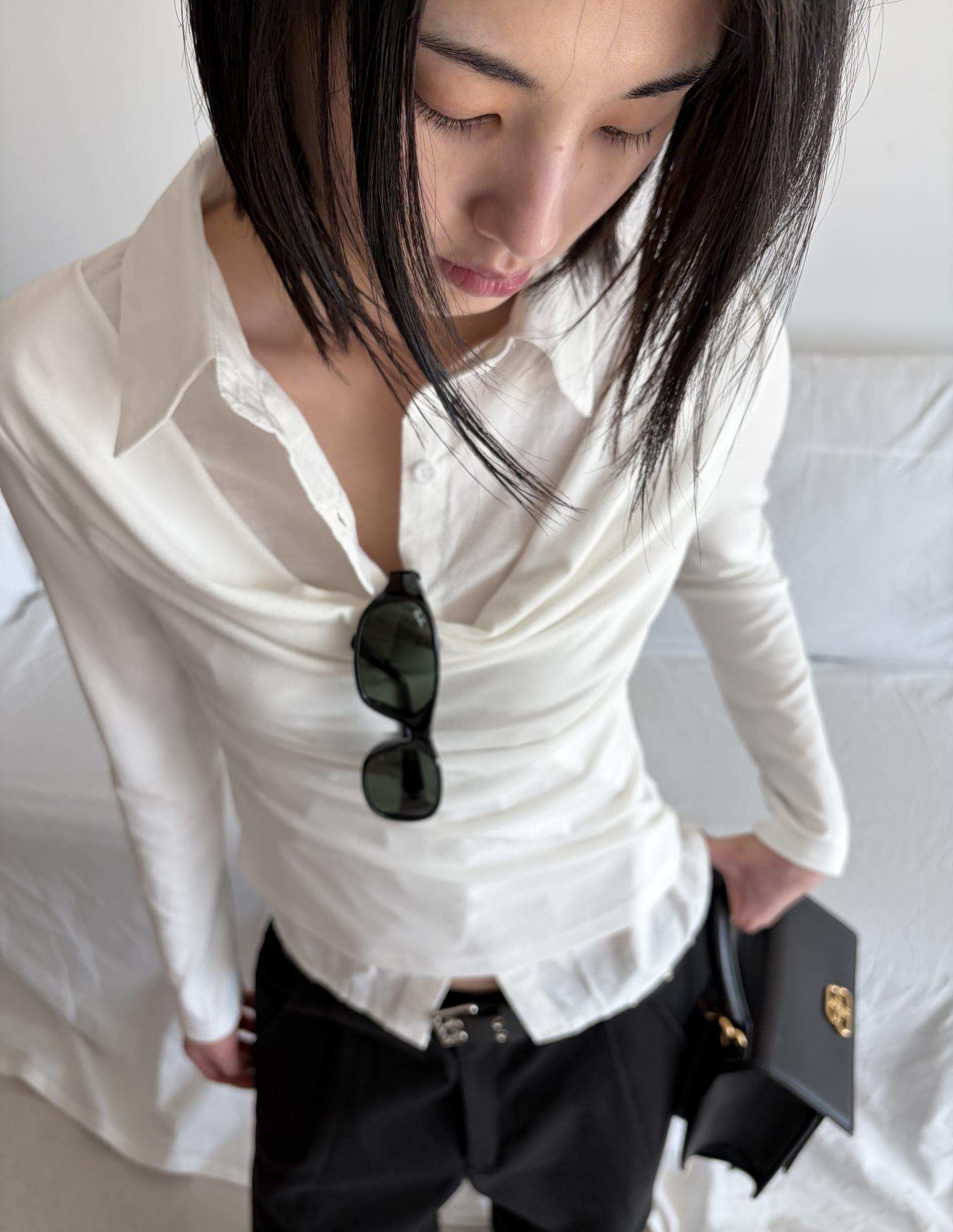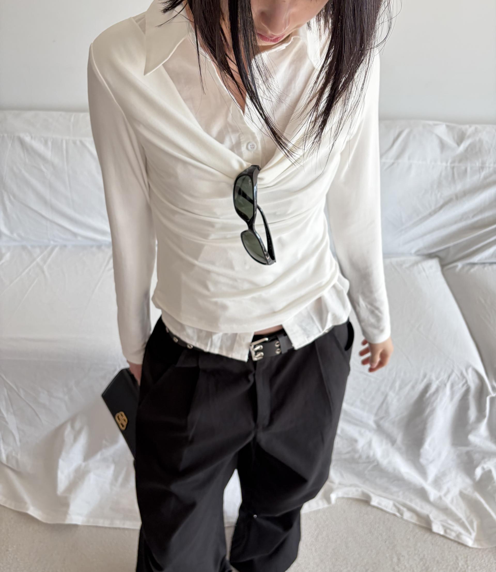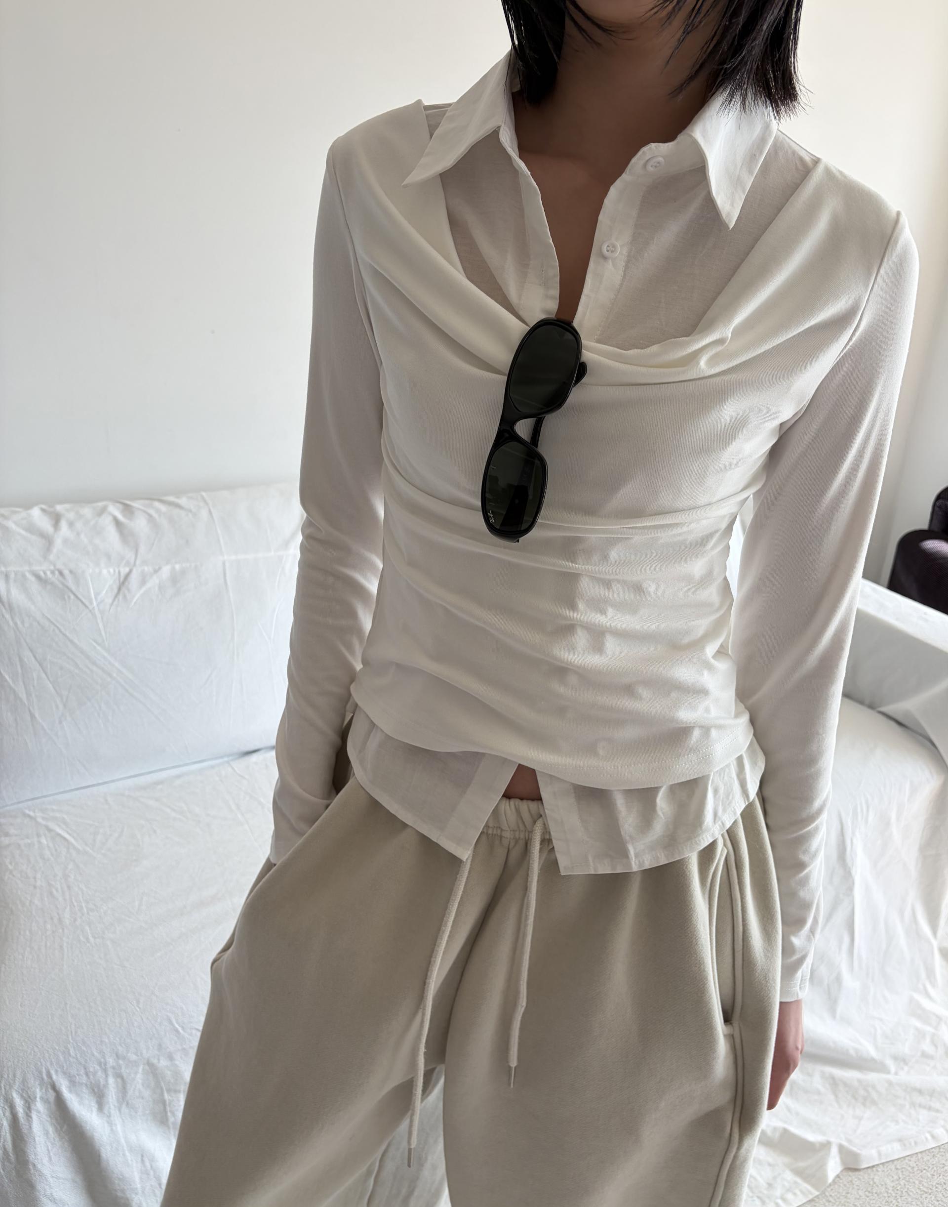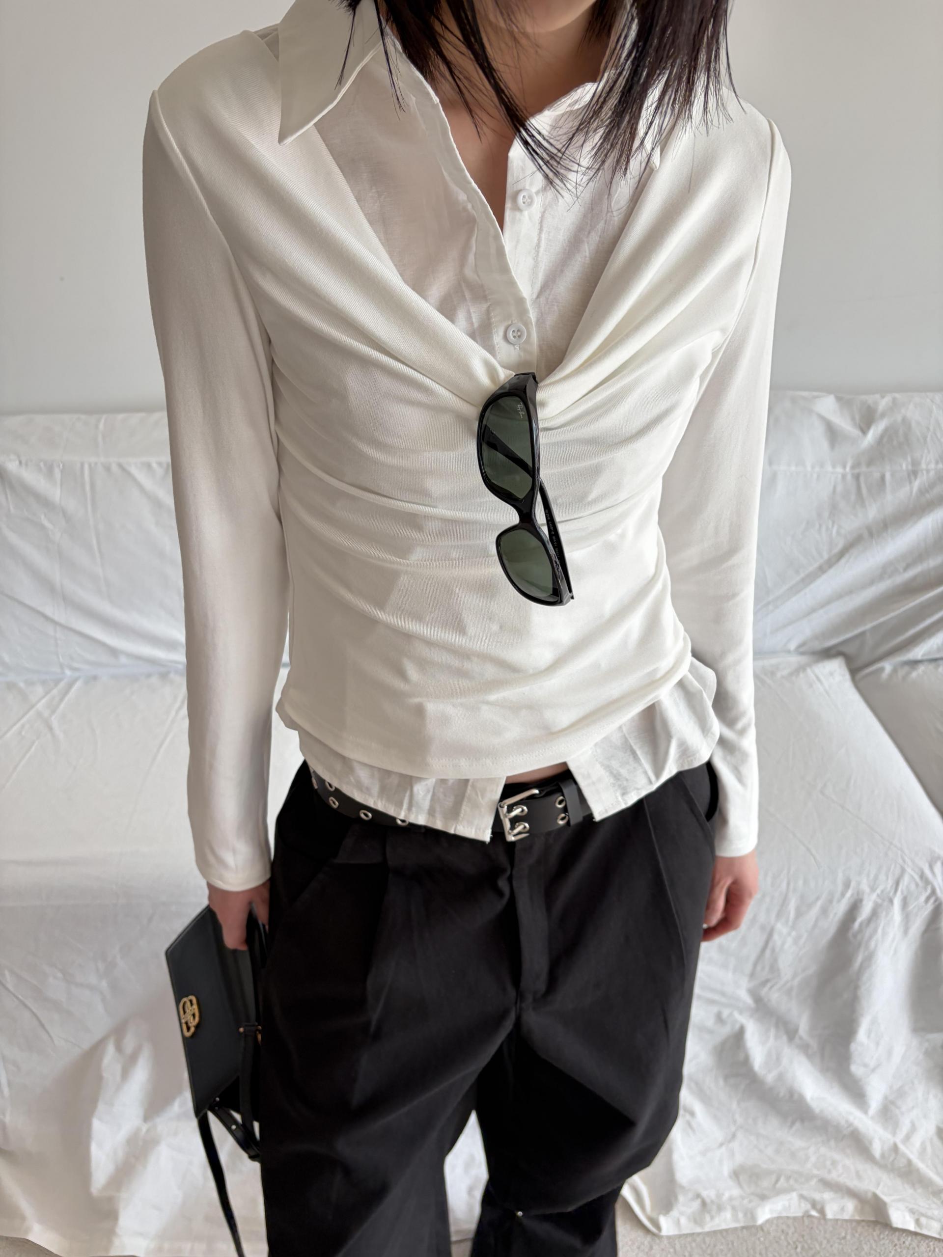 - 겹쳐 입은 듯한 셔츠 카라 디테일로 미니멀한무드와 트렌디함을 동시에