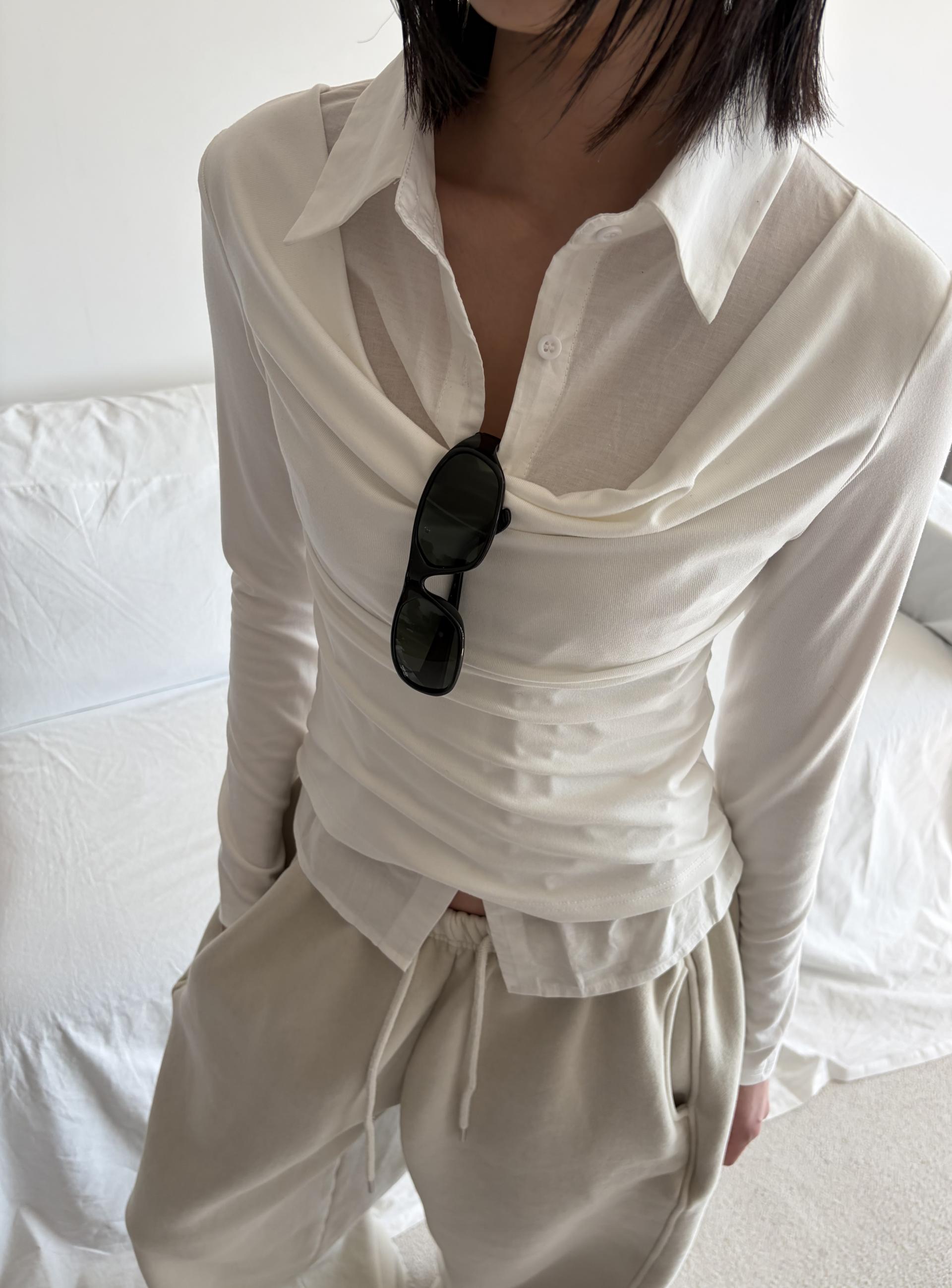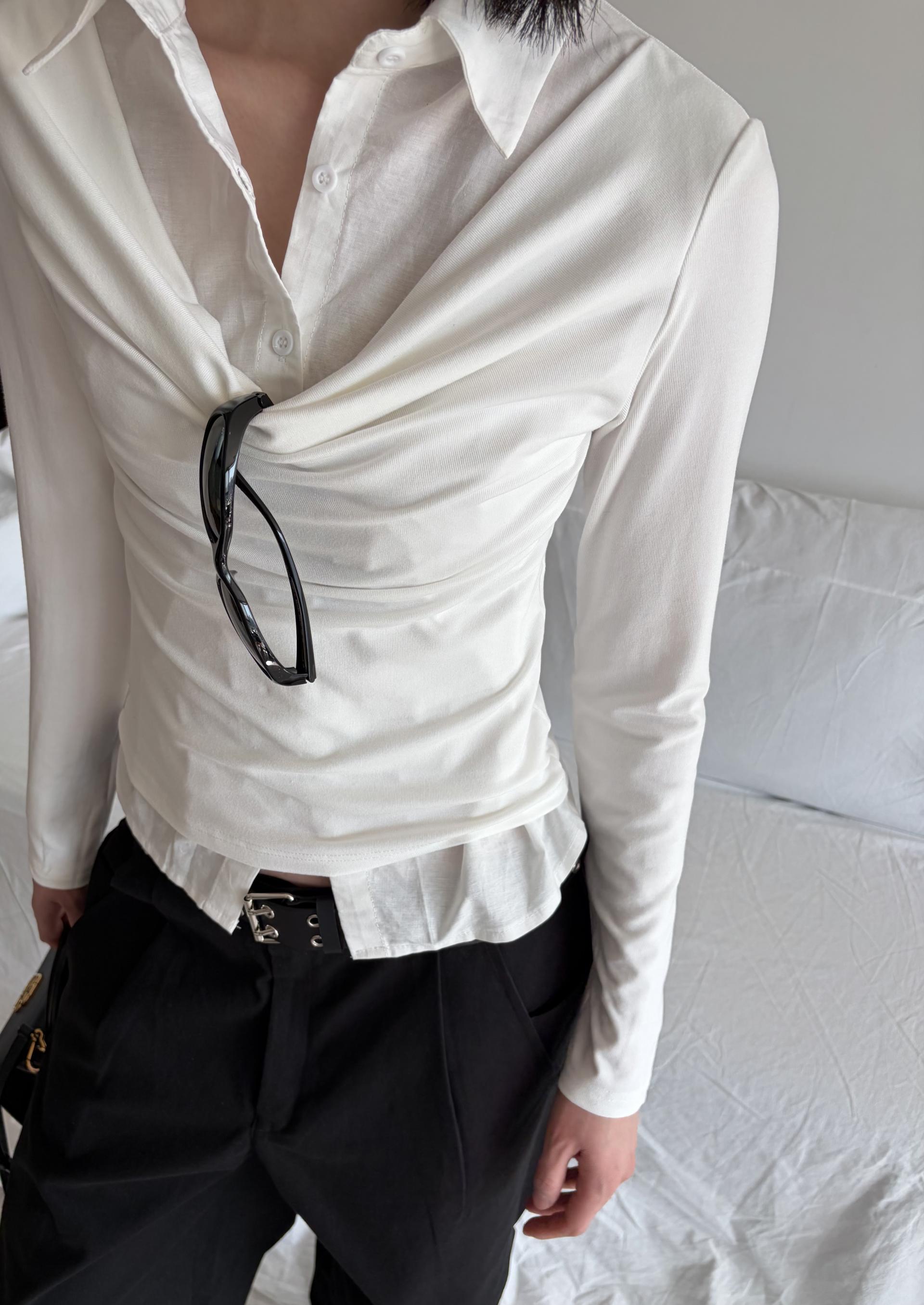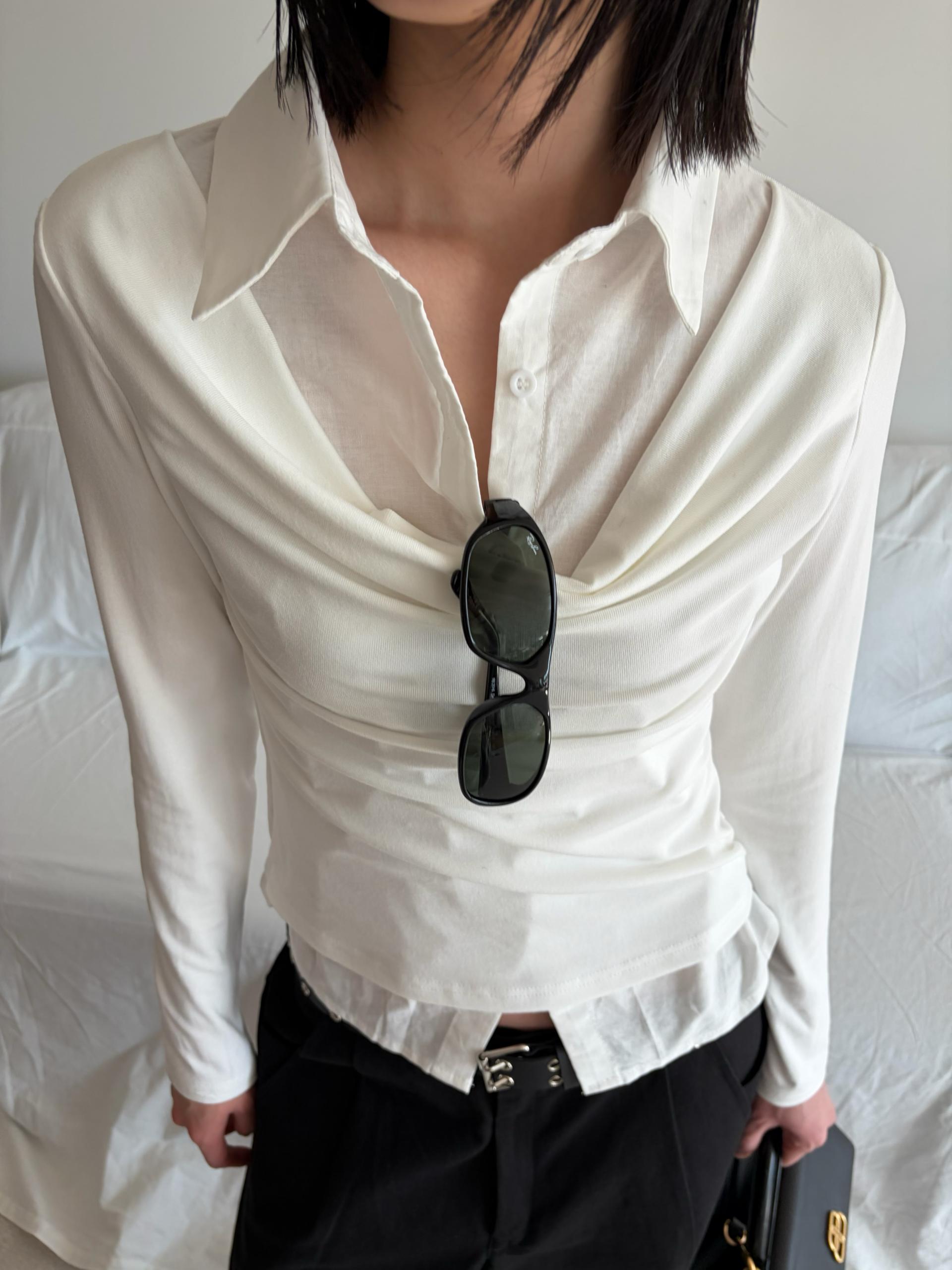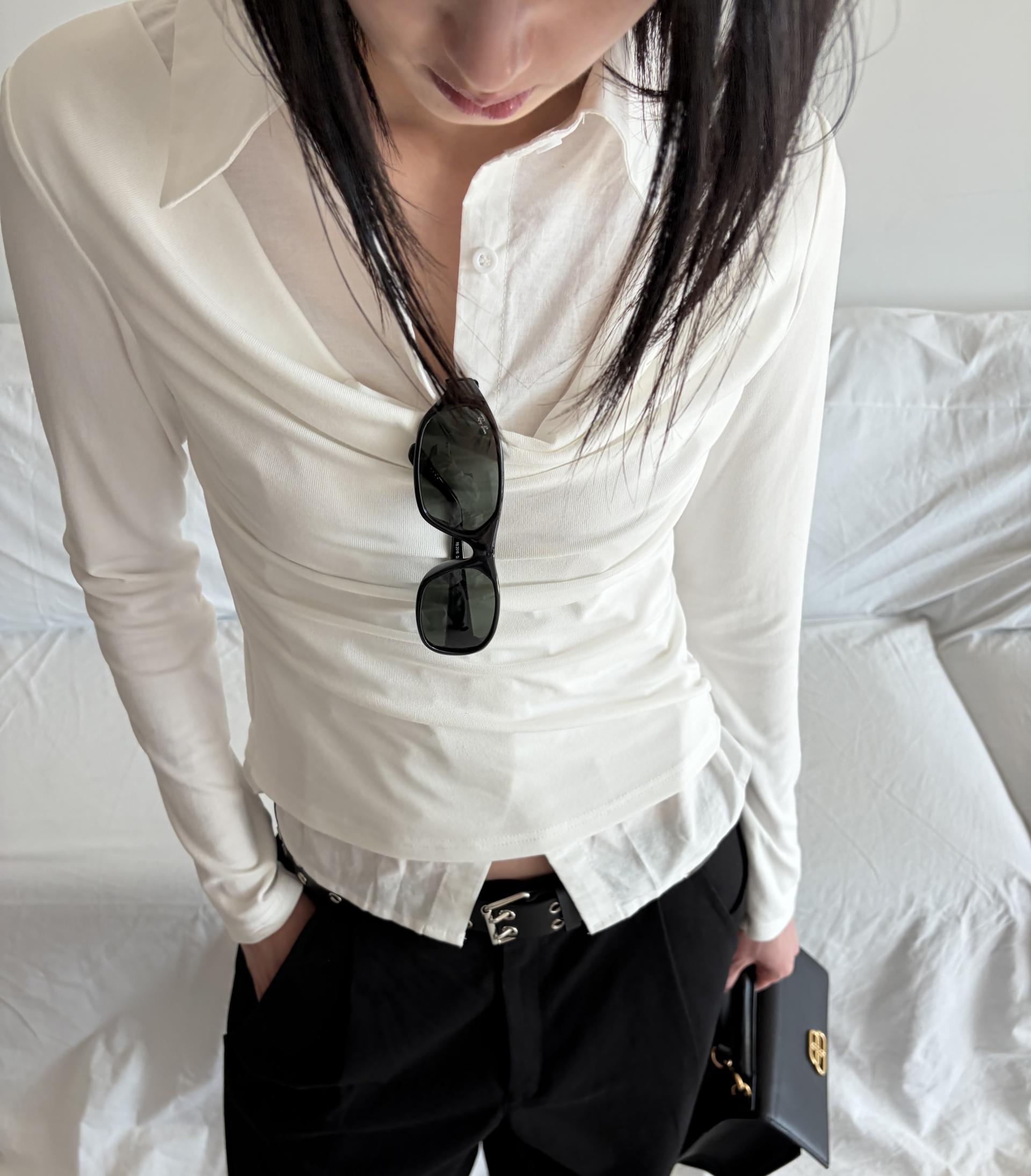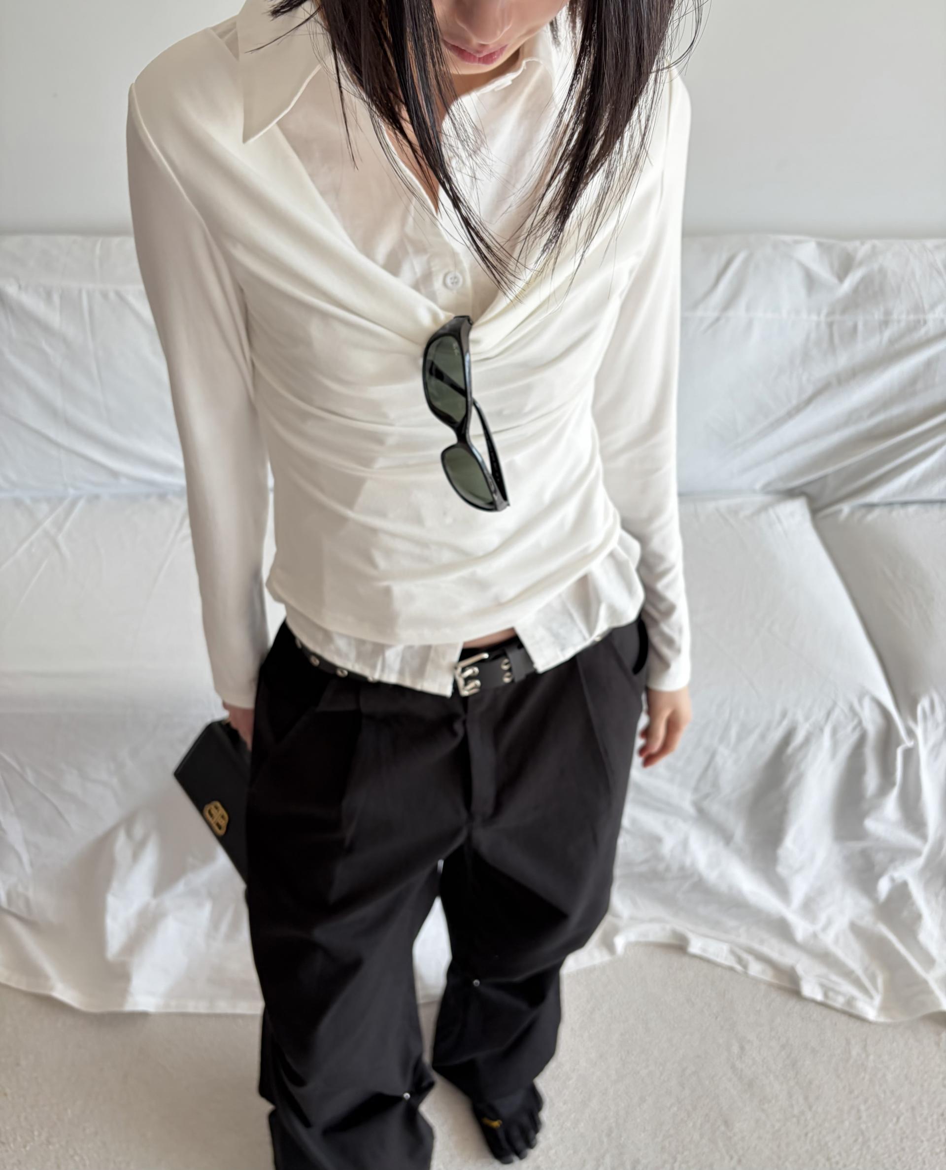 - 겹쳐 입은 듯한 셔츠 카라 디테일로 미니멀한무드와 트렌디함을 동시에