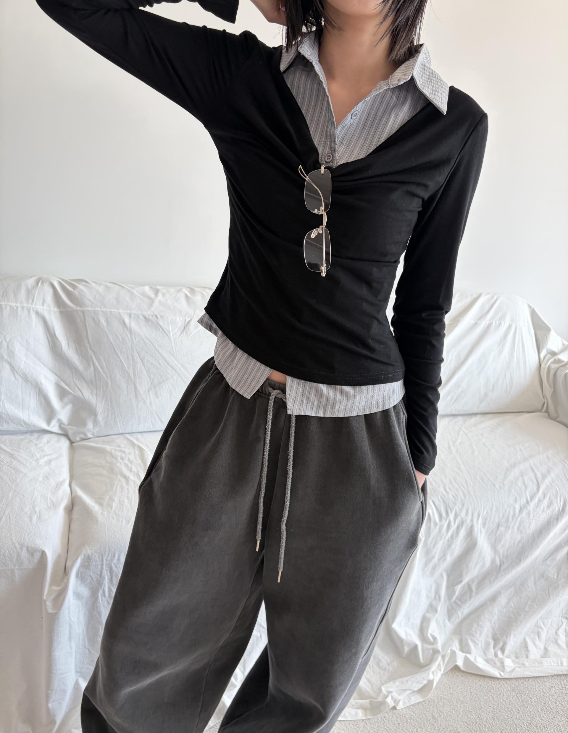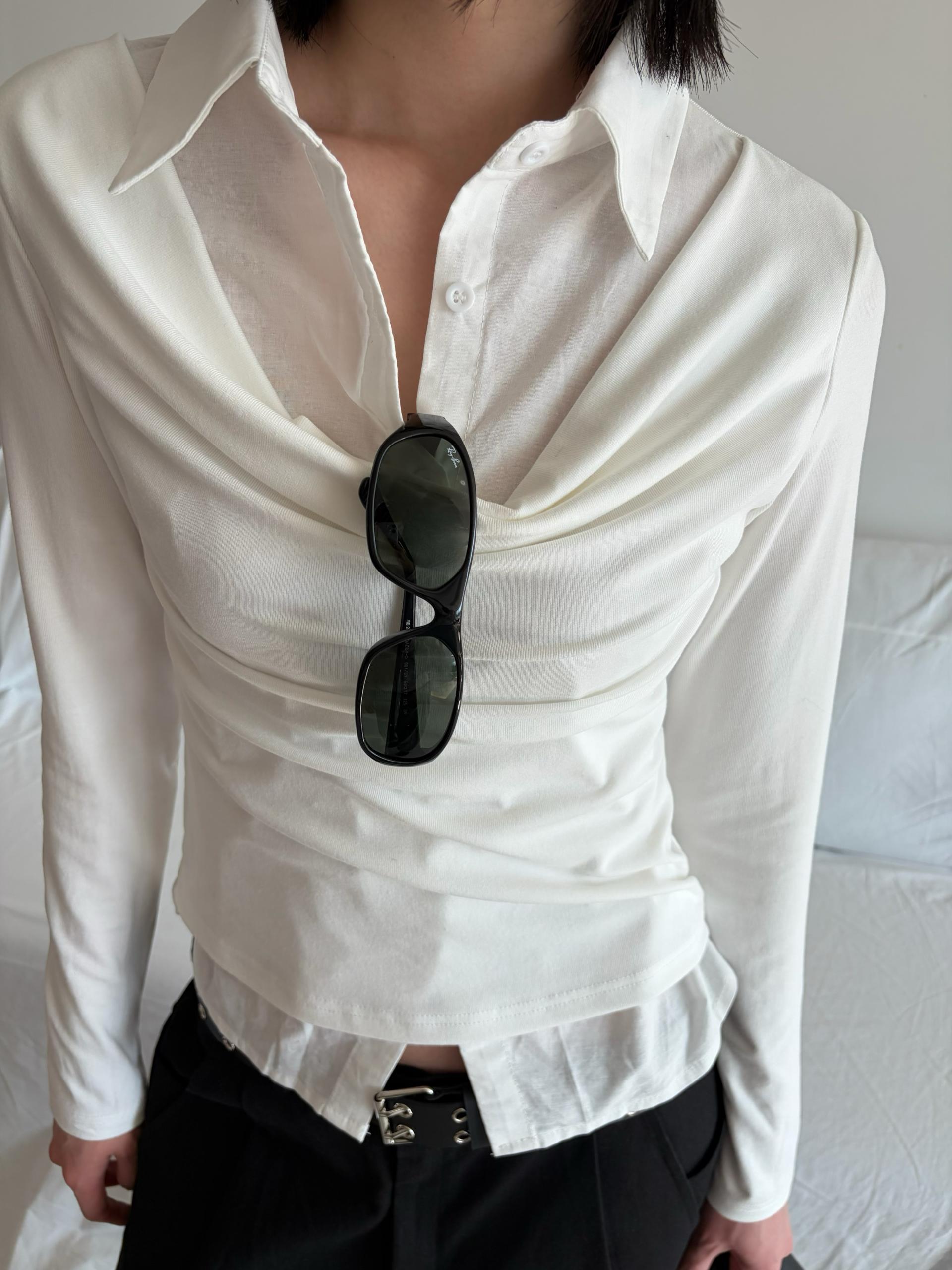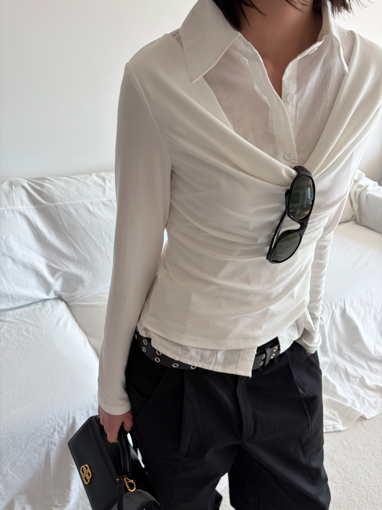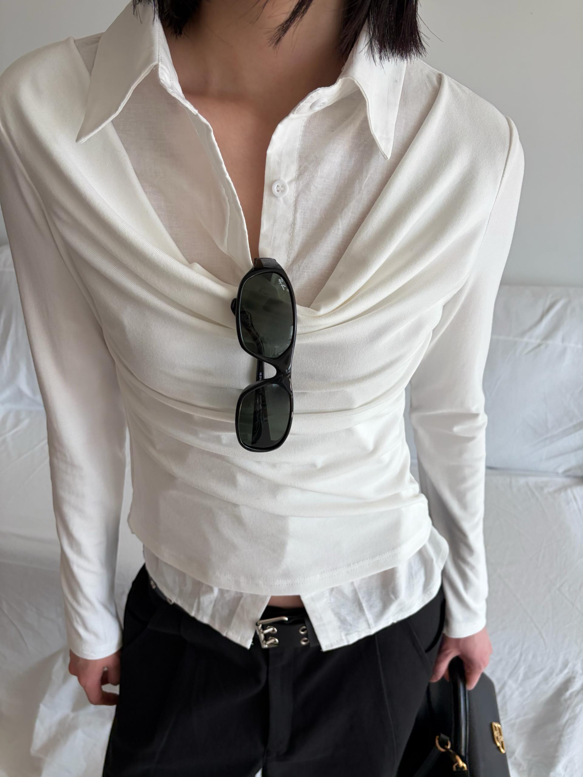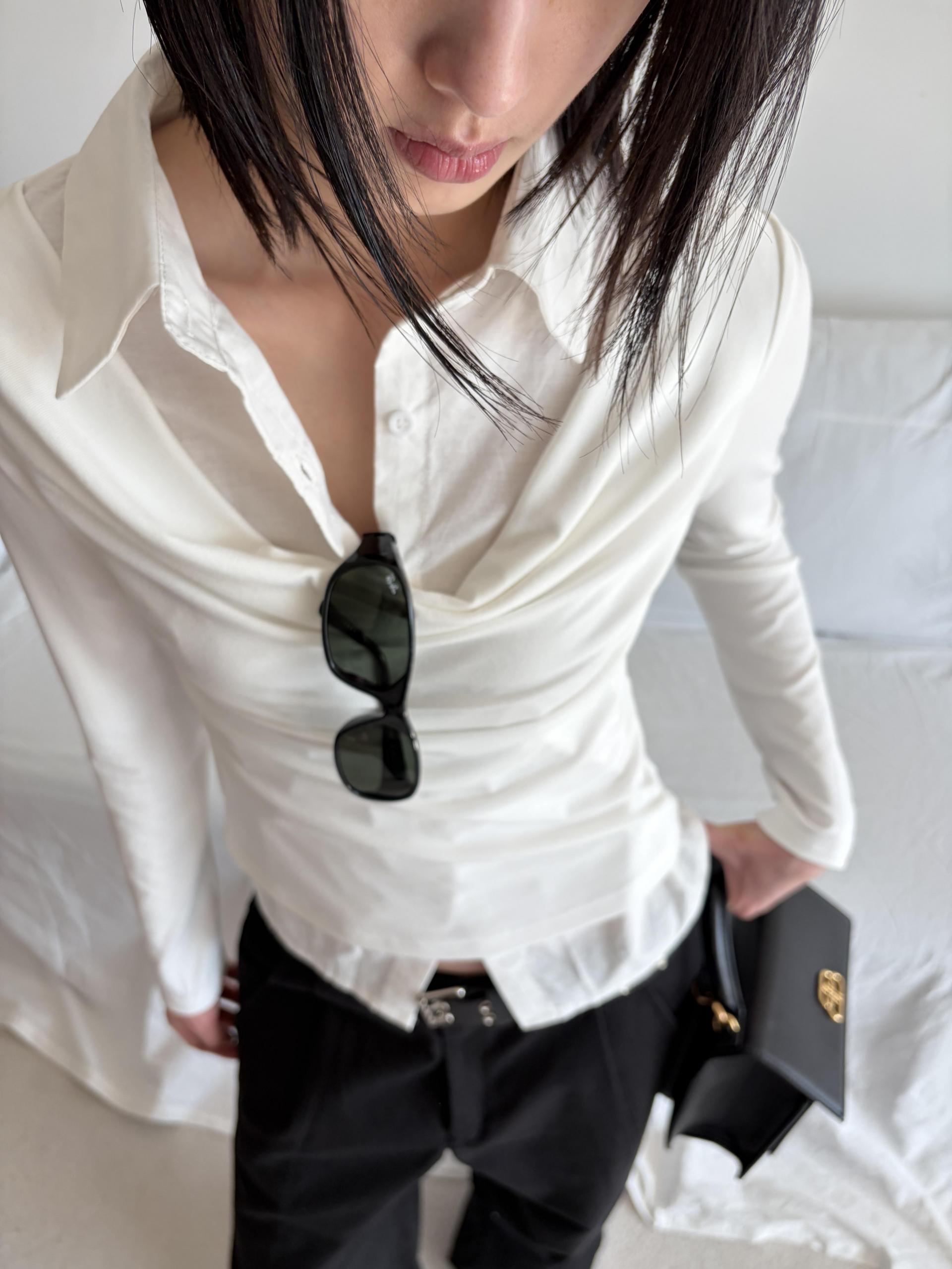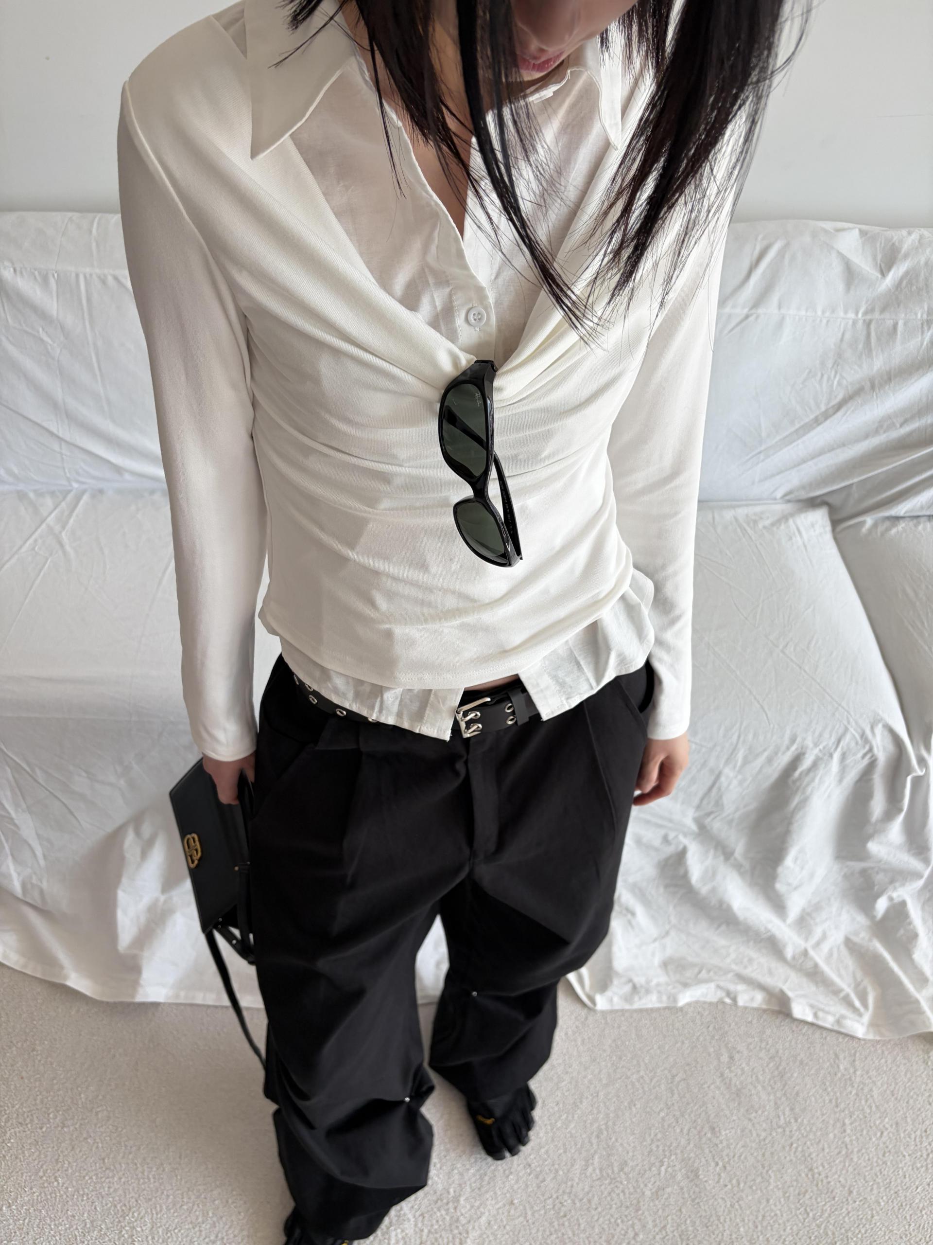 - 겹쳐 입은 듯한 셔츠 카라 디테일로 미니멀한무드와 트렌디함을 동시에