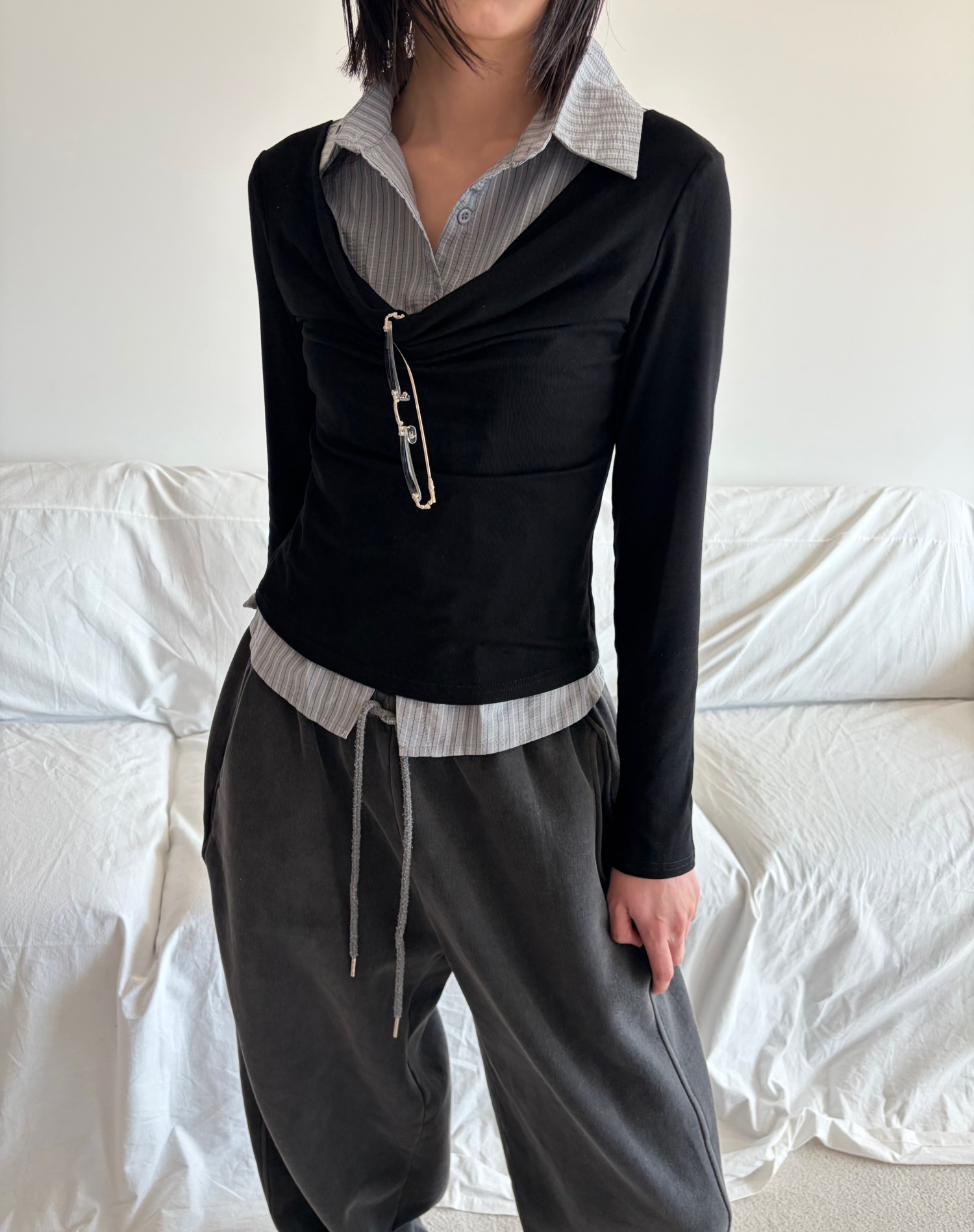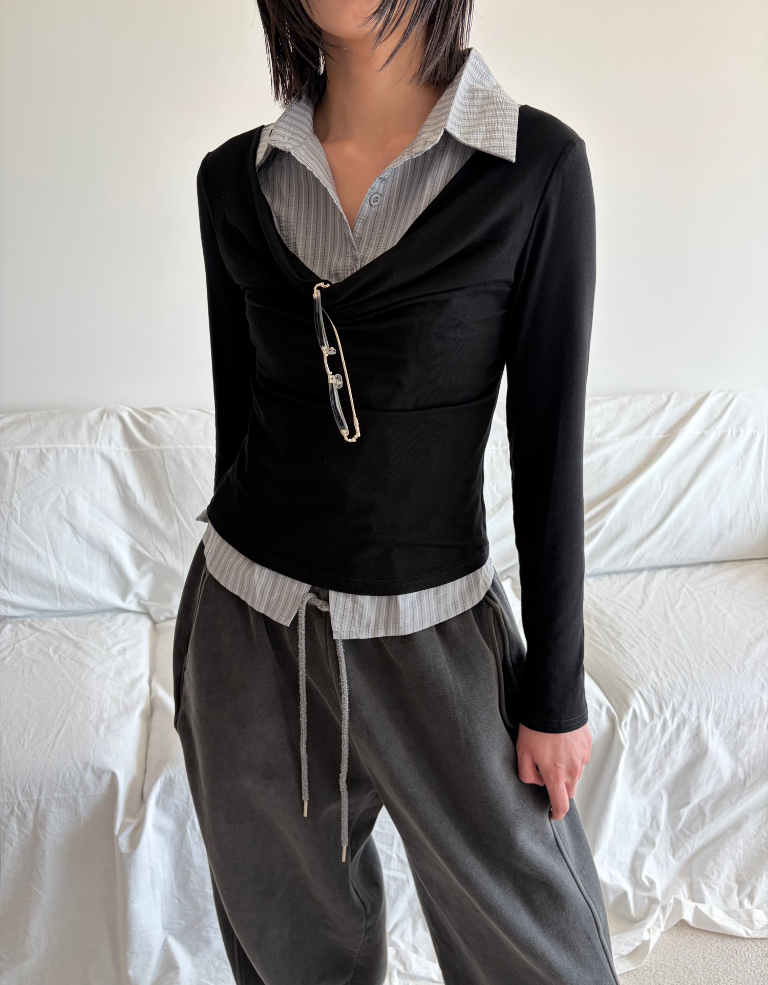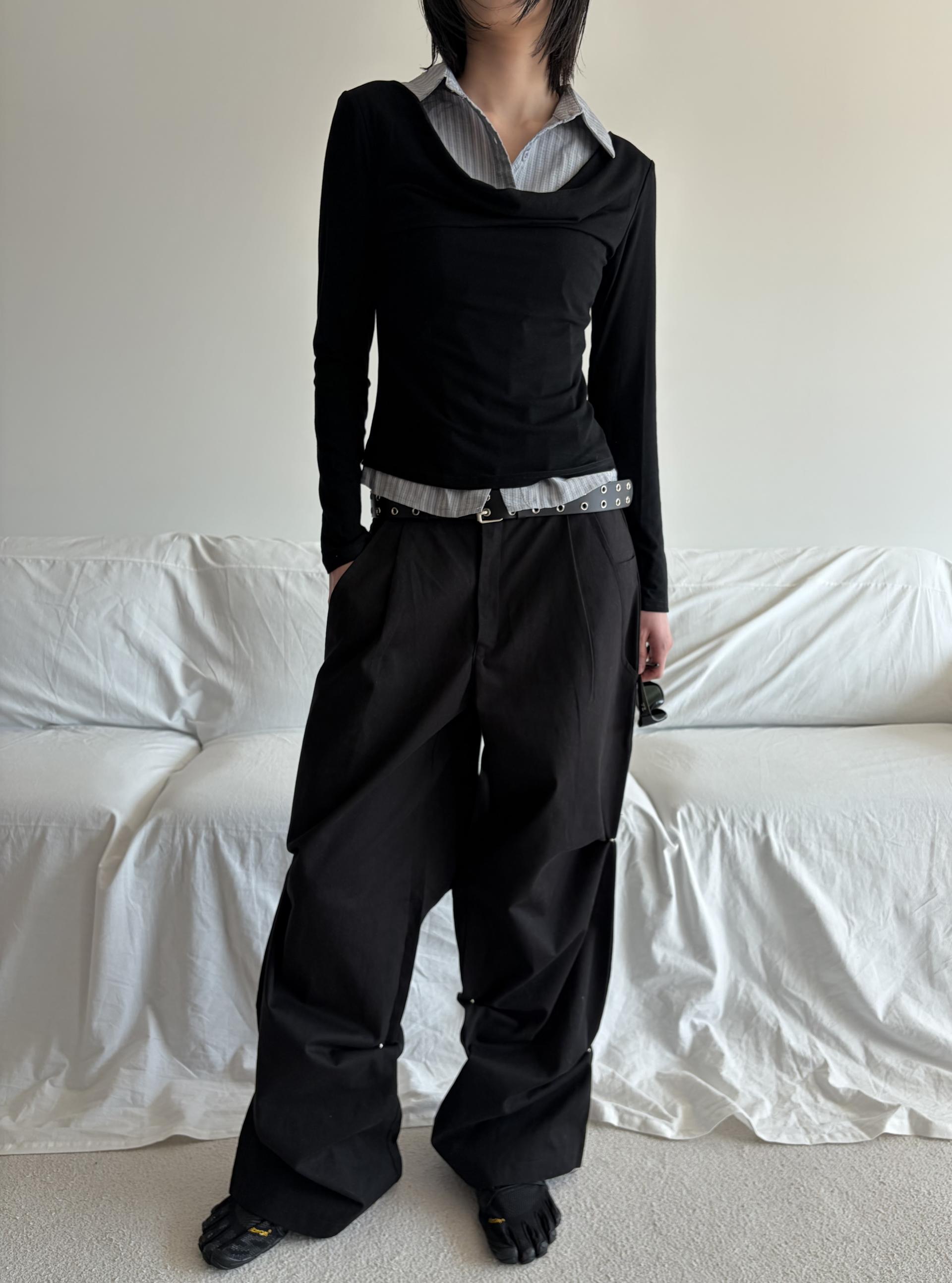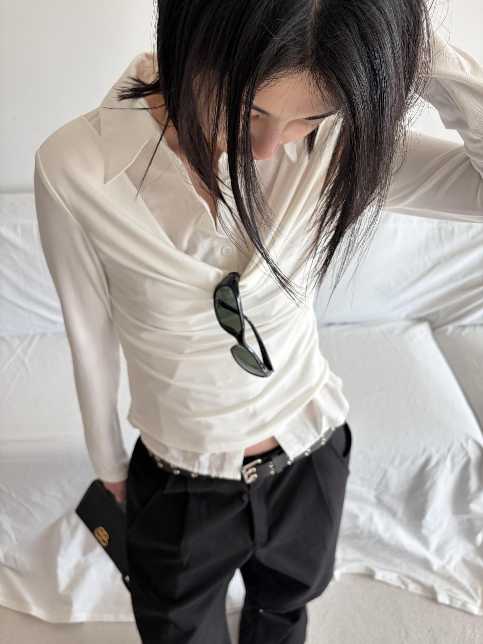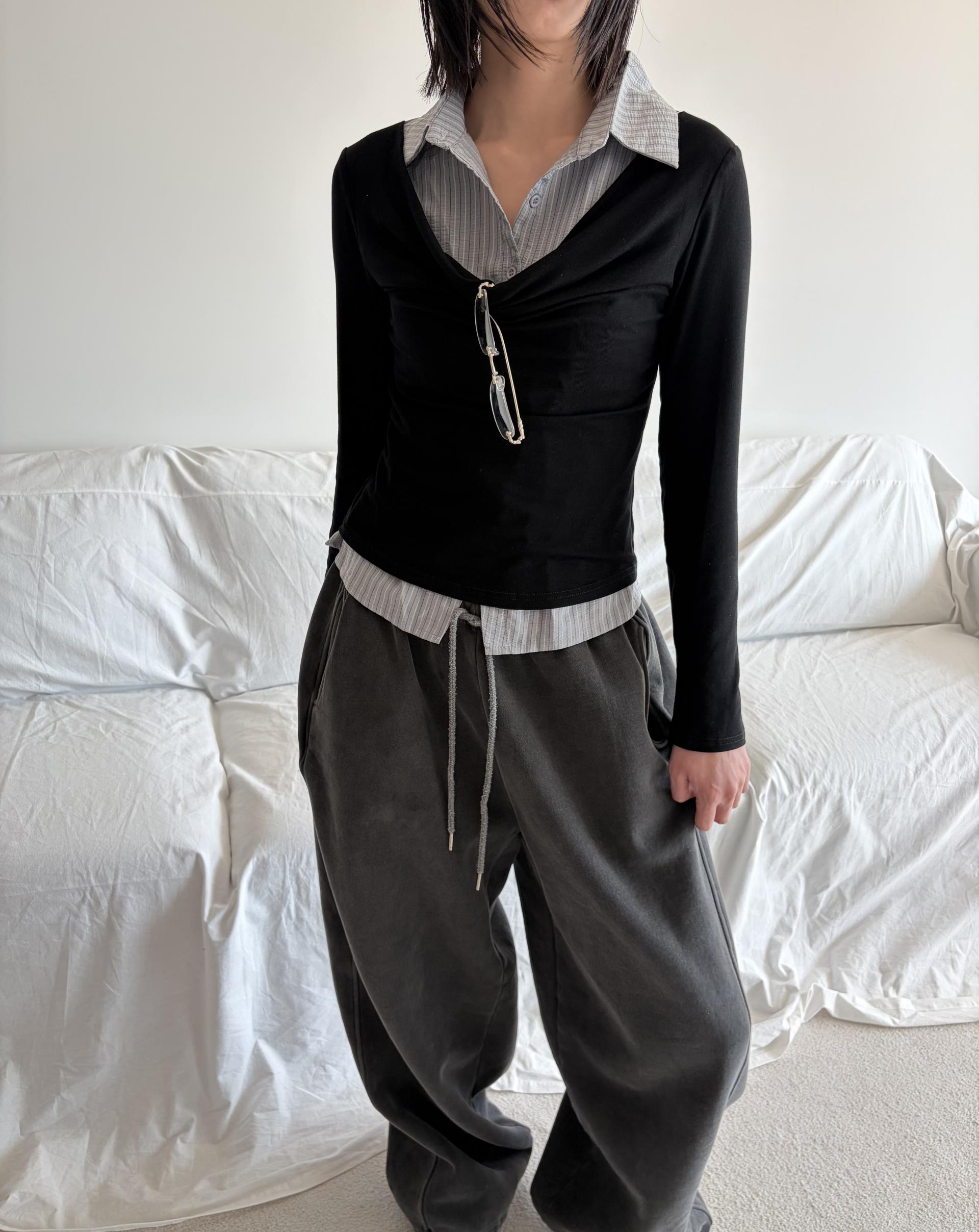 - 겹쳐 입은 듯한 셔츠 카라 디테일로 미니멀한무드와 트렌디함을 동시에