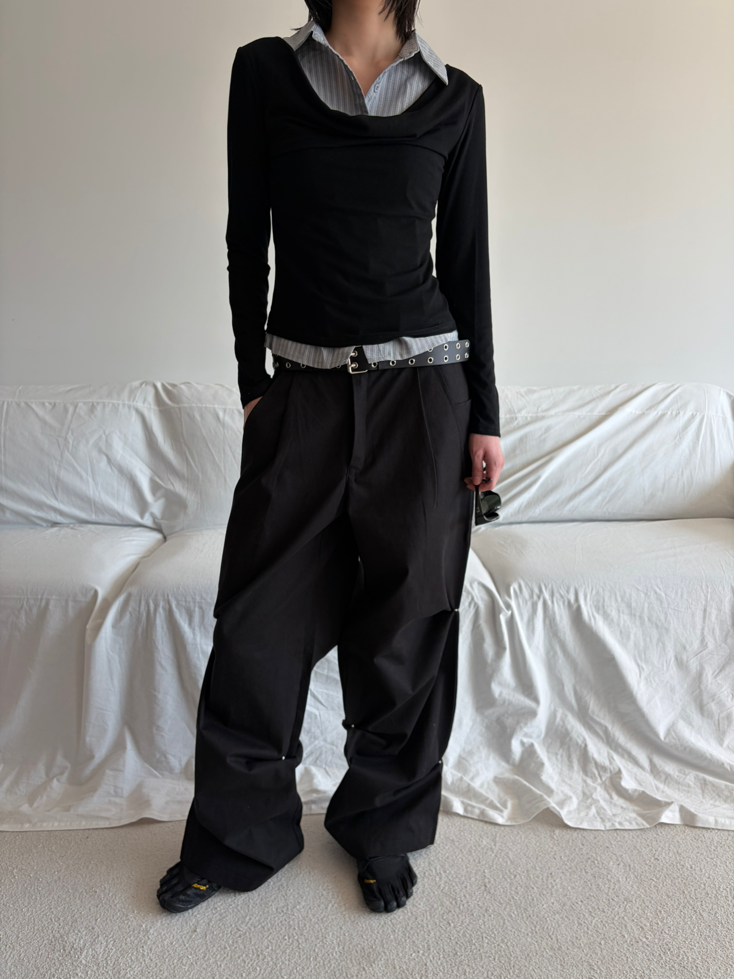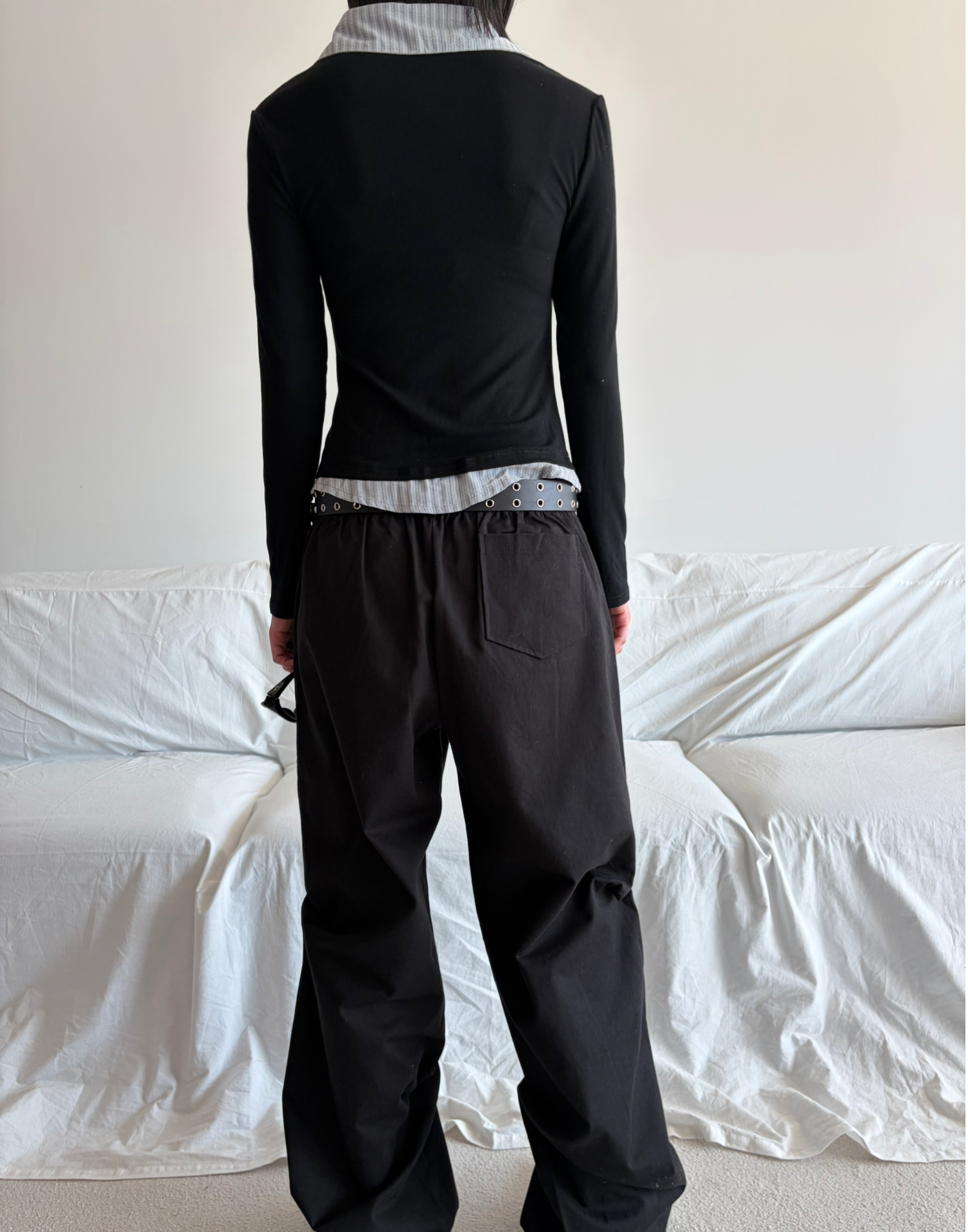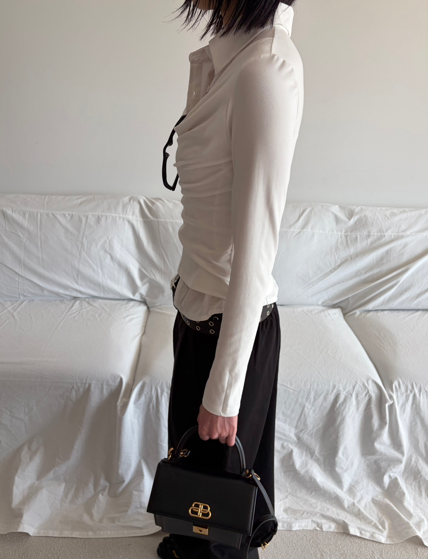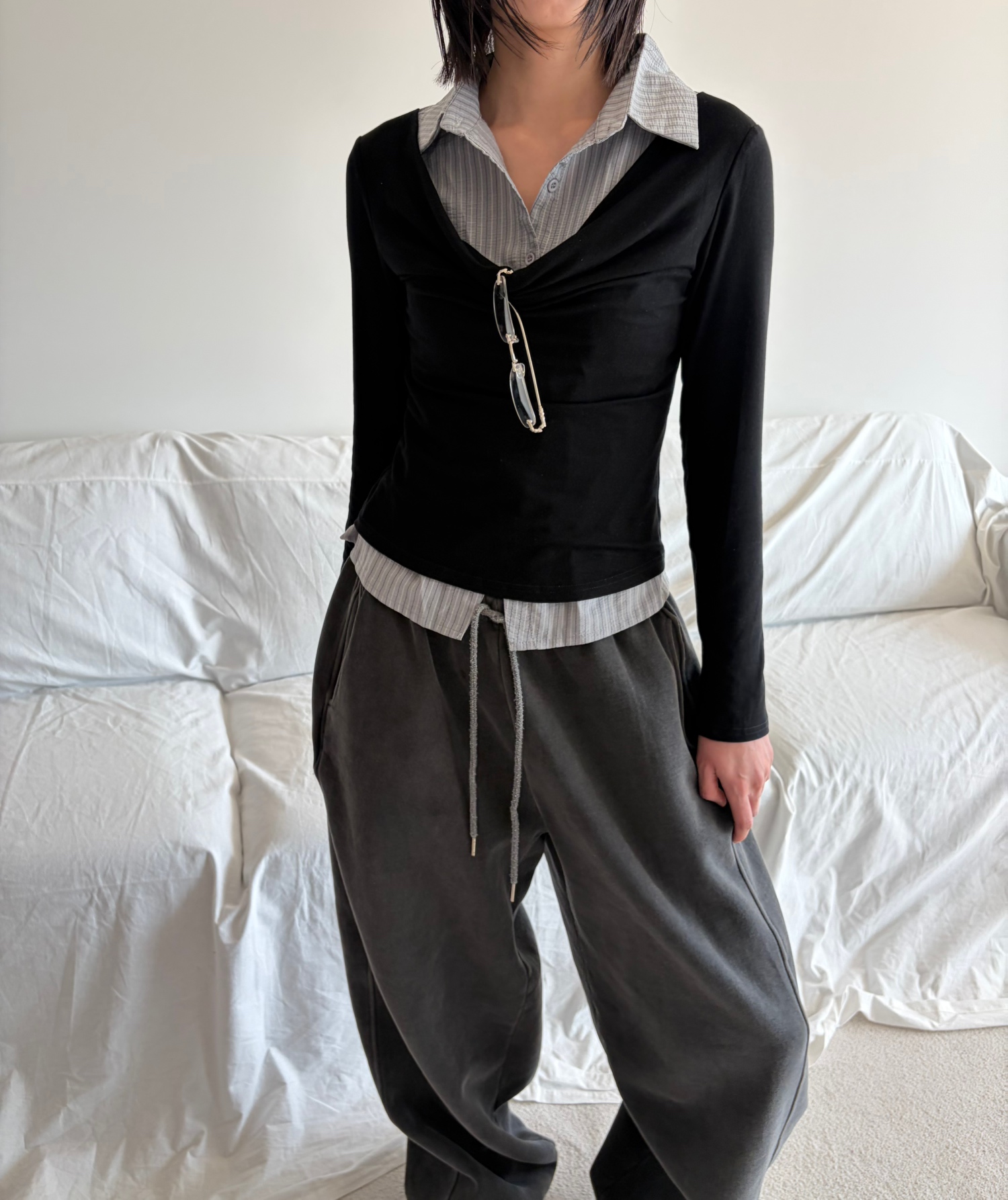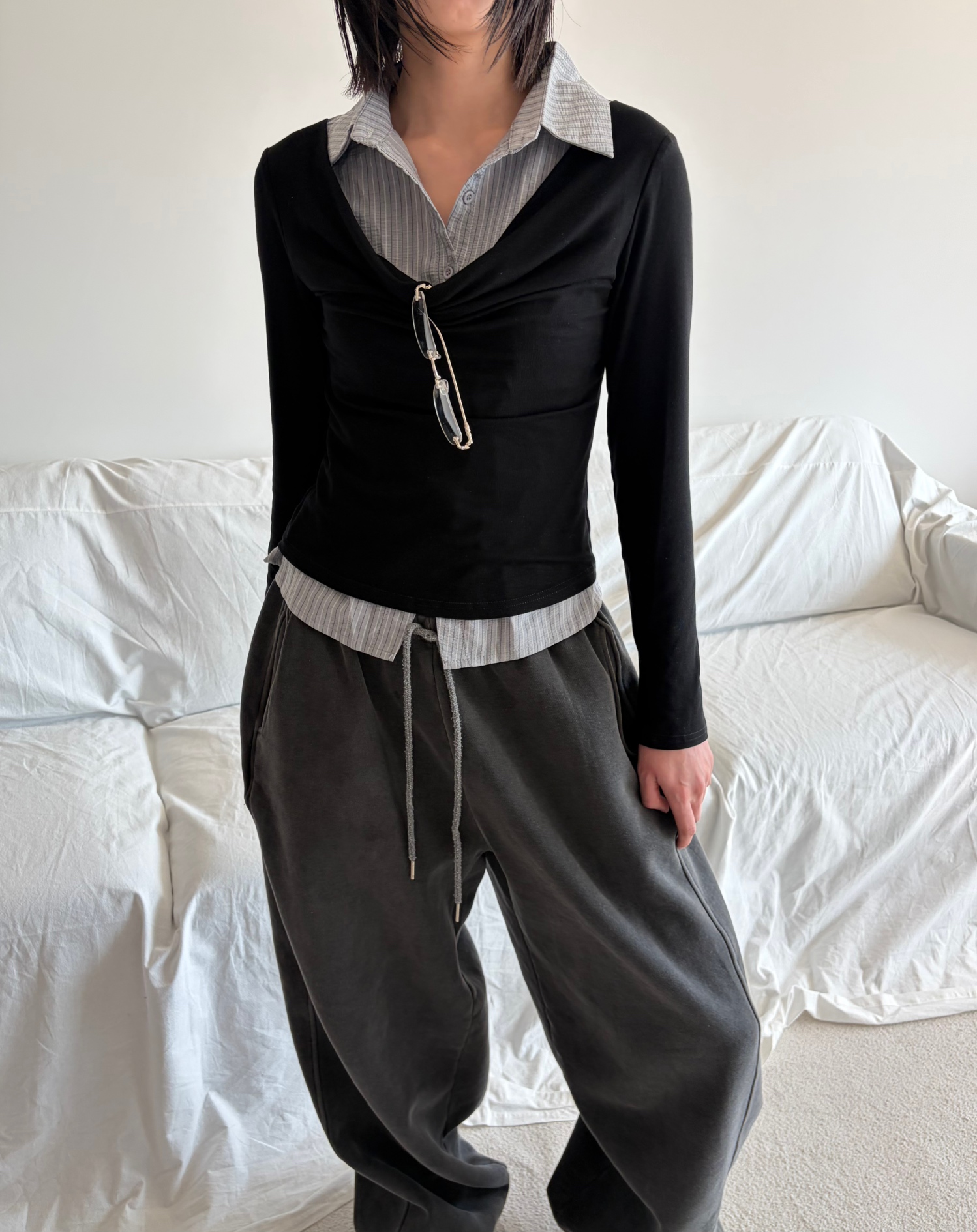 - 겹쳐 입은 듯한 셔츠 카라 디테일로 미니멀한무드와 트렌디함을 동시에