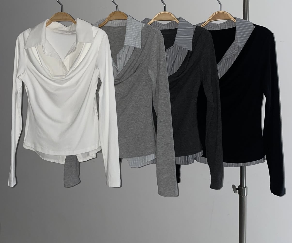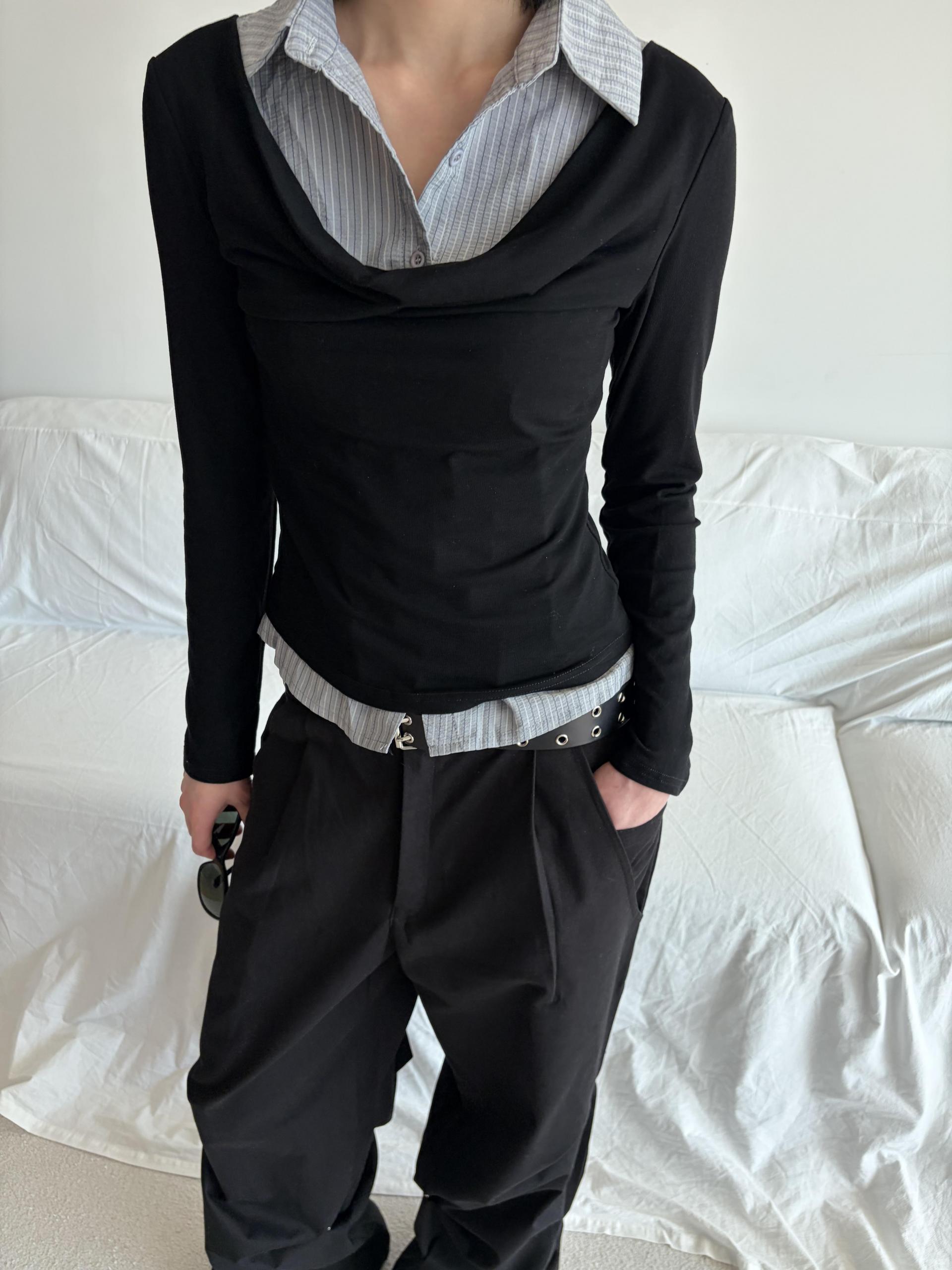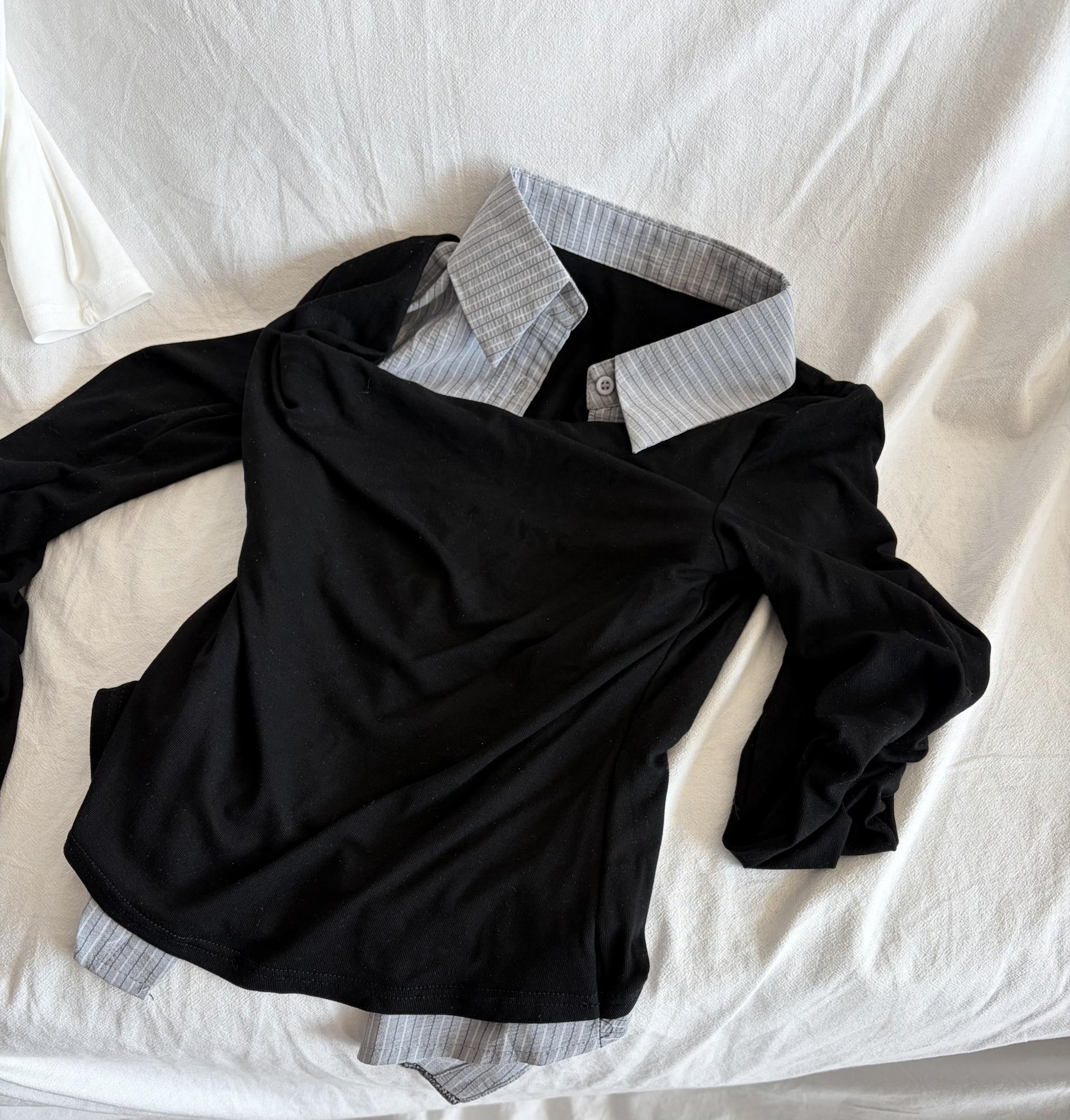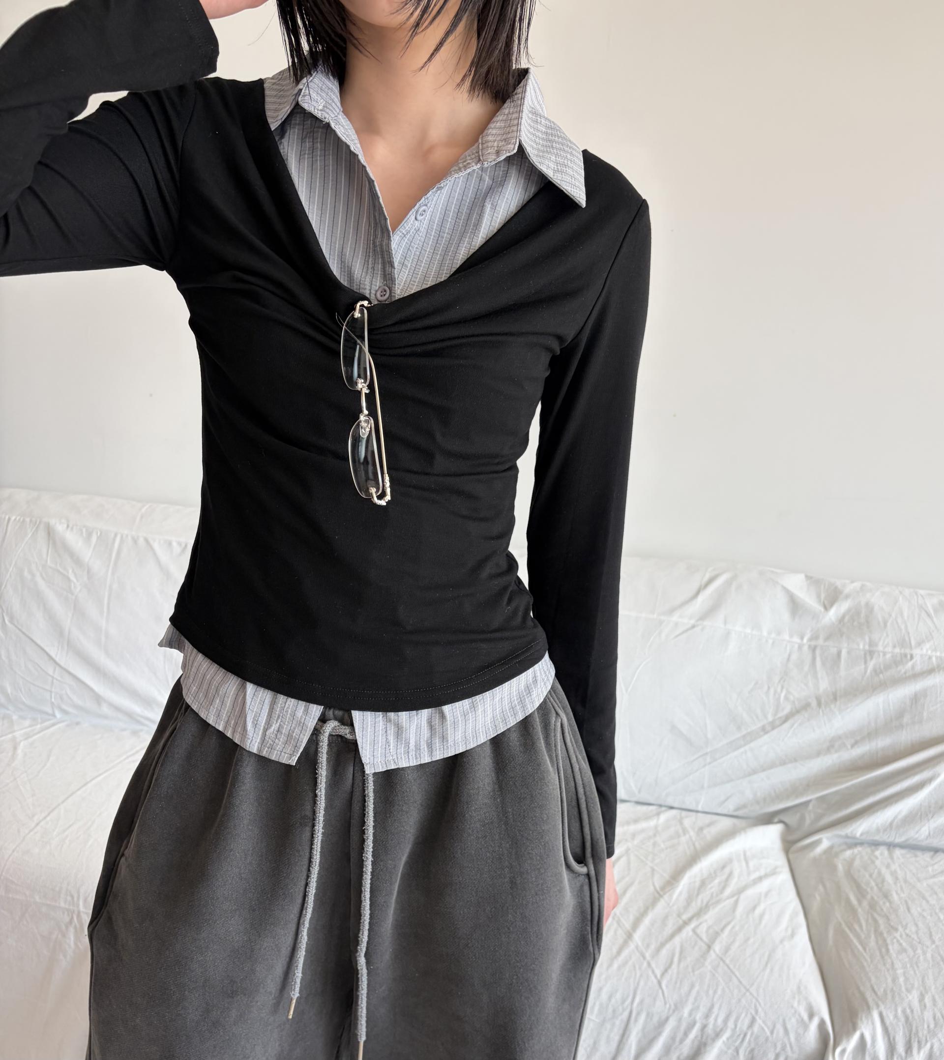 - 티셔츠와 셔츠가 하나로 연결된 이중 레이어드 디자인