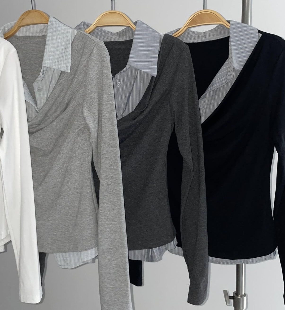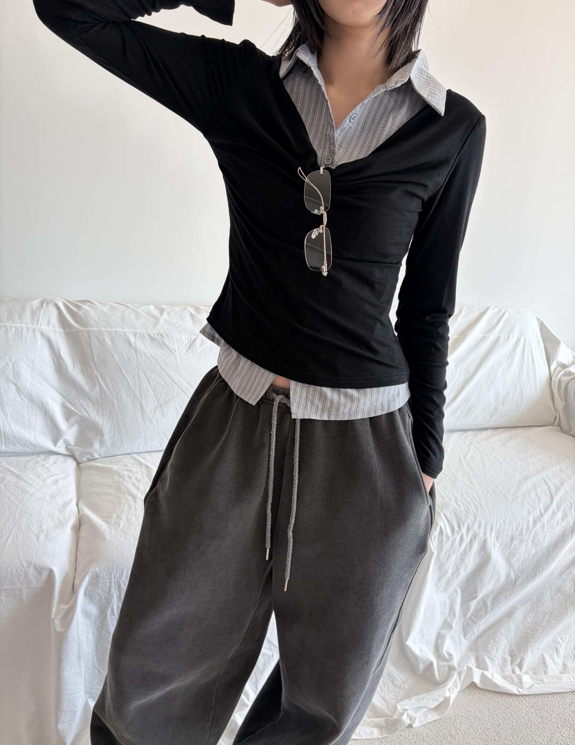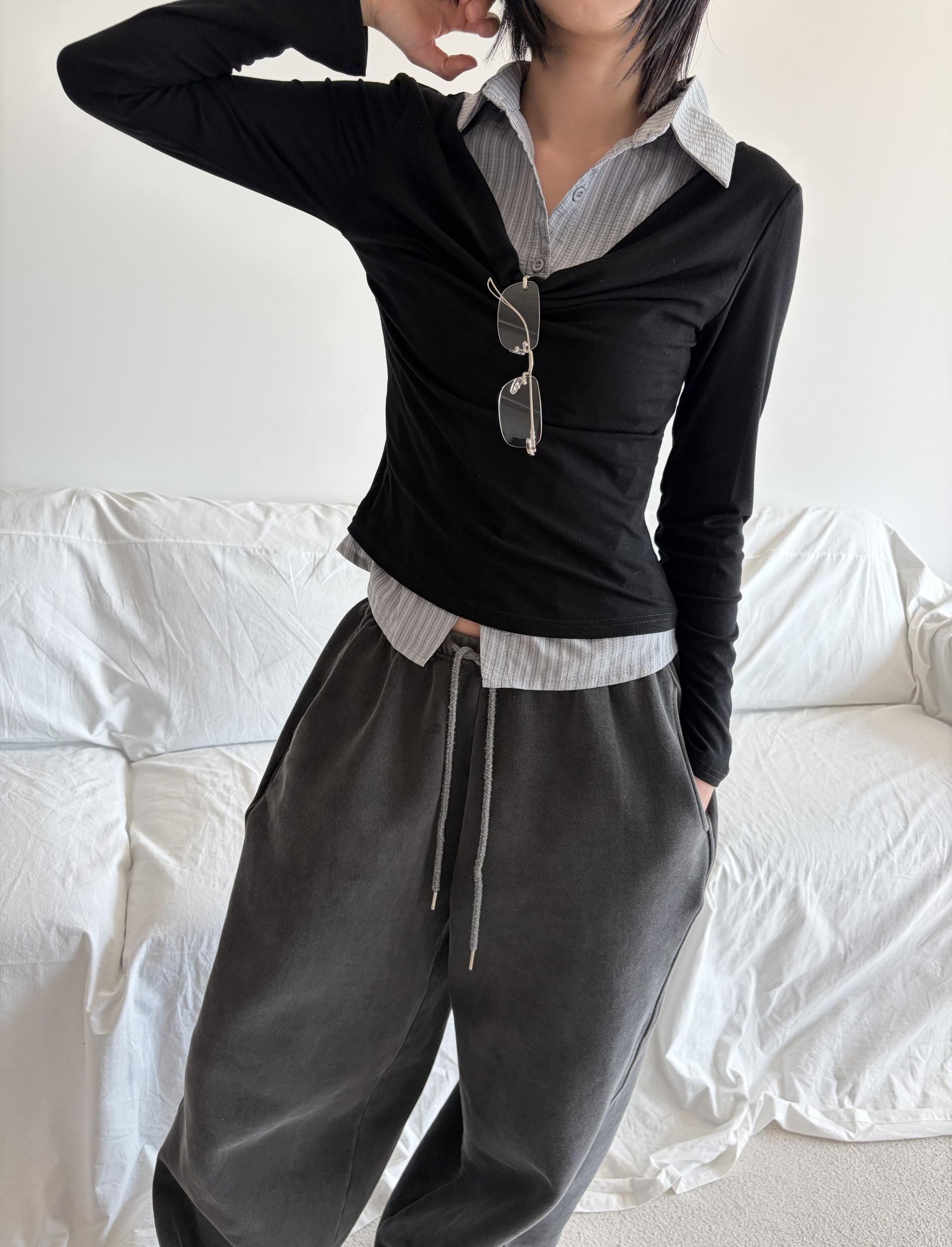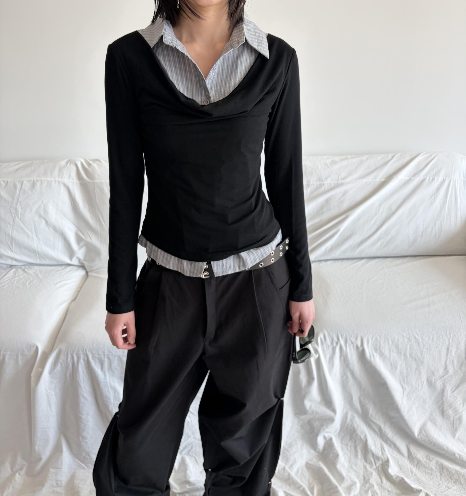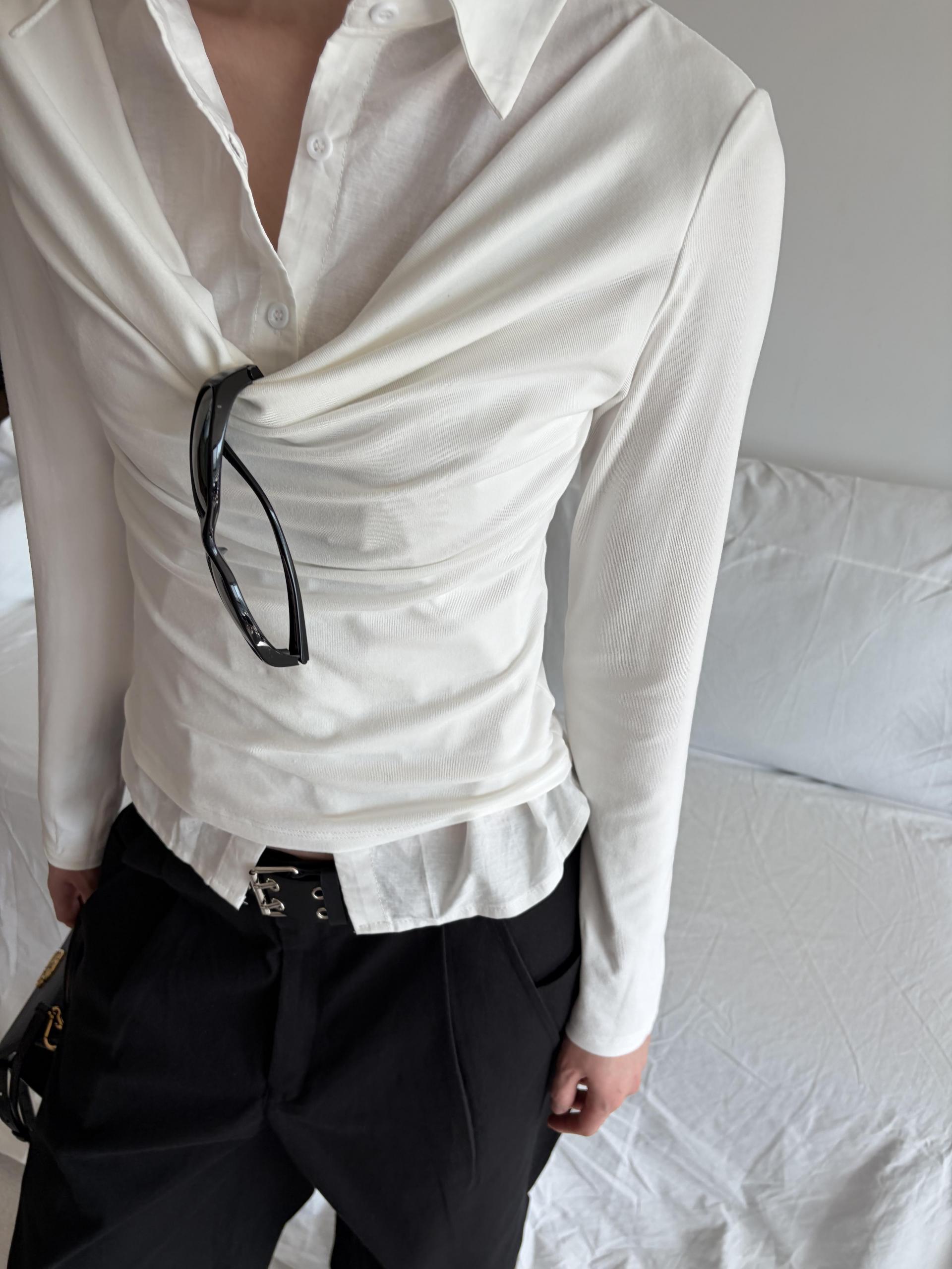 - 티셔츠와 셔츠가 하나로 연결된 이중 레이어드 디자인